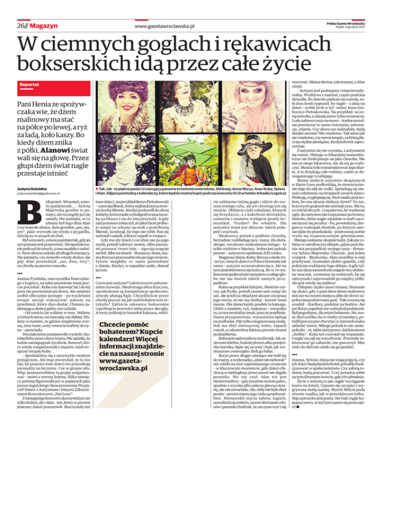 26// Magazyn Polska Gazeta Wrocławska Piątek, 6 grudnia 2013 www.gazetawroclawska.pl W ciemnych goglach i rękawicach bokserskich idą przez całe życie Reportaż Justyna Kościelna [email protected] B yła jesień. Wrzesień, a może październik... – Sylwia Majewska grzebie w pamięci, ale szczegóły już się zatarły. Nie pamięta, w co ubrany był tego dnia Alan iczyświeciłosłońce.Zatogromkie„yes,yes, yes”, jakie wyrwało się wtedy z jej gardła, dźwięczy w uszach do dziś. Był wrzesień, amoże październik, gdy jej syn postanowił przemówić. Niespodziewaniepoliczyłdotrzech,a onaoszalałazradości. Na te słowa czekała 48 długich miesięcy. Nie pamięta, czy świeciło wtedy słońce, ale gdy Alan powiedział „raz, dwa, trzy”, na chwilę na pewno wzeszło. FOT. ANNA GRABOWICZ-PIETRAKOWSKA Pani Henia ze spożywczaka wie, że dżem malinowy ma stać na półce po lewej, a ryż za ladą, koło kaszy. Bo kiedy dżem znika z półki, Alanowi świat wali się na głowę. Przez głupi dżem świat nagle przestaje istnieć bTak, tak - te piękne panie i ci czarujący panowie to bohaterowie tekstu. Od lewej: Anna i Borys, Asia i Kuba, Sylwia i Alan. Zdjęcia pochodzą z kalendarzy, które będzie można kupić podczas koncertu 15.12 w hotelu Arkadia (Legnica) inne dzieci, na przykład Borys Pietrakowski – czteroipółlatek, który najbardziej na świecie kocha Minnie. Kiedyś podszedł doobcej kobiety,któramiaławykaligrafowanąmyszkę na bluzce i się do niej przytulił. A gdy nadjeziorem zobaczył, że jakiś facet próbuje usiąść na własny ręcznik z podobizną Minnie, krzyknął, by tego nie robił. Pan się zaśmiał i usiadł, a Borys wpadł w rozpacz. Gdy ma zły dzień i coś idzie nie po jego myśli, potrafi uderzyć siostrę. Albo pazurami przeorać twarz taty. – Agresją reaguje na ból. Albo na strach – tłumaczy Anna, mama Borysa i przewodniczka po jego świecie. Sylwia mogłaby to samo powiedzieć o Alanie. Kiedyś, w napadzie szału, złamał jej nos. *** Joanna Pyzińska, nauczycielka francuskiego z Legnicy, na takie promienie musi jeszcze poczekać. Kuba ma dziewięć lat i do tej pory nie powiedział ani słowa. Ale ostatnio zrobił olbrzymie postępy – po trzyletniej terapii zaczął wskazywać palcem na przedmiot, który chce dostać. Chmura zasłaniająca słońce jakby ciut zelżała. – Od sześciu lat walimy w mur. Walimy zróżnych stron, raz mocniej, raz słabiej. Walimy w nadziei, że gdzieś znajdziemy wyrwę, mur runie, a my wreszcie trafimy do syna – opowiada. Dwalatatemupostanowiławynieśćchorobę Kuby poza cztery ściany. Nie sądziła, że ludzie zareagują tak życzliwie. Koncert, który wtedy zorganizowali z mężem, miał wesprzeć terapię Kuby. – Spotkaliśmy się z niezwykle ciepłym przyjęciem. Ale mąż stwierdził, że to nie fair, bo przecież inne dzieci też potrzebują pieniędzy na leczenie. I że w grupie siła. Więc postanowiliśmy tę grupę zorganizować – mówi z werwą Joanna. Kilka miesięcy później figurowała już w papierach jako prezes legnickiego Stowarzyszenia Przyjaciół Dzieci z Autyzmem i Innymi Zaburzeniami Rozwojowymi „Dar Losu”. Z następnego koncertu skorzystał już nie tylko Kubuś, ale iAlan – ten, który w pewien jesienny dzień przemówił. Skorzystały też *** Czym jest autyzm? Całościowym zaburzeniem rozwoju. Niedomaga sfera fizyczna, upośledzone są kompetencje społeczne, zmysły płatają figle. Chcielibyście przez chwilę poczuć się jak mali bohaterowie artykułu? Załóżcie rękawice bokserskie i spróbujcie przewlec nitkę przez oko igły. A teraz połknijcie kawałek kaktusa, włóż- Chcecie pomóc bohaterom? Kupcie kalendarz! Więcej informacji znajdziecie na naszej stronie www.gazetawroclawska.pl cie zaklejone taśmą gogle i idźcie do wyznaczonego celu, ale po chwiejącym się moście. Obłóżcie ciało robalami, których się brzydzicie, a z kakofonii dźwięków, szmerów i szumów wyłapcie prosty komunikat. Trudne? No właśnie. Dla autystów świat jest zbiorem takich pułapek i wyzwań. Naukowcy, pytani o podłoże choroby, bezradnie rozkładają ręce. Geny, zła dieta, alergie, wrodzone uszkodzenia mózgu – to tylko niektóre z hipotez. Jedno jest jednak pewne – autyzm to epidemia XXI wieku. Diagnoza Alana, Kuby, Borysa iokoło 20-30 tys. innych dzieci w Polsce brzmiała tak samo – autyzm wczesnodziecięcy. Ale na tym podobieństwa się kończą. Bo w 70-milionowejspołecznościautystówzcałegoglobu nie ma dwóch takich samych przypadków. Kuba na przykład lubi jeść. Niektóre rzeczy, jak frytki, potrafi nawet sam wziąć do ust. Ale jeżeli na obiad jest akurat coś spoza jego menu, to nie ma zmiłuj – karmić musi mama. Dla Alana każdy posiłek to katorga. Chleb z masłem, ryż, makaron – wszystko to, co ma neutralny smak, jeszcze przełknie. Dania przyprawione, wyrazistsze lądują napodłodze. Pije tylko niegazowaną wodę. Sok ma zbyt intensywny kolor, zapach i smak, a i aksamitna faktura pewnie drażni podniebienie. Kubajestnadwrażliwynadźwięk.Jakzadzwoni telefon, huknie piorun albo przejeżdża karetka, łapie się za uszy i kuli, jak wystraszone zwierzątko. Boli go hałas. Borys przez długie miesiące nie tulił się domamy, awyliczanka „idzie rak nieborak” nie robiła na nim najmniejszego wrażenia – w kluczowym momencie, gdy dzieci chichocą w niebogłosy, jemu nawet nie drgała powieka. Nic nie czuł. Alan też jest niedowrażliwy – gdy przetnie nożem palec, spadnie z wysoka albo uderzy głową o ścianę,nieodczuwabólu.Ale,żebyniebyłozbyt prosto–pewne rejony jegociała są nadwrażliwe. Nienawidzi mycia zębów, kąpieli, szorstkich ręczników, nawet obcinanie włosów i paznokci boli tak, że zaczyna wyć i się wyrywać. Mama obcina, tata trzyma, aAlan cierpi. – Autyzm jest podstępny i nieprzewidywalny. Wyzbywa z marzeń, często podcina skrzydła. Bo dziecko pięknie się rozwij