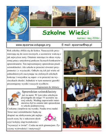 Szkolne Wieści marzec– maj 2016r.. www.spzarow.edupage.org E-mail: [email protected] Rok szkolny zbliża się do końca. Nauczyciele przymierzają się do ocen rocznych, a uczniowie walczą o jak najwyższe noty. Ostatnie miesiące to okres wytężonej pracy umysłowej podczas licznych konkursów i sprawdzianów. Ten najważniejszy sprawdzian pisali szóstoklasiści. Ale szkoła to przecież również przyjemności :)- wycieczki. Odbyło się ich już wiele od jednodniowych zaczynając na zielonych szkołach kończąc i wszystkie są super- o to przecież na wycieczkach chodzi. Jednakże w tym numerze gazetki prezentujemy wyniki waszych wysiłków. Zapraszam do lektury. Sprawdzian szóstoklasisty już za nami. W tym roku szkolnym przystąpiło do niego 75 uczniów naszej szkoły. Według zapowiedzi ministerstwa był to ostatni taki sprawdzian w szkole podstawowej. Czekamy cierpliwie na wyniki. Nauka trwa nadal. Teraz nasi szóstoklasiści będą się skupiać na zdobywaniu jak najlepszych ocen, by z sukcesem ukończyć kolejny etap kształcenia i "wyruszyć w świat". Czeka na nich gimnazjum. Życzymy wytrwałości i motywacji! Pierwszy Dzień Wiosny pod hasłem "Stop przemocy i agresji słownej" Pierwszy dzień Wiosny w naszej szkole został zorganizowany pod hasłem "Stop przemocy i agresji słownej". po pierwszej lekcji wszyscy uczniowie klas 4 - 6 przeszli na salę widowiskowo - sportową, gdzie Samorząd Uczniowski przygotował "potyczki międzyklasowe". Pierwszą konkurencją był quiz pt. "Jeden z dziesięciu", podczas którego przedstawiciele poszczególnych klas musieli wykazać się wiedzą na temat kultury słowa i poprawności językowej. Kolejną rywalizację stanowiły scenki teatralne pod hasłem "Stop przemocy i agresji słownej". Każda klasa zaprezentowała własne, oryginalne scenariusze, a młodzi aktorzy mogli pochwalić się swoimi umiejętnościami aktorskimi oraz twórczym i kreatywnym podejściem do tematu. Po przerwie jury w składzie: pani wicedyrektor Anna Zoła, pani Agnieszka Kosińska i pani Wiesława Elster ogłosiło werdykt. III miejsce zajęła klasa 5a, II miejsce przypadło klasie 5c, I miejsce zajęła klasa 5b. Ostatnią atrakcją tego dnia były warsztaty ZUMBY, które odbyły się na boisku lekkoatletycznym, w których brali udział zarówno uczniowie, jak i nauczyciele i rodzice. Ten dzień był naprawdę wyjątkowy. Uwrażliwił uczniów na empatię i szacunek do drugiego człowieka, na postawę wolną od agresji i przemocy słownej. Dostarczył on wszystkim niezapomnianych przeżyć i pozytywnej energii na nadchodzącą wiosnę 2016. Str. 2 Szkolne Wieści „Wiosna Wierszem Kwitnąca” W Międzyszkolnym Konkursie Recytatorskim „Wiosna Wierszem Kwitnąca”, który odbył się w Szkole Podstawowej im. Anny Jenke w Mrowinach. Wśród 50 uczestników byli uczniowie ze szkół i przedszkoli z terenu gmin Jaworzyna Śląska, Żarów i Świdnica. Nasi koledzy zdobyli: w kategorii klas 0 - 1 II miejsce- Gabriel Stawski w kategorii klas 2 - 3 I miejsce- Anna Antczak Klasy 0-I II miejsce: Gabriel Stawski (Szkoła Podstawowa im. Jana Brzechwy w Żarowie) Klasy II-III I miejsce: Anna Antczak (Szkoła Podstawowa im. Jana Brzechwy w Żarowie) Dzień Czekolady 12 kwietnia obchodziliśmy po raz kolejny Dzień Czekolady w bibliotece. Bardzo słodki to był dzień, ponieważ każdy czytelnik mógł skosztować owoców w czekoladzie oraz rozmaitych wyrobów czekoladowych w czasie "słodkiego wypożyczania". 174 uczniów wypożyczyło w sumie 230 książek! Kolejny numer Obyśmy umieli czerpać taką przyjemność z czytania książek jaką czerpiemy jedząc słodkości:-) Bardzo Wam tego życzymy! Niektórzy z naszych uczniów osiągnęli taki "poziom wtajemniczenia" , z czego jesteśmy bardzo, ale to bardzo zadowolone. Dziękujemy organizatorom "słodkiego wypożyczania" za energię i niezastąpioną pomoc! Beata Jurczak Agnieszka Kosińska Str. 3 Gminne Biegi Przełajowe Dnia 22.04. uczniowie kl.I d wzięli udział w gminnych biegach przełajowych , które miały miejsce przy Orliku w Żarowie. Dziesięć dziewczynek i sześciu chłopców próbowało swoich sił w zawodach.. Karol Nartowski wywalczył II miejsce,. Jesteśmy z niego bardzo dumni. Uczniowie pierwszy raz mieli okazję wziąć udział w takich zawodach. Dzięki temu stali się bogatsi w nowe doświadczenia. Joanna Karpińska "Wiosenne Kapelusze" W jedenastej już edycji wystartowało 46 uczniów z klas 0-III. - Prace przygotowane przez uczestników wzbudzają podziw i zachwyt wśród oglądających wystawę pokonkursową, którą można podziwiać w budynku szkoły przy ul. Armii Krajowej 58 w Żarowie. Serdecznie wszystkim dziękujemy za ogromny wysiłek włożony w przygotowanie prac i gratulujemy małym projektantom pomysłu - mówią Bożena Zajko-Ignatowicz i Małgorzata Nowak organizatorki konkursu "Wiosenne Kapelusze". Wyniki konkursu "Wiosenne Kapelusze": I miejsce: Kinga Kaczmarek kl. Ic i Andrzej Nowak kl. IIb II miejsce: Julia Banach kl. Ie i Maja Grzybek kl. IIf III miejsce: Dawid Smejda kl. Ic, Maja Kołodka kl. IIb Wyróżnienia: Alicja Gnutek kl. 0b, Hanna Kubasiewicz kl. Ia, Zofia Górka kl. Ib, Franciszek Mytych kl. Ib, Patrycja Czuba kl. Id, Zuzanna Kania kl. IIa, Kinga Reruch kl. IIc, Zofia Podolak kl. IIf, Milena Kondratowicz kl. IIId. Str. 4 Szkolne Wieści XXIII Gminny Konkurs Ortograficzny Dnia 22 marca 2016 roku w Szkole Podstawowej im. Jana Brzechwy w Żarowie odbył się XXIII Gminny Konkurs Ortograficzno – Gramatyczny. Wzięło w nim udział 30 uczniów klas drugich i trzecich szkół podstawowych naszej gminy. W kategorii uczniów klas drugich czołowe pozycje zajęli: Wyniki konkursu ortograficzno-gramatycznego Kategoria klas II: I miejsce: Hanna Niemiec II miejsce: Maksymilian Górka, Dawid Haraszczuk, Lena Król III miejsce: Jan Molecki, Oliwia Brańka Kategoria klas III: I miejsce: Oktawian Żydek II miejsce: Kajetan Kwiecień III miejsce: Krystian Kuriata,