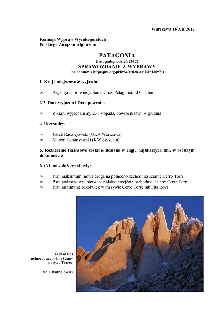 Warszawa 16 XII 2012 Komisja Wypraw Wysokogórskich Polskiego Związku Alpinizmu PATAGONIA (listopad/grudzień 2012) SPRAWOZDANIE Z WYPRAWY (na podstawie http://pza.org.pl/kww/article.acs?id=136974) 1. Kraj i miejscowość wyjazdu. • Argentyna, prowincja Santa Cruz, Patagonia, El Chalten 2-3. Data wyjazdu i Data powrotu. • Z kraju wyjechaliśmy 23 listopada, powróciliśmy 14 grudnia 4. Uczestnicy. • • Jakub Radziejowski (UKA Warszawa) Marcin Tomaszewski (KW Szczecin) 5. Rozliczenie finansowe zostanie dosłane w ciągu najbliższych dni, w osobnym dokumencie 6. Celami założonymi były: • • • Plan maksimum: nowa droga na północno zachodniej ścianie Cerro Torre Plan podstawowy: pierwsze polskie przejście zachodniej ściany Cerro Torre Plan minimum: cokolwiek w masywie Cerro Torre lub Fitz Roya Zachodnie i północno zachodnie ściany masywu Torres fot. J.Radziejowski 7. Cele zrealizowane – relacja, kalendarium. Po 46 godzinach podróży lotniczo-autobusowej, pojawiliśmy się w El Chalten 24 listopada pod wieczór. Prognozy, które sprawdzaliśmy przed wyjazdem potwierdzają się na miejscu i po dwóch nocach na miejscu – wyruszamy w góry 26 listopada. Jako, że okno pogodowe ma trwać maksymalnie 2 dni, decydujemy się na wspinaczkę drogą Ferrariego (Ragni Route), zachodnią ścianą Cerro Torre i na to by w akcji przyjrzeć się dziewiczemu potencjałowi północno zachodniej ściany. Cały czas w niepogodzie podchodzimy do biwaku Niponino, na lodowcu Torre, umiejscowionego poniżej El Mocho czyli niejako pod wschodnią wystawą Cerro Torre. Cała noc pada i wieje, wtorkowy poranek przynosi jednak wyraźna poprawę. Teraz już tylko wieje. Po południu 27 listopada przenosimy się od zachodnią ścianę Cerro Torre, przez Col Standhardt. Tam rozstawiamy namiot i biwakujemy. 28 listopada, około 2:40 w nocy starujemy z Circo de los Altares, by po nieco ponad 12,5 godzinach (licząc prosto z lodowca) cieszyć się szczytem. Wspinaczka przebiegała bez zakłóceń, droga to (poza dwoma odcinkami na podejściu) piękny ciąg mniej więcej jednostajnych trudności lodowych (70/80°) z kilkoma trudniejszymi wyciągami (w tym jeden 90/95°). Po kolejnych 6 godzinach jesteśmy z powrotem w namiocie. Następnego dnia (tj 29 XI) , pakujemy sprzęt i namiot i startujemy około 9 rano, by po 22.30 w nocy, po 40 km marszu - najpierw lodowcem, a następnie przez Paso del Viento, góry i doliny - znaleźć się w Chalten. Ten marsz stał się przyczyną szeregu kontuzji, odparzeń i poparzeń. Wiedzieliśmy, że przez kilka dni będziemy musieli się regenerować. Wspinaczka na zachodniej ścianie Cerro Torre fot. J.Radziejowski Podczas wspinaczki uważnie przyjrzeliśmy się potencjalnej nowej linii. Niestety potencjalną linią mocno się sypało, i to znacznie bardziej intensywnie niż na zachodniej ścianie, gdzie kilkukrotnie uderzeni zostaliśmy spadającymi bryłami lodu. W obecnej sytuacji uznaliśmy linię po prostu za zbyt niebezpieczną. W dniach 30 listopada – 4 grudnia pogoda jest typowo patagońska, co sprzyja naszej regeneracji. Niestety, kolejne okno pogodowe przychodzi trochę za szybko (nie zdążyliśmy się w pełni wykurować) i ma być dość krótkie (jeden dzień). Stąd nie ma nawet mowy o próbach na jakiejkolwiek nowej drodze 4 grudnia wychodzimy w kierunku Paso Superior odkładając decyzję, co do ostatecznego celu, do momentu kiedy ujrzymy z bliska ściany. Potwierdzają się informacje o opadzie śniegu. Decydujemy się na wspinaczkę drogą Whillans–Cochrane na Aguja Poincenot, zakładając, że z jej trudnościami powinniśmy sobie poradzić nawet w warunkach zimowych. 5 grudnia około godziny 4 rano startujemy z Paso Superior. Przewodnikowe trudności oscylują wokół stopnia M4/5, skała 5+, 550m. Jednak w tych okolicznościach trudności drogi były, być może, nieco większe niż M6, a wspinaczka dostarczyła emocji i walki z patagońskim żywiołem. Całą drogę wspinaliśmy się w rakach i z dziabami. Na szczyt dotarliśmy po niecałych 9 godzinach od wyjścia z namiotu na Paso Superior. Po kolejnych 5 godzinach byliśmy z powrotem na przełęczy. Warunki były trudne, ale satysfakcja z kolejnego szczytu duża. U góry górna część drogi Whillansa na Aguja Poincenot, po prawej mikst na przełamaniu ściany (fot. J.Radziejowski/M.Tomaszewski) Sporo świeżego śniegu w ścianie oraz zimowe temperatury i wiatr sprawiają, że wiele zespołów zrezygnowało z działania tego dnia. 6 grudnia schodzimy do El Chalten z nadzieją na jeszcze jedno okno pogodowe przed wyjazdem. Niestety kolejne dni w Chalten, oraz regularne (3 razy na dobę) weryfikowanie prognoz pogody sprawiają, że nie widzimy perspektyw na wspinaczkę przed terminem, w którym musimy opuścić Argentynę. Wszystkie prognozy dość jednoznacznie pokazują na przynajmniej 10-14 dniowe załamanie pogody, silny wiatr i opady śniegu. W tej sytuacji decydujemy się na powrót do kraju. 8. Uwagi i podsumowanie Cel wyjazdu został zrealizowany – udało nam się dokonać pierwszego polskiego przejścia zachodniej ściany Cerro Torre Drogą Ferrariego. Jednocześnie jest to pierwsze polskie wejście klasyczne na szczyt oraz 23-24 wejście tą ścianą w ogóle. Opis przewodnikowy trudności: M4, 90˚; zastane trudności lodowe do 90/95°, Czas wejścia ok. 12,5h (licząc od wyjścia z namiotu, z poziomu lodowca ok. 1400 m (wg naszego GPS) do 3102m – czyli ok. 1700 m przewyższenia). Jaka jest długość drogi trudno określić – prawdopodobnie ok. 1200 m wspinania (zgodnie z wcześniejszymi schematami drogi Ferrariego). Przewyższenie od Przełęczy Nadziei do szczytu - 600m – stąd niektórzy liczą czasy wejścia, wspinanie jednak zaczyna się także poniżej przełęczy, na podejściu, w tym około 150 metrów lodu do 70° i 120 metrów niedużych trudności mikstowych. Od Przełęczy Nadziei wspinaliśmy się prawdopodobnie około 8-8,5h. W naszej opinii Droga F