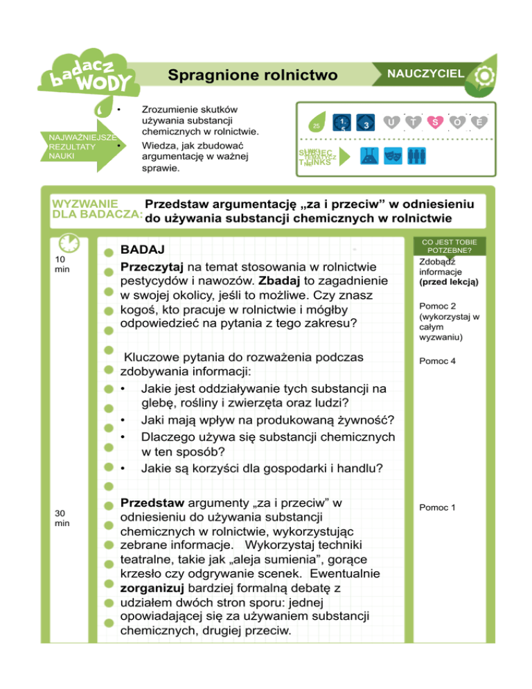 Spragnione rolnictwo • NAJWAŻNIEJSZE • REZULTATY NAUKI Zrozumienie skutków używania substancji chemicznych w rolnictwie. Wiedza, jak zbudować argumentację w ważnej sprawie. NAUCZYCIEL 1. 5 3 U T S O E LINKI SUBJEC TEMATYCZ TNE LINKS WYZWANIE Przedstaw argumentację „za i przeciw” w odniesieniu DLA BADACZA: do używania substancji chemicznych w rolnictwie 10 min BADAJ Przeczytaj na temat stosowania w rolnictwie pestycydów i nawozów. Zbadaj to zagadnienie w swojej okolicy, jeśli to możliwe. Czy znasz kogoś, kto pracuje w rolnictwie i mógłby odpowiedzieć na pytania z tego zakresu? Kluczowe pytania do rozważenia podczas zdobywania informacji: • Jakie jest oddziaływanie tych substancji na glebę, rośliny i zwierzęta oraz ludzi? • Jaki mają wpływ na produkowaną żywność? • Dlaczego używa się substancji chemicznych w ten sposób? • Jakie są korzyści dla gospodarki i handlu? 30 min Przedstaw argumenty „za i przeciw” w odniesieniu do używania substancji chemicznych w rolnictwie, wykorzystując zebrane informacje. Wykorzystaj techniki teatralne, takie jak „aleja sumienia”, gorące krzesło czy odgrywanie scenek. Ewentualnie zorganizuj bardziej formalną debatę z udziałem dwóch stron sporu: jednej opowiadającej się za używaniem substancji chemicznych, drugiej przeciw. CO JEST TOBIE POTZEBNE? Zdobądź informacje (przed lekcją) Pomoc 2 (wykorzystaj w całym wyzwaniu) Pomoc 4 Pomoc 1 CO JEST TOBIE POTZEBNE? DZIAŁAJ 30 min Zaprezentuj zebrane informacje w formie wizualnej, wieszając tablicę „Za substancjami chemicznymi czy przeciwko? Ty decydujesz!” w widocznym miejscu w szkole. Udostępnij innym uczniom i osobom dorosłym możliwość dodawania do tablicy komentarzy i opinii (np. doklejając karteczki z uwagami). Pamiętaj, aby poinformować innych o możliwości wzięcia udziału w debacie na apelu szkolnym lub w gazetce. Policz, ile osób zobaczyło tablicę. Policz, ile osób wyraziło swoją opinię na temat treści zamieszczonych na tablicy, np. przyklejając karteczkę z uwagami. Pamiętaj o napisaniu bloga i zamieszczeniu zdjęcia tablicy. Materiały do przygotowania wystawy kolorowy papier, etykiety itp. BADAJ DALEJ Badaj dalej te substancje chemiczne z naukowego punktu widzenia. Jak właściwie działają? Z jakiej materii powstają? Wykonaj arkusze zawierające fakty na temat każdej substancji chemicznej.
