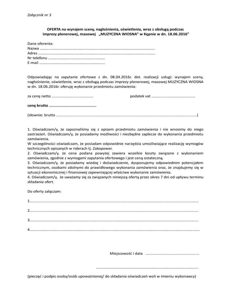 Załącznik nr 3 OFERTA na wynajem sceny, nagłośnienia, oświetlenia, wraz z obsługą podczas imprezy plenerowej, masowej „MUZYCZNA WIOSNA” w Kępnie w dn. 18.06.2016” Dane oferenta: Nazwa ……………………………………………………………………………………………………… Adres ……………………………………………………………………………………………………….. Nr telefonu …………………………………………………. E-mail …………………………………………………………. Odpowiadając na zapytanie ofertowe z dn. 08.04.2016r. dot. realizacji usługi: wynajem sceny, nagłośnienie, oświetlenie, wraz z obsługą podczas imprezy plenerowej, masowej MUZYCZNA WIOSNA w dn. 18.06.2016r. oferuję wykonanie przedmiotu zamówienia: za cenę netto ….................................... podatek vat …...................................... cenę brutto …....................................... (słownie: brutto …................................................................................................................................) 1. Oświadczam/y, że zapoznaliśmy się z opisem przedmiotu zamówienia i nie wnosimy do niego zastrzeżeń. Oświadczam/y, że posiadamy możliwości i niezbędne zaplecze do wykonania przedmiotu zamówienia. W szczególności oświadczam, że posiadam odpowidnie narzędzia umożliwiające realizację wymogów technicznych opisanych w riderach tj. Zakopower. 2. Oświadczam/y, że cena podana powyżej zawiera wszelkie koszty związane z wykonaniem zamówienia, zgodnie z wymogami zapytania ofertowego i jest ceną ostateczną. 3. Oświadczam/y, że posiadamy wiedzę i doświadczenie, dysponujemy odpowiednim potencjałem technicznym, osobami zdolnymi do prawidłowego wykonania zamówienia oraz, że znajdujemy się w sytuacji ekonomicznej i finansowej zapewniającej właściwe wykonanie zamówienia. 4. Oświadczam/y, że uważamy się za związanych niniejszą ofertą przez okres 7 dni od upływu terminu składania ofert. Do oferty załączam: 1............................................................................................................................................................. 2............................................................................................................................................................. 3………………………………………………………………………………………………………………………………………………………. 4.………………………………………………………………………………………………………………………………………………………. Miejscowość i data .................................................. ………………………………………………………………………………………….. (pieczęć i podpis osoby/osób upoważnionej/ do składania oświadczeń woli w imieniu wykonawcy)