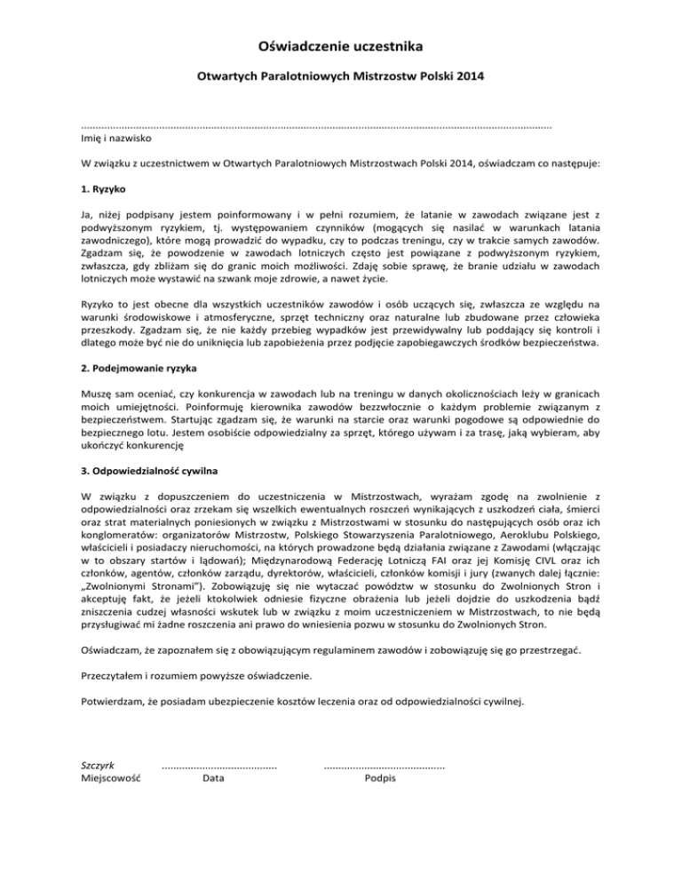Oświadczenie uczestnika Otwartych Paralotniowych Mistrzostw Polski 2014 ................................................................................................................................................................... Imię i nazwisko W związku z uczestnictwem w Otwartych Paralotniowych Mistrzostwach Polski 2014, oświadczam co następuje: 1. Ryzyko Ja, niżej podpisany jestem poinformowany i w pełni rozumiem, że latanie w zawodach związane jest z podwyższonym ryzykiem, tj. występowaniem czynników (mogących się nasilać w warunkach latania zawodniczego), które mogą prowadzić do wypadku, czy to podczas treningu, czy w trakcie samych zawodów. Zgadzam się, że powodzenie w zawodach lotniczych często jest powiązane z podwyższonym ryzykiem, zwłaszcza, gdy zbliżam się do granic moich możliwości. Zdaję sobie sprawę, że branie udziału w zawodach lotniczych może wystawić na szwank moje zdrowie, a nawet życie. Ryzyko to jest obecne dla wszystkich uczestników zawodów i osób uczących się, zwłaszcza ze względu na warunki środowiskowe i atmosferyczne, sprzęt techniczny oraz naturalne lub zbudowane przez człowieka przeszkody. Zgadzam się, że nie każdy przebieg wypadków jest przewidywalny lub poddający się kontroli i dlatego może być nie do uniknięcia lub zapobieżenia przez podjęcie zapobiegawczych środków bezpieczeństwa. 2. Podejmowanie ryzyka Muszę sam oceniać, czy konkurencja w zawodach lub na treningu w danych okolicznościach leży w granicach moich umiejętności. Poinformuję kierownika zawodów bezzwłocznie o każdym problemie związanym z bezpieczeństwem. Startując zgadzam się, że warunki na starcie oraz warunki pogodowe są odpowiednie do bezpiecznego lotu. Jestem osobiście odpowiedzialny za sprzęt, którego używam i za trasę, jaką wybieram, aby ukończyć konkurencję 3. Odpowiedzialność cywilna W związku z dopuszczeniem do uczestniczenia w Mistrzostwach, wyrażam zgodę na zwolnienie z odpowiedzialności oraz zrzekam się wszelkich ewentualnych roszczeń wynikających z uszkodzeń ciała, śmierci oraz strat materialnych poniesionych w związku z Mistrzostwami w stosunku do następujących osób oraz ich konglomeratów: organizatorów Mistrzostw, Polskiego Stowarzyszenia Paralotniowego, Aeroklubu Polskiego, właścicieli i posiadaczy nieruchomości, na których prowadzone będą działania związane z Zawodami (włączając w to obszary startów i lądowań); Międzynarodową Federację Lotniczą FAI oraz jej Komisję CIVL oraz ich członków, agentów, członków zarządu, dyrektorów, właścicieli, członków komisji i jury (zwanych dalej łącznie: „Zwolnionymi Stronami”). Zobowiązuję się nie wytaczać powództw w stosunku do Zwolnionych Stron i akceptuję fakt, że jeżeli ktokolwiek odniesie fizyczne obrażenia lub jeżeli dojdzie do uszkodzenia bądź zniszczenia cudzej własności wskutek lub w związku z moim uczestniczeniem w Mistrzostwach, to nie będą przysługiwać mi żadne roszczenia ani prawo do wniesienia pozwu w stosunku do Zwolnionych Stron. Oświadczam, że zapoznałem się z obowiązującym regulaminem zawodów i zobowiązuję się go przestrzegać. Przeczytałem i rozumiem powyższe oświadczenie. Potwierdzam, że posiadam ubezpieczenie kosztów leczenia oraz od odpowiedzialności cywilnej. Szczyrk Miejscowość ........................................ Data .......................................... Podpis