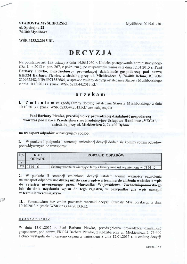 STAROSTA MYSLIBORSKI ul. Spokojna22 74-300 MySlib6rz MySlib6rz,2015-01-30 wSR.6233.2.201s.RL DECYZJA Na podstawie art. 155 ustawy z dnia 14.06.1960 r. Kodeks postgpowania administracyjnego (Dz. U. z 2013 r. poz. 267, z pofin. zm.), po rozpatrzeniu wniosku z dma I2.0I.2015 r. Pani Barbary Plewko, przedsigbiorcy prowadz4cej dzialalnoSd gospodarcz4 pod narw1 EKO24 Barbara Plewko, z siedzib4 przy ul. Mickiewicza 2, 74-400 Dgbno, REGON 210962848, NIP: 5971352684, w sprawie zmiany decyzji ostatecznej Starosty MySliborskiego z dnia 10.10.2013 r. (znak: WSR.6233.44.2013.RL) orzekam I. Zmi 1 0. 1 0.20 1 3 en i am.zazgodqStrony decyzjp ostateczn4starostyMySliborskiego zdnia r. (znak: WSR. 62 3 3 .4 4.20t3 .RL) zezwalajqc4 dla Pani Barbary Plewko, przedsipbiorcy prowadz4cej dzialalnoSd gospod ^yczq w6wczas pod nazw4 Przedsiqbiorstwo Produkcyjno-Uslugowo-Handlowe,VEGA',, z siedzib4 przy ul. Mickiewicza2,T4-400 Dpbno na transport odpad6w w nastqpuj4cy spos6b: 1. W punkcie I podpunkt 1 sentencji zmienianej decyzji dodaje siq kolejny rodzaj odpad6w przewidywanych do transportu: I(OD Lp. RODZAJE ODPADOW ODPADU ., 1 899 3 0B 01 16 2. W punkcie Szlamy wodne zawiera.jqce farby i lakiery inne ni2 wymienione w 08 01 l5 II sentencji zmienianej decyzji ustalam termin waznoSci zezwolenia terminu do zloZenia wniosku o wpis do rejestru utworzonego przez Marszalka Wojewridztwa Zachorlniopomorskiego lub do dnia uzyskania wpisu do tego rejestru, w przypadku gdy wpis nast4pil w terminie wczeSniejsrym. na transport odpad6w nie dluZej niZ do czasu uptywu p III. Pozostawiam bez,. zmian pozostale warunki decyzji Starosty MySliborskiego 1 0. 1 0.20 1 3 r. (znak: WSR.6233.44.20 1 3.RL). z dnia uzasadnienie 13.0I.2015 r. Pani Barbara Plewko, przedsiqbiorca prowadz4ca dzialalnosc gospodarczq pod nazwqBKo24 Barbara Plewko, z siedzibqprzy ul. Mickiewicza 2, 74-400 Dqbno wyst4pila do tutejszego organu z wnioskiem z dnia 12.01.2015 r. o zmiang decyzji W dniu Strona I z3 Starosty My6liborskiego z dnia 1610.10.2013 r. (znak: WSR.6233.44.2013.RL). Starosta MySliborski ustalil, ze ww. decyzjq zemvohl na transport odpad6w. Przedmiotowa decyzja jest decyzj4 ostateczn4. Nadmieni(, nale?y, 2e wczelniej w oparciu o informacjq Pani Barbary Plewko przyjqto, 2e zmientLa ona nazwe fi.-y z P.P.U.H. ,,VEGA" na EKO24 Barbara Plewko, bez zmiany numeru REGON i nr NIP. Wiedz4c, 2e zgodnie z art. 432 $ 1 i art. 434 ustawy z dnia 23.04.1964 r. Kodeks cywilny (Dz. U. z 2014 r. poz. l2I, z p62n. zm.) przedsiqbiorca dziala pod firm4 ktor4 w przypadku osoby fizycznej jest jej imiE i nazwisko i nie wyklucza to wlqczenra do firmy pseudonimu lub okreSlefr wskazuj4cych na przedmiot dzialalnoici przedsiqbiorcy, miejsce j.j prowadzenia oraz innych okreSleri dowolnie obranych, Starosta MySliborski uznil., ze jest to nadal ten sam przedsiEbiorca, kt6remu Starosta wydal wczeSniej zezwolenie na transport odpad6w. z dnia20.0L20l5 r. (znak: WSR.6233.2.2015.RL) zawiadomil postqpowania administracyjnego na ww. wniosek, informujqc przy tym, o wszczQciu stosownie do art. 10 $ 1 ustawy z dnia 14.06.1960 r. Kodeks postgpowania administracyjnego (Dz. U. 22013 r. pot.267, zpoZn. zm.) o udostqpnieniu akt sprawy do wglqdu. Strona do dnia wydania niniejszej decyzji nie korzystala z przysluguj4cego jej prawa. Starosta MySliborski pismem Pani Barbara Plewko, przedsiqbiorca prowadz4cej dziaNalnoSc gospodarczg pod nazwq EKO24 Barbara Plewko, z siedzibqprzy ul. Mickiewicza 2,74-400 Dqbno rozszerza zalcres Swiadczonych uslug o kolejny rodzaj odpad6w przewrdzianych do transportu i bgdzie dziaNal w obrpbie dotychczasowego zezwolenia na obszarze Rzeczypospolitej Polskiej walnego z mocy prawa nie dluzej niz do czasu uplywu terminu do zlolenra wniosku o wpis do rejestru utworzonego ptzez Marszalka Wojew6dztwa Zachodniopomorskiego lub do dnia uzyskania wpisu do tego rejestru, w przypadku gdy wpis nastqpil w terminie wczeSniejszym. dp Zgodnie z art. 104 ustawy z dnia 14.06.1960 r. Kodeks postqpowania administracyjnego (Dz. U. z 2013 r. poz. 267 , z p62n. zm.) organ administracji publicznej zalatwia sprawQ przez wydanie decyzji. W mySl art. 155 ostatnio cyt. ustawy decyzja ostateczna, na mocy kt6rej strona nabyla prawo, mohe by6 w kahdym czasie zazgodqstrony uchylona lub zmieniona przez organ administracji publicznej, kt6ry jq wydal, Iub przez organ v'rylszego stopnia, jezeli przepisy szczeg6lne nie sprzeciwiaj4siq uchyleniu lub zmranre takiej decyzjiiprzemawiaza tym interes spoleczny lub sluszny interes strony. Opierajqc sip na wyroku NSA z dnia 13.12.1996 r. (sygn.: III SA 1207195), Starosta MySliborski jest zdania, 2e decyzje podejmowane w trybie art. 155 ww. Kodeksu postEpowania administracyjnego maj4 charakter decyzji uznaniowych. Ustawa z dnia 14.12.2012 r. o odpadach (Dz. U. z 2013 r. poz. 2I), stanowi wprost w art. 233 usI.3,2e do wydania zezwolen na transport odpad6w do czasu utworzenia rejestru przez marszalka wojew6dztwa, stosuje sip przepisy ustawy z dnia 27 .04.2001r. o odpadach (Dz. U. z 2010 r. Nr 185, poz. 1243, z p62n. zm.). JednoczeSnie zatwa2y6 nale?y, 2e v'rw. ustawa o odpadach z 2012 r. nie sprzeciwia siE zmianom decyzji, takhe tym, wydanym na podstawie przepis6w dotychczasowych. Zatem, maj4c na uwadze, 2e za zmranqprzedmiotowej decyzji przemawia interes spoleczny w tym sensie, 2e nieuregulowanie rodzaj6w odpad6w przewidzianych do transportu w stosownym zezwoleniu mogloby prowadzii do niekontrolowanego gospodarowania odpadami i w spos6b nielegalny. JednoczeSnte, uznajqc dobr4 wolE Strony do uregulowania formalno-prawnego gospodarki odpadami za jej sluszny interes i bior4c powyzsze pod uwagE nale2alo orzecjak w sentencji. Strona 2 z 3 pouczenie Ni,niejsza decyzja obowi4zuje l4cznie z d,ecyzj1 z dnia 10.10.2013 r. (znak: wsR.6233.44.20 13.RL). Od niniejszej decyzji sluzy stronie odwolanie do Samorz4dowego Kolegium Odwolawczego Szczecinie, wniesione za poSrednictwem Starosty MySliborskiego w ci4gu czternastu dni od dniajej dorqczenia. w ngr lE. Henryk Oczkoi Naczeln ik Wy