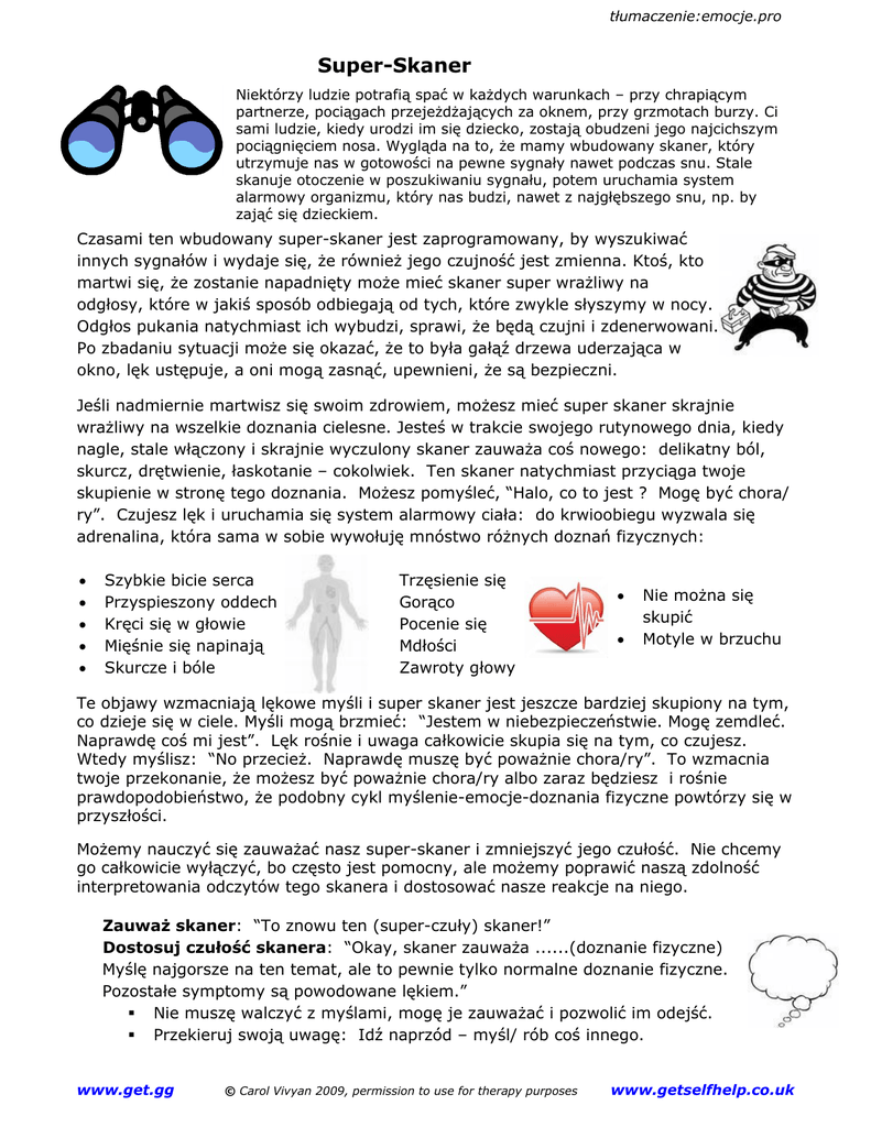 tłumaczenie:emocje.pro Super-Skaner Niektórzy ludzie potrafią spać w każdych warunkach – przy chrapiącym partnerze, pociągach przejeżdżających za oknem, przy grzmotach burzy. Ci sami ludzie, kiedy urodzi im się dziecko, zostają obudzeni jego najcichszym pociągnięciem nosa. Wygląda na to, że mamy wbudowany skaner, który utrzymuje nas w gotowości na pewne sygnały nawet podczas snu. Stale skanuje otoczenie w poszukiwaniu sygnału, potem uruchamia system alarmowy organizmu, który nas budzi, nawet z najgłębszego snu, np. by zająć się dzieckiem. Czasami ten wbudowany super-skaner jest zaprogramowany, by wyszukiwać innych sygnałów i wydaje się, że również jego czujność jest zmienna. Ktoś, kto martwi się, że zostanie napadnięty może mieć skaner super wrażliwy na odgłosy, które w jakiś sposób odbiegają od tych, które zwykle słyszymy w nocy. Odgłos pukania natychmiast ich wybudzi, sprawi, że będą czujni i zdenerwowani. Po zbadaniu sytuacji może się okazać, że to była gałąź drzewa uderzająca w okno, lęk ustępuje, a oni mogą zasnąć, upewnieni, że są bezpieczni. Jeśli nadmiernie martwisz się swoim zdrowiem, możesz mieć super skaner skrajnie wrażliwy na wszelkie doznania cielesne. Jesteś w trakcie swojego rutynowego dnia, kiedy nagle, stale włączony i skrajnie wyczulony skaner zauważa coś nowego: delikatny ból, skurcz, drętwienie, łaskotanie – cokolwiek. Ten skaner natychmiast przyciąga twoje skupienie w stronę tego doznania. Możesz pomyśleć, “Halo, co to jest ? Mogę być chora/ ry”. Czujesz lęk i uruchamia się system alarmowy ciała: do krwioobiegu wyzwala się adrenalina, która sama w sobie wywołuję mnóstwo różnych doznań fizycznych: Szybkie bicie serca Przyspieszony oddech Kręci się w głowie Mięśnie się napinają Skurcze i bóle Trzęsienie się Gorąco Pocenie się Mdłości Zawroty głowy Nie można się skupić Motyle w brzuchu Te objawy wzmacniają lękowe myśli i super skaner jest jeszcze bardziej skupiony na tym, co dzieje się w ciele. Myśli mogą brzmieć: “Jestem w niebezpieczeństwie. Mogę zemdleć. Naprawdę coś mi jest”. Lęk rośnie i uwaga całkowicie skupia się na tym, co czujesz. Wtedy myślisz: “No przecież. Naprawdę muszę być poważnie chora/ry”. To wzmacnia twoje przekonanie, że możesz być poważnie chora/ry albo zaraz będziesz i rośnie prawdopodobieństwo, że podobny cykl myślenie-emocje-doznania fizyczne powtórzy się w przyszłości. Możemy nauczyć się zauważać nasz super-skaner i zmniejszyć jego czułość. Nie chcemy go całkowicie wyłączyć, bo często jest pomocny, ale możemy poprawić naszą zdolność interpretowania odczytów tego skanera i dostosować nasze reakcje na niego. Zauważ skaner: “To znowu ten (super-czuły) skaner!” Dostosuj czułość skanera: “Okay, skaner zauważa ......(doznanie fizyczne) Myślę najgorsze na ten temat, ale to pewnie tylko normalne doznanie fizyczne. Pozostałe symptomy są powodowane lękiem.” Nie muszę walczyć z myślami, mogę je zauważać i pozwolić im odejść. Przekieruj swoją uwagę: Idź naprzód – myśl/ rób coś innego. www.get.gg © Carol Vivyan 2009, permission to use for therapy purposes www.getselfhelp.co.uk tłumaczenie:emocje.pro Błędne koło lęku o zdrowie Przekonanie: Mogę poważnie zachorować na śmiertelną chorobę Super-skaner Stale czujny & bardzo czuły: Skanuje w poszukiwaniu doznań somatycznych Wyzwalacz: słyszę albo widzę coś Super-skaner zauważa doznanie w ciele Myśli: “Halo, co to jest ? Mogę być chora/ry” “to potwierdzenie: Naprawdę jestem poważnie chora/ry” LĘK Skupienie na doznaniach fizycznych System alarmowy ciała się aktywuje: Adrenalina Fizyczne doznanie lęku Zwiększone nieprzyjemne doznania: gorąco, pot, słabo, ból głowy itp Sprawdzanie Szukanie otuchy upewnianie się Myśli: “Jestem w niebezpieczeństwie. Mogę zemdleć. Naprawdę mogę być poważnie chora/ry” www.get.gg © Carol Vivyan 2009, permission to use for therapy purposes www.getselfhelp.co.uk