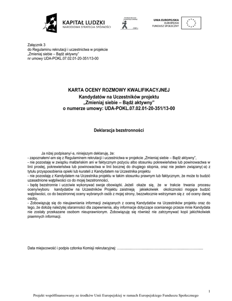 Załącznik 3 do Regulaminu rekrutacji i uczestnictwa w projekcie „Zmieniaj siebie – Bądź aktywny” nr umowy UDA-POKL.07.02.01-20-351/13-00 KARTA OCENY ROZMOWY KWALIFIKACYJNEJ Kandydatów na Uczestników projektu „Zmieniaj siebie – Bądź aktywny” o numerze umowy: UDA-POKL.07.02.01-20-351/13-00 Deklaracja bezstronności Ja niżej podpisany/-a, niniejszym deklaruję, że: - zapoznałem/-am się z Regulaminem rekrutacji i uczestnictwa w projekcie „Zmieniaj siebie – Bądź aktywny”, - nie pozostaję w związku małżeńskim ani w faktycznym pożyciu albo stosunku pokrewieństwa lub powinowactwa w linii prostej, pokrewieństwa lub powinowactwa w linii bocznej do drugiego stopnia, oraz nie jestem związany(-a) z tytułu przysposobienia opieki lub kurateli z Kandydatem na Uczestnika projektu - nie pozostaję z Kandydatem na Uczestnika projektu w takim stosunku prawnym lub faktycznym, że może to budzić uzasadnione wątpliwości co do mojej bezstronności, - będę bezstronnie i uczciwie wykonywać swoje obowiązki. Jeżeli okaże się, że w trakcie trwania procesu oceny/wyboru kandydatów na Uczestników Projektu zaistnieją jakiekolwiek okoliczności mogące budzić wątpliwości, co do bezstronnej oceny wybranych osób z mojej strony, bezzwłocznie wstrzymam się z od oceny danej osoby, - Zobowiązuję się do nieujawniania informacji związanych z oceną Kandydatów na Uczestników projektu oraz do tego, że dołożę należytej staranności dla zapewnienia, aby informacje dotyczące ocenianego przeze mnie Kandydata nie zostały przekazane osobom nieuprawnionym. Zobowiązuję się również nie zatrzymywać kopii jakichkolwiek pisemnych informacji. Data miejscowość i podpis członka Komisji rekrutacyjnej: ........................................................................................ 1 Projekt współfinansowany ze środków Unii Europejskiej w ramach Europejskiego Funduszu Społecznego Imię i nazwisko Kandydata Imię i nazwisko oceniającego 2. TABELA OCENY Oceniający ma możliwość przyznania maksymalnie zaproponowanej liczby punktów Proponowana punktacja 8 - motywacja bardzo wysoka Kandydat wykazuje dużą chęć udziału w projekcie. Potrafi jasno określić swoje oczekiwania co do udziału w projekcie. Jest świadomy zarówno przeszkód/trudności wynikających z udziału w projekcie, jak również sposobów działania zmierzających do ich rozwiązania. Świadomie nazywa korzyści wynikające z udziału w projekcie. Otwarcie wskazuje na swój potencjał: mocne i słabe strony. Jest dyspozycyjny. Zdaje sobie sprawę z konieczności przekonania do własnej osoby w celu odbycia szkolenia i stażu zawodowego oraz podjęcia zatrudnienia 6 - motywacja wysoka Kandydat wykazuje chęć wzięcia udziału w projekcie, jest świadomy konieczności podejmowania działań w celu zmiany własnej sytuacji, wśród motywów wskazuje możliwość poznania nowych ludzi, nieodpłatność szkoleń, wyraża zainteresowanie szkoleniami i stażami zawodowymi oraz podjęciem zatrudnienia. Mimo obaw co do skuteczności proponowanych działań podejmuje ryzyko. Kandydat przy użyciu pytań pomocniczych potrafi wskazać własne atuty i słabości 4 - motywacja średnia Kandydat w stopniu umiarkowanym jest zainteresowany udziałem w projekcie, połowicznie jest przekonany co do efektywności i trwałości proponowanego wparcia, wśród motywów udziału w projekcie zarówno wskazuje obszary związane z możliwością zdobycia nowych kwalifikacji zawodowych, ale również wysoko ceni szansę poprawy swojej sytuacji materialnej. Kandydat w stopniu umiarkowanym potrafi wskazać własne atuty oraz słabości 2 - motywacja niska Kandydat w stopniu marginalnym jest zainteresowany udziałem w projekcie, proponowane wsparcie mało jest dla niego interesujące, do najważniejszych motywów udziału w projekcie zalicza możliwość otrzymania stypendium stażowego, dodatku szkoleniowego, nie wykazuje zainteresowania udziałem w zajęciach doradczych, szkoleniach i stażach zawodowych oraz podjęciem zatrudnienia. Kandydat ma trudności w określaniu mocnych i słabych stron. W bardzo małym stopniu jest gotowy na zmiany 0-motywacja bardzo niska Kandydat nie widzi sensu wzięcia udziału w projekcie, nie chce nic zmienić w swoim życiu, nie ma celu, widzi przeszkody, które uniemożliwiają mu wzięcie udziału w projekcie, ale nie wykazuje chęci by im zaradzić i znaleźć rozwiązanie, przyjmuje postawę bierną co do swojej sytuacji. Kandydat nie potrafi zidentyfikować własnych atutów i słabości. Nie widzi celowości i zasadności w dokonywaniu własnej samooceny Liczba punktów 3. Uzasadnienie członka Komisji Rekrutacyjnej Lp. 1. Data i podpis członka Komisji rekrutacyjnej: …..................................................................................................... 2 Projekt współfinansowany ze środków Unii Europejskiej w ramach Europejskiego Funduszu Społecznego
