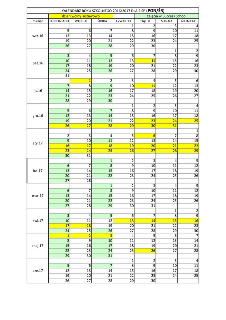 KALENDARZ ROKU SZKOLNEGO 2016/2017 DLA 2 SP (PON/ŚR) dzień wolny ustawowo zajęcia w Success School miesiąc wrz.16 paź.16 lis.16 gru.16 sty.17 lut.17 mar.17 kwi.17 maj.17 cze.17 PONIEDZIAŁEK WTOREK ŚRODA CZWARTEK PIĄTEK SOBOTA 2 9 16 23 30 NIEDZIELA 5 12 19 26 6 13 20 27 7 14 21 28 1 8 15 22 29 3 10 17 24 4 11 18 25 3 10 17 24 31 4 11 18 25 5 12 19 26 6 13 20 27 7 14 21 28 1 8 15 22 29 2 9 16 23 30 7 14 21 28 1 8 15 22 29 2 9 16 23 30 3 10 17 24 4 11 18 25 5 12 19 26 6 13 20 27 5 12 19 26 6 13 20 27 7 14 21 28 1 8 15 22 29 2 9 16 23 30 3 10 17 24 31 4 11 18 25 4 11 18 25 5 12 19 26 6 13 20 27 7 14 21 28 1 8 15 22 29 1 8 15 22 2 9 16 23 3 10 17 24 4 11 18 25 5 12 19 26 7 14 21 28 1 8 15 22 29 2 9 16 23 30 3 10 17 24 31 4 11 18 25 5 12 19 26 3 10 17 24 1 8 15 22 29 4 11 18 25 2 9 16 23 30 5 12 19 26 3 10 17 24 31 6 13 20 27 4 11 18 25 7 14 21 28 5 12 19 26 1 8 15 22 29 6 13 20 27 2 9 16 23 30 7 14 21 28 5 12 19 26 6 13 20 27 7 14 21 28 1 8 15 22 29 2 9 16 23 30 3 10 17 24 4 11 18 25 2 9 16 23 30 3 10 17 24 31 6 13 20 27 7 14 21 28 6 13 20 27