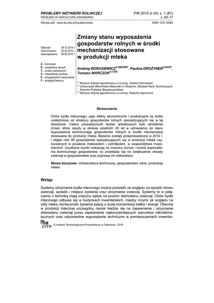 PROBLEMY P INŻYNIERIII ROLNICZE EJ PIR R 2015 (I–III): z. 1 (87) PROBLEMS P OF AG GRICULTURAL ENG GINEERING s. 69–77 Wersja W pdf: www w.itp.edu.pl/wyd dawnictwo ISSN N 1231-0093 Wpłynęło W Zrecenzowano Z Zaakceptowano Z 228.10.2014 r. 002.02.2015 r. 009.02.2015 r. A – koncepcja B – zestawienie dannych C – analizy statystycczne D – interpretacja wyyników E – przygotowanie m maszynopisu F – przegląd literatury Zmiany stanu s w wyposaż żenia gospoda arstw ro olnych w środk ki m mechani zacji sttosowan ne w produk kcji mle eka An ndrzej BORU USIEWICZ1) AABCDEF, Paulin na DROŻYNE ER2) BCEF, 3) CDE To omasz MARC CZUK 1) Wyższa Szkoła Agrobiznesu W A wŁ Łomży, Zakład Informatyki U Uniwersytet Warrmińsko Mazurskki w Olsztynie, Wydział W Nauk Te echnicznych, K Katedra Podstaw w Bezpieczeństtwa 3) W Wyższa Szkoła Agrobiznesu A wŁ Łomży, Katedra a Agronomii 2) Streszczenie Chów b bydła mlecznego, jego efe ekty ekonomiiczne i produkcyjne są ściśle uzależn nione od stru uktury gospod darstw rolnycch specjalizujących się w tej dziedzin nie. Celem prowadzonyc ch badań a ankietowych było określe enie zmian, które zaszłyy w okresie ostatnich o 20 lat w odniesieniu do sta anu ażenia techniicznego gosp podarstw roln nych w środ dki mechanizacji wyposa stosowa ane do produ ukcji mleka. Badania B zosta ały przeprowadzone w 2013 r. i objęto o nimi 95 gosspodarstw specjalizujących h się w produ ukcji mleka usyu tuowanych w powie ecie makowsk kim i ostrołęcckim, w wojew wództwie ma azom. Uzyskane wyniki w wskazują na znaczn ny wzrost i ro ozwój wyposa ażewieckim nia technicznego go ospodarstw, co c przekłada a się na zwię ększenie obsa ady ąt w gospodarrstwie oraz po oprawę ich do obrostanu. zwierzą Słowa kluczowe: in nfrastruktura techniczna, go ospodarstwo rolne, produk kcja mleka Wstęp W Systemy S utrzyymania bydła a mlecznego można podzzielić ze względu na sposób chowu zwierząt, z spo osób i miejscce żywienia oraz o utrzyma ania zwierzątt. Systemy te e w połączeniu c z techniką mają zn naczny wpływ w na poziom dobrostanu zwierząt. Ch hów bydła mlecznego m od dbywa się w budynkach inwentarskicch, między innymi ze wz zględu na udój u mleka, ko onieczność żywienia ż pasz zą o dużej ko oncentracji białka i energii. Obecnie w produkcji m mlecznej szcczególny nac cisk kładzie się na zape ewnienie i uttrzymanie dobrostanu d zzwierząt prze ez zapewnien nie najkorzysstniejszych warunków w mikroklimaty ycznych orazz odpowiedn nie wyposaże enie techniczzne w pomie eszczeniach inwentar© Instyytut Technologiczzno-Przyrodniczy y w Falentach, 20015 Andrzej Borusiewicz, Paulina Drożyner, Tomasz Marczuk skich. Odpowiednio do przyjętego systemu chowu stosuje się różne technologie utrzymania zwierząt, zadawania pasz, doju czy też usuwania obornika. Według badań przeprowadzonych w 2002 r., na terenie całej Polski ponad 98% wszystkich obór to obory uwięziowe. Jedynie w gospodarstwach produkujących ponad 100 tys. l mleka rocznie udział obór wolnostanowiskowych wynosił ponad 10% [NAWROCKI 2009]. Racjonalny rozwój techniki i technologii produkcji zwierzęcej jest uwarunkowany postępem genetycznym, wymaganiami dobrostanu zwierząt i jakości produktów, a także ograniczeniami związanymi z ochroną środowiska [ROMANIUK 2010]. Wdrażanie postępu technicznego i technologicznego w produkcji zwierzęcej zależy od efektywności prowadzonej działalności. Na strukturę stosowanych maszyn wpływa stopień koncentracji zwierząt. Wielkość stada zwierząt zależy od wielkości gospodarstwa, jakości gleb oraz prawidłowego doboru i wykorzystania maszyn [KWAŚNIEWSKI 2006]. Wprowadzenie nowoczesnych technologii, np. stosowanie robotów udojowych, wpływa na poprawę jakości i ilości uzyskiwanego mleka od krów [GŁOWICKA-WOŁOSZYN i in. 2010; WINNICKI i in. 2010; WINNICKI, JUGOWAR 2014]. W praktyce rolniczej szczególne znaczenie mają tzw. zintegrowane metody produkcji, które są warunkowane wdrożeniem „Kodeksu dobrej praktyki rolniczej” [DUER i in. (red.) 2002]. Celem badań była ocena zmian wyposażenia technicznego w gospodarstwach specjalizujących się w produkcji mleka krowiego w okresie ostatnich 20 lat. Metodyka badań Badania realizowano w 2013 r., polegały one na przeprowadzeniu ankiet wśród właścicieli 95, losowo wybranych, gospodarstw rolnych specjalizujących się w produkcji mleka, znajdujących się na terenie powiatu makowskiego i ostrołęckiego w województwie mazowieckim. Pytania dotyczyły stanu technicznego gospodarstw i zmian, które zaszły w okresie 20 lat. Na podstawie udzielonych odpowiedzi określono stan wyposażenia gospodarstw rolnych w środki mechanizacji stosowane bezpośrednio lub pośrednio w produkcji mlecznej przed dwudziestu laty i obecnie. Narzędziem badawczym był kwestionariusz wywiadu, który składał się z trzech części: pierwsza – na temat właściciela gospodarstwa (wiek, wykształcenie), druga – informacji o gospodarstwie (wielkość gospodarstwa, struktura zasiewów, wielkość stada), trzecia – zmian w strukturze wyposażenia technicznego gospodarstw specjalizujących się w produkcji mleka. Wyniki badań i dyskusja Wszystkie badane gospodarstwa rozpoczęły specjalizację w produkcji mleka przed 1990 r., wraz z podjęciem specjalizacji wybudowano w nich nowe obory. W analizowanych gospodarstwach 50% właścicieli jest w wieku 35–45 lat, natomiast druga połowa jest w przedziale wiekowym 45–55 lat. W badanej grupie gospodarstw w powiecie makowskim i ostrołęckim przed 1993 r. 75% stanowiły gospodarstwa do 20 ha, pozostałe 25% to gospodarstwa o powierzchni od 21 do 30 ha (tab. 1). Obecnie widoczny jest znaczy wzrost areału, tj. blisko 50% stanowią gospodarstwa od 31 do 40 ha, po 25% od 21 do 30 ha i ponad 40 ha. 70 © ITP w Falentach; PIR 2015 (I–III): z. 1 (87) Zmiany stanu wyposażenia gospodarstw rolnych w środki mechaniza