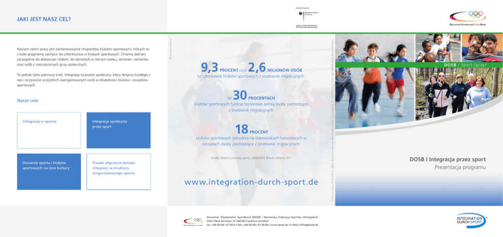 To jednak tylko pierwszy krok. Integracja to proces społeczny, który dotyczy każdego z nas i oczywiście wszystkich zaangażowanych osób w działalności klubów i związków sportowych. 2,6 30 W PROCENTACH klubów sportowych funkcje honorowe pełnią osoby pochodzące z środowisk migracyjnych. Nasze cele Integracja w sporcie 9,3 PROCENT czyli MILIONÓW OSÓB to członkowie klubów sportowych z środowisk migracyjnych. Integracja społeczna przez sport 18 PROCENT klubów sportowych zatrudnia na stanowiskach honorowych w zarządach osoby pochodzące z środowisk migracyjnych. Źródło: Raport o rozwoju sportu 2009/2010, Breuer, Kolonia 2011 Otwarcie sportu i klubów sportowych na inne kultury Trwałe włączenie tematu integracji w struktury zorganizowanego sportu www.integration-durch-sport.de Deutscher Olympischer SportBund (DOSB) l Niemiecka Federacja Sportów Olimpijskich Otto-Fleck-Schneise 12 l 60528 Frankfurt am Main tel. +49 (0) 69 / 67 00 0 l faks +49 (0) 69 / 67 49 06 l www.dosb.de l E-Mail [email protected] Cover pictures (from left to right): © picture alliance, Brandenburgische Sportjugend, SV Schott/Jenaer Glas, LSB NRW/Andrea Bowinkelmann Naszym celem pracy jest zainteresowanie imigrantów klubami sportowymi, których to z kolei pragniemy zachęcić do członkostwa w klubach sportowych. Chcemy dotrzeć szczególnie do dziewcząt i kobiet, do dorosłych w różnym wieku, seniorek i seniorów oraz osób z niezrzeszonych grup społecznych. © picture alliance Jaki jest nasz cel? DOSB l Sport łączy! DOSB l Integracja przez sport Prezentacja programu KIM JESTEŚMY Program „Integracja przez sport“ w DOSB CO OFERUJEMY Deutscher Olympischer SportBund (DOSB) l Niemiecka Federacja Sportów Olimpijskich Nasze działania obejmują specjalne oferty klubów sportowych dla osób z środowisk migracyjnych, inicjowanie kontaktów między ludźmi dzięki, na przykład instalacji przenośnych boisk do piłki i skateparków. Ważne tematy, takie jak gorodki (rosyjskie kręgle), towarzyszą szkoleniom międzykulturowym, które odbywają się bez rozgłosu, ale z mocnym efektem. Zapraszamy do zapoznania się z naszymi planami, ofertą, klubami, związkami sportowymi i ludźmi zaangażowanymi w propagowanie i uprawianie sportu w Niemczech! Program „Integracja przez sport“ jest wspierany finansowo przez Federalne Ministerstwo Wspieranie klubów Doradztwo dla klubów sportowych i sieci partnerskiej Wspólna radości z uprawiania sportu, wspólnie doświadczony wysiłek to doświadczenie, którego efekty trwają długo po końcowym gwizdku. To jest właśnie podstawa programu „Integracja przez sport“. Nasze integracyjne kluby sportowe w terenie realizują to wymagające zadanie na co dzień. Służymy klubom sportowym i sieci partnerskiej doradztwem podczas planowania merytorycznego i wdrażania organizacyjnego koncepcji integracji. Program „Integracja przez sport“ wspiera kluby sportowe zarówno finansowo, jak i także przez doradztwo i podnoszenie kwalifikacji pracowników. Aby uzyskad to wsparcie, trzeba spełnić następujące warunki: Pomagamy tworzyć powiązania z pozostałymi działaczami i projektami, pozyskiwać fundusze i opracowywać programy stałego finansowania. l wykazać gotowość na działania integracyjne l realizowanie specjalnych ofert i projektów l regularna współpraca z osobami realizującymi nasz program l przynależność do krajowego stowarzyszenia sportowego Budowanie powiązań Tworzenie i rozwijanie związków w sporcie to nieodzowny warunek skutecznego działania na rzecz integracji. Powiązania umożliwiają łączenie zasobów, wymianę informacji i doświadczeń, opracowywanie wspólnych pomysłów i projektów. Spraw Wewnętrznych oraz Federalny Urząd ds. Migracji i Uchodźców. Podnoszenie kwalifikacji w klubach i związkach sportowych Rzeczownik, żeński, edukacja językowa „Złączenie pojedynczych osób albo grup do społecznej i kulturowej wspólnoty“ Socjologiczne określenie z internetowego leksykonu Ponadto wspieramy organizacje sportowe i kluby lokalne przez ustawiczne kształcenie ich kadr i wolontariuszy. © LSB NRW/Andrea Bowinkelmann INTEGRACJA (tłumaczenie z niemieckiego) Wymiana informacji i doświadczeń z organizacjami imigrantów jest niezbędna, aby podczas tworzenia naszych koncepcji uwzględnić także punkt widzenia tych osób, które pragną mocno włączyć się w działalność sportową. W projekcie rozwoju kwalifikacji „sport międzykulturalny“ uświadamiamy klubom i związkom sportowym, jak można wykorzystać różnorodnoość kulturową w sporcie i jak należy podchodzić do innych kultur. Na poziomie lokalnym ważnymi partnerami klubów sportowych są to na przykład: l miejscowe organizacje imigrantów l instytucje i władze, takie jak policja, urząd pracy, urząd sportu l instytucje edukacyjne, takie jak szkoły, przedszkola, szkoły języka l instytucje społeczne, takie jak organizacje charytatywne, kościoły l związki sportowe © DOSB Od ponad 20 lat działamy na rzecz wspólnego rozwoju obywateli w naszym kraju. „My“ to w pierwszym rzędzie federalny ośrodek koordynujący, 16 krajowych ośrodków koordynujących i ponad 750 integracyjnych klubów sportowych w terenie. Organizują one spotkania, imprezy sportowe, prowadzą integrację przez sport, realizując setki projektów rocznie.