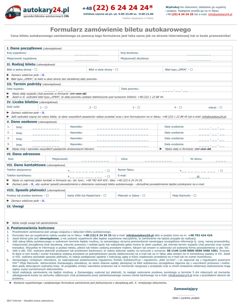 +48 (22) 6 24 24 24* Infolinia czynna od pn.-pt. 9.00-23.00 so. -9.00-21.00 Wydrukuj ten dokument, dokładnie go wypełnij i podpisz. Następnie prześlij go na nr faksu: +48 (22) 6 24 24 25 lub e-mail: [email protected] *telefon stacjonarny w Polsce Formularz zamówienie biletu autokarowego Cena biletu autokarowego zamówionego za pomocą tego formularza jest taka sama jak na stronie internetowej lub w kasie przewoźnika! I. Dane początkowe (obowiązkowe) Kraj wyjazdowy: Miejscowość wyjazdowa: __________ Kraj docelowy: __________ __________ Miejscowość docelowa: __________ II. Rodzaj biletu (obowiązkowe) Bilet w jedną stronę - □ Bilet w dwie strony - □ Bilet typu „OPEN” - □ ► Zaznacz właściwe pole – X. ► Bilet typu „OPEN”, to bilet w dwie strony bez określonej daty powrotu. III. Termin podróży (obowiązkowe) Data wyjazdu: Data powrotu: ____-__-__ ____-__-__ ► Wpisz datę wyjazdu i/lub powrotu w formacie: rrrr-mm-dd. ► Jeżeli w II. wybrałeś bilet typu „OPEN”, to datę powrotu ustalasz telefonicznie pod numerem Infolinii: +48 (22) 1 22 88 44. IV. Liczba biletów (obowiązkowe) Ilość osób: 1- □ 2- □ 3- □ 4- □ więcej - □ ► Zaznacz właściwe pole – X. ► Jeśli wybrałeś więcej niż cztery bilety, to dane wszystkich pasażerów należy przesłać wraz z tym formularzem na nr faksu: +48 (22) 1 22 88 45 lub e-mail: [email protected]. V. Dane osobowe (obowiązkowe) 1. ___________________ Data urodzenia: ____-__-__ ___________________ Data urodzenia: ____-__-__ ___________________ Data urodzenia: ____-__-__ Imię: __________ ___________________ ► Wpisz imię i nazwisko wszystkich pasażerów drukowanymi literami. Data urodzenia: Imię: 2. Imię: 3. Imię: __________ Nazwisko: __________ Nazwisko: __________ Nazwisko: 4. Nazwisko: ____-__-__ ► Wpisz datę w formacie: rrrr-mm-dd. VI. Dane adresowe Kod: Miejscowość: __-___ __________ Ulica: __________ Nr domu: ____ VII. Dane kontaktowe (obowiązkowe) □ -□ Telefon stacjonarny: +_ _ _ _ _ _ _ _ _ _ _ - Telefon komórkowy: Numer faksu: +_ _ _ _ _ _ _ _ _ _ _ - □ E-mail: +_ _ _ _ _ _ _ _ _ _ _ _ _ _@_ _ _ _ ► Wpisz co najmniej jeden kontakt w formacie np.: tel. kom.: +48 792 424 424 , faks: +48 (22) 6 24 24 25. ► Zaznacz pole – X, aby wybrać sposób powiadomienia o dokonaniu rezerwacji biletu autokarowego – domyślnie powiadomienie będzie przekazane na e-mail. VIII. Sposób płatności (obowiązkowe) Przekaz lub przelew bankowy - □ Karta VISA lub MasterCard - □ Płatność w Żabce - □ Moje Rachunki - □ ► Zaznacz właściwe pole – X. IX. Uwagi ► Wpisz swoje uwagi lub spostrzeżenia. X. Postanowienia końcowe 1. 2. 3. 4. 5. 6. 7. Przedmiotem zamówienia jest usługa związana z nabyciem biletu autokarowego. Formularz ten po wypełnieniu należy wysłać na nr faksu: +48 (22) 6 24 24 25 lub e-mail: [email protected] albo w postaci mms na nr: +48 792 424 424. Jeżeli któreś pole jest obowiązkowe, a nie zostanie wypełnione albo będzie wypełnione nieczytelnie, to zamówienie nie będzie przyjęte do realizacji. Jeśli zakup biletu autokarowego w wybranym terminie będzie możliwy, to zamawiający otrzyma potwierdzenie zawierające szczegółowe informacje tj. cenę, nazwę przewoźnika, miejscowość początkową i/lub docelową, warunki przewozu i rozkład jazdy lub wskazówkę gdzie można te dane uzyskać, jak również termin wyjazdu i/lub powrotu oraz numer transakcji. Wszystkie te informacje w postaci tekstu, plików lub linków zostaną przesłane mailem, faksem lub smsem w zależności od wybranej formy powiadomienia w pkt. VII. Jeśli w pkt. VIII. wybrano płatność przekazem lub przelewem bankowym, to należy dokonać wpłaty na rachunek o numerze: 98 1140 1140 0000 4690 4400 1001. Pozostałe dane w tym kwotę i numer transakcji zostaną przesłane za pośrednictwem poczty elektronicznej na e-mail lub na nr faksu albo smsem na nr komórkowy podany w VII. Jeżeli w VIII. wybrano pozostałe sposoby płatności, to należy postępować zgodnie z instrukcją ujętą w treści wiadomości przesłanej na e-mail lub na numer komórkowy. Zamawiający niniejszym oświadcza, że zaakceptował postanowienia regulaminu Portalu Autokary24.pl i regulaminu „bilet on-line”, i że zapoznał się z regulacjami prawnymi VIA™-Moje Rachunki. Jednocześnie Zamawiający oświadcza, że zanim dokona wpłaty pieniężnej za bilet autokarowy szczegółowo zapozna się z warunkami przewozu i rozkładem jazdy dotyczącym wybranej trasy. W przypadku zmiany warunków przewozu lub w momencie rezygnacji z przejazdu oraz w chwili wniesienia reklamacji zastosowanie mają zapisy wyżej wymienionych dokumentów. Jeżeli realizacja zamówienia nie będzie możliwa, a Zamawiający wykonał już płatność, to nastąpi wykonanie przelewu zwrotnego w terminie 5 dni roboczych od momentu zaksięgowania kwoty na rachunku odbiorczym i/lub przekazania przez zainteresowanego numeru konta bankowego na e-mail: [email protected] wraz z pozostałymi danymi do przelewu. ► Wysłanie wypełnionego i podpisanego formularza zamówienia jest jednoznaczne z akceptacją pkt. X. niniejszego dokumentu. Zamawiający ………………… SELF Internet – Wszelkie prawa zastrzeżone. Data i czytelny podpis