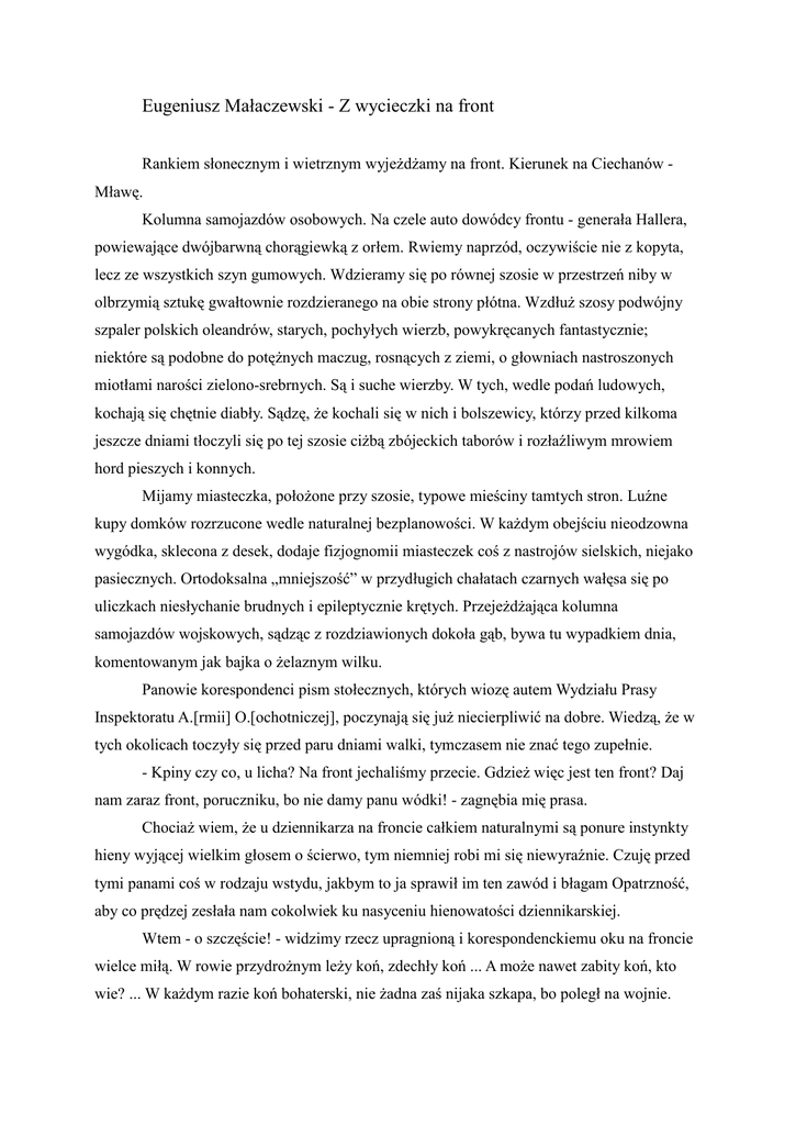 Eugeniusz Małaczewski - Z wycieczki na front Rankiem słonecznym i wietrznym wyjeżdżamy na front. Kierunek na Ciechanów Mławę. Kolumna samojazdów osobowych. Na czele auto dowódcy frontu - generała Hallera, powiewające dwójbarwną chorągiewką z orłem. Rwiemy naprzód, oczywiście nie z kopyta, lecz ze wszystkich szyn gumowych. Wdzieramy się po równej szosie w przestrzeń niby w olbrzymią sztukę gwałtownie rozdzieranego na obie strony płótna. Wzdłuż szosy podwójny szpaler polskich oleandrów, starych, pochyłych wierzb, powykręcanych fantastycznie; niektóre są podobne do potężnych maczug, rosnących z ziemi, o głowniach nastroszonych miotłami narości zielono-srebrnych. Są i suche wierzby. W tych, wedle podań ludowych, kochają się chętnie diabły. Sądzę, że kochali się w nich i bolszewicy, którzy przed kilkoma jeszcze dniami tłoczyli się po tej szosie ciżbą zbójeckich taborów i rozłaźliwym mrowiem hord pieszych i konnych. Mijamy miasteczka, położone przy szosie, typowe mieściny tamtych stron. Luźne kupy domków rozrzucone wedle naturalnej bezplanowości. W każdym obejściu nieodzowna wygódka, sklecona z desek, dodaje fizjognomii miasteczek coś z nastrojów sielskich, niejako pasiecznych. Ortodoksalna „mniejszość” w przydługich chałatach czarnych wałęsa się po uliczkach niesłychanie brudnych i epileptycznie krętych. Przejeżdżająca kolumna samojazdów wojskowych, sądząc z rozdziawionych dokoła gąb, bywa tu wypadkiem dnia, komentowanym jak bajka o żelaznym wilku. Panowie korespondenci pism stołecznych, których wiozę autem Wydziału Prasy Inspektoratu A.[rmii] O.[ochotniczej], poczynają się już niecierpliwić na dobre. Wiedzą, że w tych okolicach toczyły się przed paru dniami walki, tymczasem nie znać tego zupełnie. - Kpiny czy co, u licha? Na front jechaliśmy przecie. Gdzież więc jest ten front? Daj nam zaraz front, poruczniku, bo nie damy panu wódki! - zagnębia mię prasa. Chociaż wiem, że u dziennikarza na froncie całkiem naturalnymi są ponure instynkty hieny wyjącej wielkim głosem o ścierwo, tym niemniej robi mi się niewyraźnie. Czuję przed tymi panami coś w rodzaju wstydu, jakbym to ja sprawił im ten zawód i błagam Opatrzność, aby co prędzej zesłała nam cokolwiek ku nasyceniu hienowatości dziennikarskiej. Wtem - o szczęście! - widzimy rzecz upragnioną i korespondenckiemu oku na froncie wielce miłą. W rowie przydrożnym leży koń, zdechły koń ... A może nawet zabity koń, kto wie? ... W każdym razie koń bohaterski, nie żadna zaś nijaka szkapa, bo poległ na wojnie. - Niech żyje zdechły koń - woła prasowe bractwo, salutując po wojskowemu. Dziennikarz na froncie to największy wojskowy z całej armii. Sięgają po grube notesy do kieszeni i z wytrawnością fachowców coś notują o bohaterskim koniu. Ja również. Widocznie tak potrzeba. - Początkujący jestem literat, ale się wam nie dam, moi panowie! Uraczycie czytelników zdechłym koniem - i ja też! - myślę sobie z niemałą satysfakcją autorską. * Zatrzymujemy się w i miasteczku P*. Nasz Generał wstępuje do sztabu tam kwaterującego, aby odebrać raport operacyjny. Zbiera się kupa mieszczan i chłopów. Dużo dzieci - zamorusane, pękate, w koszulinkach jednych, na bosaka, zwyczajnie, jak dzieci polskiego ludu. Panowie z prasy nurkują w tłumie i robią wywiady. Dowiadują się o jednym z obecnych obywateli, że przed najściem bolszewików był do nich usposobiony raczej dobrze niż źle. - Takie same ludzie jak drugie, a może i lepsze! - powiadał, zanim przyszli. „Ludzie lepsze” zabrali mu, co miał, poturbowawszy go przy tym dotkliwie. Zawieram z nim znajomość, pytam, co sądzi o bolszewikach. - O tych złodziejach?! - łypie oczami nienawistnie. - Do skonania im krzywdy swojej nie daruję. Bo proszę ja pana oficera: moja krowa - jego krowa, moje łóżko - jego łóżko, moja baba - jego baba. Ale dzięki Panu Bogu i Hallerowi poszli se już na złamanie karku. Da Bóg, nie wrócą! Gospodarza tego od sympatii bolszewickich uleczyli sami bolszewicy. Kosztowna to propaganda antybolszewicka, ale bodajże najskuteczniejsza. Za chwilę jesteśmy znów w drodze. Mijamy kompanię piechoty, zdążającą do pierwszej linii. Maszeruje ze śpiewaniem rozgłośnym: Uciekł nam bolszewik w proso, w proso, A my za nim, nieboracy, boso, boso. Istotnie niektórzy ze śpiewaków, aczkolwiek w hełmach i w zupełnym są rynsztunku, nie wiem dla jakich powodów, wybijają po szosie siarczyście takt na bosaka. Piosenka przez to zyskuje na aktualności, lecz żołnierz w hełmie, a bosy, wygląda bardzo nijako. Wjeżdżamy w pas bliższy do terenu bezpośrednich działań wojennych. Świadczy o tym szczelniejsze ugrupowanie wojska. Zdarzy się tu i armata bolszewicka, zepchnięta z szosy na ściernisko polne. Leży do góry kołami, których szprychy są połamane. Potrzaskał ją widocznie polski pocisk. Żelazne cielsko ma poszarpane i wygląda wstrętnie jak poniewierający się trup. Nie brak i trupów ludzkich. Leży jakiś bolszewik, którego nie zdążono jeszcze pogrzebać. Ręce ma podwinięte pod ciało, twarz przywarta do ścierniska. Wygląda, jakby leżąc, żarł truchłem gęby tę ziemię, na której podbój wyruszył skądś, może aż zza Uralu. Nie brak i mogiłek polskich. Jedna i druga, trzecia i dziesiąta. Świeżo poruszona ziemia, a na niej nieuwiędłe jeszcze kwiaty. Krzyże wystrugane z surowej sośniny, która popłakała się długimi kroplami żywicy. Na niektórych - żołnierskie rogatywki z białoczerwoną kokardką ochotniczą ... Najstarszy cmentarz nie poruszy tylu myśli, ile wzbudzają te nieogrodzone, świeże usypiska ziemi, pulchniące się nad ciałami pogrzebanych ochotników. A otóż i C*. Powiatowe miasteczko, węzeł dróg kolejowych. Przechodziło podczas ostatnich walk parokrotnie z rąk do rąk. Kilka domów na skraju miasta, zburzonych od kanonady,