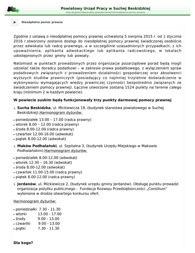 Powiatowy Urząd Pracy w Suchej Beskidzkiej http://pupsuchabeskidzka.pl/wydarzenie/52/nieodplatna-pomoc-prawna Nieodpłatna pomoc prawna Zgodnie z ustawą o nieodpłatnej pomocy prawnej uchwaloną 5 sierpnia 2015 r. od 1 stycznia 2016 r.stworzony zostanie dostęp do nieodpłatnej pomocy prawnej świadczonej osobiście przez adwokata lub radcę prawnego, a w szczególnie uzasadnionych przypadkach, z ich upoważnienia, aplikanta adwokackiego lub aplikanta radcowskiego, w lokalach udostępnionych przez gminy lub powiaty. Natomiast w punktach prowadzonych przez organizacje pozarządowe porad będą mogli udzielać także doradcy podatkowi – w zakresie prawa podatkowego, z wyłączeniem spraw podatkowych związanych z prowadzeniem działalności gospodarczej oraz absolwenci wyższych studiów prawniczych (posiadający co najmniej trzyletnie doświadczenie w wykonywaniu wymagających wiedzy prawniczej czynności bezpośrednio związanych ze świadczeniem pomocy prawnej). Łącznie utworzone zostaną 1524 punkty na terenie całego kraju (minimum 2 w każdym powiecie). W powiecie suskim będą funkcjonowały trzy punkty darmowej pomocy prawnej 1. ● ● ● ● ● poniedziałek 13.00 – 17.00 (radca prawny) wtorek 8.00 – 12.00 (radca prawny) środa 8.00-12.00 (radca prawny) czwartek 12.00-16.00 (adwokat) piątek 8.00-12.00 (adwokat) 1. ● ● ● ● ● Sucha Beskidzka, ul. Mickiewicza 19, (budynek starostwa powiatowego w Suchej Beskidzkiej).Harmonogram dyżurów: Maków Podhalański, ul. Szpitalna 3, (budynek Urzędu Miejskiego w Makowie Podhalańskim).Harmonogram dyżurów: poniedziałek 8.00-12.00 (adwokat) wtorek 12.30 – 16.30 (adwokat) środa 8.00-12.00 (adwokat) czwartek 11.00-15.00 (radca prawny) piątek 8.00-12.00 (radca prawny) 1. Jordanów, ul. Mickiewicza 2, (budynek urzędu gminy Jordanów). Obsługę punktu prowadzi organizacja pożytku publicznego - Fundacja Rozwoju Przedsiębiorczości „Consilium” wyłoniona w drodze otwartego konkursu ofert. Harmonogram dyżurów: ● ● ● ● ● poniedziałki 7.30 - 11.30 wtorki 13.00 - 17.00 środy 9.00 - 13.00 czwartki 9.00 - 13.00 piątki 7.30 - 11.30 Dla kogo? Ustawa zakłada, że darmową pomoc prawną (na etapie przedsądowym) otrzymają: ● ● ● ● ● ● ● osoby, które nie ukończyły 26. roku życia, osoby fizyczne, którym w okresie roku poprzedzającego zostało przyznane świadczenie z pomocy społecznej. osoby, które ukończyły 65. lat, osoby posiadające ważną Kartę Dużej Rodziny, kombatanci, weterani, zagrożeni lub poszkodowani katastrofą naturalną, klęską żywiołową lub awarią techniczną. Co obejmuje? Pomoc prawna będzie polegała na: ● ● ● ● poinformowaniu osoby uprawnionej o obowiązującym stanie prawnym, przysługujących jej uprawnieniach lub spoczywających na niej obowiązkach; wskazaniu osobie uprawnionej sposobu rozwiązania jej problemu prawnego; pomocy w sporządzeniu projektu pisma w zakresie niezbędnym do udzielenia pomocy, z wyłączeniem pism procesowych w toczącym się postępowaniu przygotowawczym lub sądowym i pism w toczącym się postępowaniu sądowo-administracyjnym; sporządzeniu projektu pisma o zwolnienie od kosztów sądowych lub o ustanowienie pełnomocnika z urzędu w postępowaniu sądowym lub ustanowienie adwokata, radcy prawnego, doradcy podatkowego lub rzecznika patentowego w postępowaniu sądowo-administracyjnym. Jakiego zakresu prawa dotyczyć będzie nieodpłatna pomoc prawna? Uprawnieni będą mogli uzyskać informacje w zakresie: ● ● ● ● ● ● ● ● prawa pracy przygotowania do rozpoczęcia działalności gospodarczej, prawa cywilnego, prawa karnego, prawa administracyjnego, prawa ubezpieczeń społecznych, prawa rodzinnego, prawa podatkowego z wyłączeniem spraw podatkowych związanych z prowadzeniem działalności gospodarczej. Pomoc nie będzie natomiast obejmowała spraw z zakresu prawa celnego, dewizowego, handlowego i działalności gospodarczej, z wyjątkiem przygotowywania do jej rozpoczęcia. Źródło: /www.suchabeskidzka.bip.info.pl/