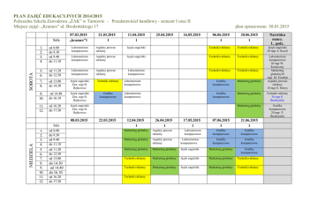 PLAN ZAJĘĆ EDUKACYJNYCH 2014/2015 Policealna Szkoła Zawodowa „ŻAK” w Tarnowie - Przedstawiciel handlowy - semestr I oraz II Miejsce zajęć: „Kramex” ul. Brodzińskiego 17 SOBOTA Sala 07.03.2015 „kramex”1 21.03.2015 1 11.04.2015 1 16.05.2015 06.06.2015 1 20.06.2015 1 Nazwiska naucz. L. godz. 1. 2. 3. 4. od 8.00 do 9.30 od 9.40 do 11.10 Laboratorium komputerowe Aspekty prawne reklamy Język angielski Techniki reklamy Techniki reklamy Język angielski 20 mgr A. Kocoł Laboratorium komputerowe Aspekty prawne reklamy Język angielski Techniki reklamy Techniki reklamy 5. 6. od 11.20 do 12.50 Laboratorium komputerowe Aspekty prawne reklamy Laboratorium komputerowe Techniki reklamy Techniki reklamy 7. 8. od 13.00 do 14.30 Język angielski Zast. mgr D. Rejkowicz Techniki reklamy Laboratorium komputerowe Grafika komputerowa Marketing globalny Laboratorium komputerowe 20 mgr W. Konieczny Marketing globalny30 mgr M. Fendryk Aspekty prawne reklamy 10 mgr E. Morys 9. 10. od 14.40 do 16.10 Język angielski Zast. mgr D. Rejkowicz Grafika komputerowa Laboratorium komputerowe Grafika komputerowa Marketing globalny Techniki reklamy 30 mgr P. Burdzyński 11. 12. od 16.20 do 17.50 Język angielski Zast. mgr D. Rejkowicz Marketing globalny Grafika komputerowa 20 mgr P. Burdzyński 08.03.2015 Sala NIEDZIELA 25.04.2015 plan opracowano 30.01.2015 1. 2. 3. 4. 5. 6. 7. 8. 9. 10. 11. 12. 22.03.2015 12.04.2015 1 26.04.2015 1 17.05.2015 1 07.06.2015 1 21.06.2015 1 Laboratorium komputerowe Grafika komputerowa Grafika komputerowa od 8.00 do 9.30 od 9.40 do 11.10 Marketing globalny Aspekty prawne reklamy Marketing globalny Aspekty prawne reklamy Laboratorium komputerowe Grafika komputerowa Grafika komputerowa od 11.20 do 12.50 od 13.00 Marketing globalny Marketing globalny Język angielski Marketing globalny Grafika komputerowa Techniki reklamy Marketing globalny Język angielski Marketing globalny Techniki reklamy Techniki reklamy Marketing globalny Język angielski Marketing globalny Techniki reklamy do 14.30 od 14.40 do 16.10 od 16.20 do 17.50 Techniki reklamy