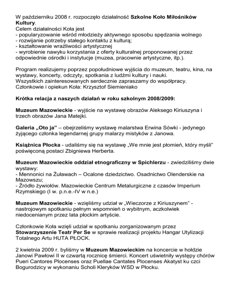W październiku 2008 r. rozpoczęło działalność Szkolne Koło Miłośników Kultury. Celem działalności Koła jest - popularyzowanie wśród młodzieży aktywnego sposobu spędzania wolnego - rozwijanie potrzeby stałego kontaktu z kulturą; - kształtowanie wrażliwości artystycznej - wyrobienie nawyku korzystania z oferty kulturalnej proponowanej przez odpowiednie ośrodki i instytucje (muzea, pracownie artystyczne, itp.). Program realizujemy poprzez popołudniowe wyjścia do muzeum, teatru, kina, na wystawy, koncerty, odczyty, spotkania z ludźmi kultury i nauki. Wszystkich zainteresowanych serdecznie zapraszamy do współpracy. Członkowie i opiekun Koła: Krzysztof Siemieniako Krótka relacja z naszych działań w roku szkolnym 2008/2009: Muzeum Mazowieckie - wyjście na wystawę obrazów Aleksego Kiriuszyna i trzech obrazów Jana Matejki. Galeria „Oto ja” – obejrzeliśmy wystawę malarstwa Erwina Sówki - jedynego żyjącego członka legendarnej grupy malarzy mistyków z Janowa. Książnica Płocka - udaliśmy się na wystawę „We mnie jest płomień, który myśli” poświęconą postaci Zbigniewa Herberta. Muzeum Mazowieckie oddział etnograficzny w Spichlerzu - zwiedziliśmy dwie wystawy: - Mennonici na Żuławach – Ocalone dziedzictwo. Osadnictwo Olenderskie na Mazowszu; - Źródło żywiołów. Mazowieckie Centrum Metalurgiczne z czasów Imperium Rzymskiego (I w. p.n.e.-IV w n.e.) Muzeum Mazowieckie - wzięliśmy udział w „Wieczorze z Kiriuszynem” nastrojowym spotkaniu pełnym wspomnień o wybitnym, aczkolwiek niedocenianym przez lata płockim artyście. Członkowie Koła wzięli udział w spotkaniu zorganizowanym przez Stowarzyszenie Teatr Per Se w sprawie realizacji projektu Hangar Utylizacji Totalnego Artu HUTA PŁOCK. 2 kwietnia 2009 r. byliśmy w Muzeum Mazowieckim na koncercie w hołdzie Janowi Pawłowi II w czwartą rocznicę śmierci. Koncert uświetniły występy chórów Pueri Cantores Plocenses oraz Puellae Cantates Plocenses Akatyst ku czci Bogurodzicy w wykonaniu Scholi Kleryków WSD w Płocku. Z Broniewskim przez Płock Z Władysławem Broniewskim po Płocku to piękna, biograficzna wycieczka na którą można zaprosić zarówno dzieci z przedszkola jak i uczniów z podstawówki, gimnazjum czy szkoły średniej. Jest to doskonała okazja, aby nie tylko poznać szczegóły biograficzne poety, ale także historię Płocka oraz piękno krajobrazu malowniczo położonego na Wzgórzu Tumskim miasta. Dla najmłodszych dzieci spacer śladami Broniewskiego wiódłby ulicą Kościuszki do domu, w którym urodził się i mieszkał poeta, następnie pod pomnik odsłonięty w dziesiątą rocznicę śmierci. Tam właśnie posłuchalibyśmy recytacji wierszy piewcy Mazowsza przeznaczonych dla dzieci Każdy chciałby mieć pamiątkowe zdjęcie przy pomniku wielkiego Płocczanina, a więc chwila dla fotografa. Następnie z Tumskiej Góry popatrzylibyśmy na Wisłę i Tumy tak, jak ongiś patrzył mały Władek. Brzegiem Wisły idziemy do kościoła na Górkach, Katedry i siedziby TNP, gdzie znajduje się najwięcej pamiątek po poecie w postaci licznych rękopisów i zdjęć. Koniec trasy to Liceum im. Władysława Jagiełły, gdzie znajduje się informacja o tym, że Broniewski był uczniem tej szkoły, ówczesnego Gimnazjum Polskiego Polskiej Macierzy Szkolnej. Dla chcących bardziej szczegółowo zapoznać się ze wszystkimi śladami poety w naszym mieście, np. dla młodzieży gimnazjum czy szkoły średniej, spacer powinien wyglądać inaczej. Musimy cofnąć się w czasie do przełomu XIX i XX w., by ujrzeć ulice i domy starego Płocka. Idąc przez Starówkę zatrzymujemy się przy dawnej ulicy Warszawskiej 12 (dziś Kościuszki 24), gdzie znajduje się dom Broniewskiego (obecnie siedziba ZNP). Tu poznajemy sagę rodu Lubowidzkich i Broniewskich. Właścicielami posesji, gdzie urodził się i mieszkał do 17 lat poeta, był jego dziadek Antoni Lubowidzki. Tu odbyło się wesele Zofii Lubowidzkiej z Antonim Broniewskim (babka i dziadek poety), tu urodziły się ich dzieci: dwie córki Janina i Zofia oraz syn Władysław ( przyszedł na świat 17.XII.1897 r.). Poeta opowiadał, że na ścianie w salonie wisiały fotografie dwóch braci jego babki Lubowidzkiej – Waleriana i Romualda, którzy zginęli w Powstaniu Styczniowym, najczęściej wspominał babkę Jadwigę Lubowidzką, której był przybranym wnukiem. To ona odegrała największą rolę w życiu Władka, miała wielki wpływ na wychowanie i ukształtowanie jego osobowości. Podtrzymywała tradycje rodzinne, rozbudzała miłość do ojczyzny, wpajała mu poczucie szacunku do ludzi. To ona nauczyła go gry na fortepianie i rozumienia piękna muzyki. „Babka zauważyła, że ma słuch. I tu zaczęła się moja męka a w rezultacie rozkosz. Posadziła mnie do fortepianu, no i: „Władziu graj.”.... Pierwsze dwa tygodnie jakoś to znosiłem.... Potem zacząłem uciekać pod fortepian, a babka – haps mnie za nogę i dalej „Władziu graj”. Kiedyś wróciła po nieszporach – grała różne rzeczy ... Szumana, Szuberta i właśnie Szopena – Mazurka h-moll. Wtedy, ośmioletni chłopak, pojęcia nie miałem o żadnych opusach, tylko słuchałem mazurka. Po raz pierwszy polubiłem muzykę, która przestała być dla mnie uciążliwym ćwiczeniem, a stała się radością, czymś niewiadomym. I powiedziałem: „Babciu, będę się uczył grać”1 Na ścianie w salonie wisiał także portret poety z roku 1921 przedstawiający Władysława w mundurze kapitana opartego o fotel, na którym siedziała babka Lubowidzka, dumna z bohaterskiego wnuka. Wychodzimy z domu do ogrodu i zatrzymujemy się przy kilkusetletnim dębie – bohaterze wielu utworów poetyckich. Drzewo to rozbudzało jego dziecięcą wyobraźnię o przeszłości i stało się symbolem siły i tradycji. Po II wojnie światowej, po powrocie z tułaczki więziennej ilekroć poeta był w Płocku odwiedzał dom, stawał i dumał pod