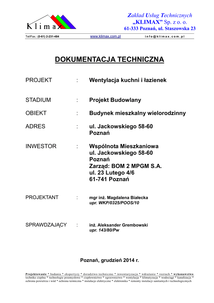 Zakład Usług Technicznych „KLIMAX” Sp. z o. o. 61-333 Poznań, ul. Staszowska 23 www.klimax.com.pl Tel/Fax.: (0-61) 2-231-484 [email protected] DOKUMENTACJA TECHNICZNA PROJEKT : Wentylacja kuchni i łazienek STADIUM : Projekt Budowlany OBIEKT : Budynek mieszkalny wielorodzinny ADRES : ul. Jackowskiego 58-60 Poznań INWESTOR : Wspólnota Mieszkaniowa ul. Jackowskiego 58-60 Poznań Zarząd: BOM 2 MPGM S.A. ul. 23 Lutego 4/6 61-741 Poznań PROJEKTANT : mgr inż. Magdalena Białecka upr. WKP/0325/POOS/10 SPRAWDZAJĄCY : inż. Aleksander Grembowski upr. 143/80/Pw Poznań, grudzień 2014 r. Projektowanie * badania * ekspertyzy * doradztwo techniczne * inwentaryzacja * wdrażanie * rozruch * wykonawstwo technika cieplna * technologie przemysłowe * ciepłownictwo * ogrzewnictwo * wentylacja * klimatyzacja * wodociągi * kanalizacja * ochrona powietrza i wód * ochrona termiczna * instalacje elektryczne * elektronika * remonty instalacji sanitarnych i technologicznych Projekt budowlany – WENTYLACJA KUCHNI I ŁAZIENEK Budynek mieszkalny wielorodzinny ul. Jackowskiego 58-60 Poznań Spis treści 1. Dane ogólne ............................................................................................................................... 3 1.1. Przedmiot opracowania ..................................................................................................... 3 1.2. Podstawa opracowania ...................................................................................................... 3 1.3. Zakres opracowania........................................................................................................... 3 2. Opis stanu istniejącego ............................................................................................................. 3 3. Projektowane rozwiązanie techniczne .................................................................................... 3 3.1. Wywiew powietrza ............................................................................................................ 3 3.2. Nawiew powietrza ............................................................................................................. 8 4. Uwagi końcowe.......................................................................................................................... 9 Załączniki 1. Opinia kominiarska nr 83/2014 z okresowej kontroli przewodów kominowych – Zakład Kominiarski Szymon Dudziak 2. Uprawnienia projektanta i sprawdzającego 3. Oświadczenie projektanta i sprawdzającego 4. Informacja dotycząca bezpieczeństwa i ochrony zdrowia Zestawienie rysunków 1. Wentylacja kuchni i łazienek – rzut parteru 2. Wentylacja kuchni i łazienek – rzut I piętra 3. Wentylacja kuchni i łazienek – rzut II piętra 4. Wentylacja kuchni i łazienek – poddasza 5. Widok elewacji frontowej 6. Widok elewacji tylnej 7. Schemat podłączeń kominowych – Jackowskiego 58 8. Schemat podłączeń kominowych – Jackowskiego 60 skala 1 : 100 1 : 100 1 : 100 1 : 100 1 : 100 1 : 100 - 2 Projekt sporządził: Zakład Usług Technicznych "KLIMAX" Sp. z o.o. Projekt budowlany – WENTYLACJA KUCHNI I ŁAZIENEK Budynek mieszkalny wielorodzinny ul. Jackowskiego 58-60 Poznań 1. Dane ogólne 1.1. Przedmiot opracowania Przedmiotem opracowania jest projekt budowlany wentylacji kuchni i łazienek (wc) w mieszkaniach bez wentylacji w/w pomieszczeń. 1.2. Podstawa opracowania • Zlecenie Inwestora. • Archiwalne podkłady architektoniczno – budowlane. • Wizja lokalna. • Katalogi urządzeń. • Obowiązujące przepisy i normy. 1.3. Zakres opracowania Zakres projektu obejmuje wentylację kuchni i łazienek (wc) w mieszkaniach bez wentylacji w/w pomieszczeń poprzez dobudowę przewodów wentylacyjnych i/lub podłączenie do istniejących wolnych murowanych przewodów kominowych oraz zapewnienie prawidłowego nawiewu powietrza zewnętrznego. 2. Opis stanu istniejącego W przedmiotowym budynku wentylacja kuchni i łazienek realizowana jest przez istniejące murowane piony kominowe. Nie we wszystkich pomieszczeniach kuchni i łazienek zapewniona jest wentylacji wywiewna. W mieszkaniach brak wentylacji nawiewnej zapewniającej wymianę powietrza. W części mieszkań w ścianie pomiędzy łazienką i wc zamontowane jest naświetle. 3. Projektowane rozwiązanie techniczne 3.1. Wywiew powietrza W pomieszczeniach higieniczno – sanitarnych typu: kuchni i łazienka (wc), w poszczególnych mieszkaniach, w których nie ma wentylacji, projektuje się podłączenie wentylacji pomieszczeń do projektowanych indywidualnych przewodów wentylacyjnych lub do istniejących wolnych przewodów kominowych. Jackowskiego 58 mieszkanie 1 – istniejąca wentylacja kuchni podłączona do przewodu kominowego nr 1 w pionie kominowym nr 7. Istniejąca wentylacja łazienki podłączona do przewodu kominowego nr 1 w pionie kominowym nr 6. Powierzchnia kratki wentylacyjnej powinna wynosić min. 200 cm2 oraz powinna być zamontowana maksymalnie 15 cm (górna krawędź) od sufitu. W ścianie miedzy łazienką i wc zdemontować naświetle. Ścianę wykonać do wysokości 2,1 m. Jackowskiego 58 mieszkanie 2 – istniejąca wentylacja kuchni podłączona do przewodu ` 3 Projekt sporządził: Zakład Usług Technicznych "KLIMAX" Sp. z o.o. Projekt budowlany – WENTYLACJA KUCHNI I ŁAZIENEK Budynek mieszkalny wielorodzinny ul. Jackowskiego 58-60 Poznań kominowego nr 8 w pionie kominowym nr 5. Wentylację łazienki podłączyć do przewodu nr 6 w pionie kominowym nr 5 po uprzednim odłączeniu wentylacji łazienki w mieszkaniu 10 oraz udrożnieniu przewodu kominowego. Wentylację w mieszkaniu 10 podłączyć do projektowanego przewodu nr 1. Podłączenie wentylacji do istniejącego pionu kominowego wykonać poprzez montaż kratki wentylacyjnej. Powierzchnia kratek wentylacyjnych projektowanej i istniejącej powinna wynosić min. 200 cm2 oraz powinna być zamontowana maksymalnie 15 cm (górna krawędź) od sufitu. Jackows