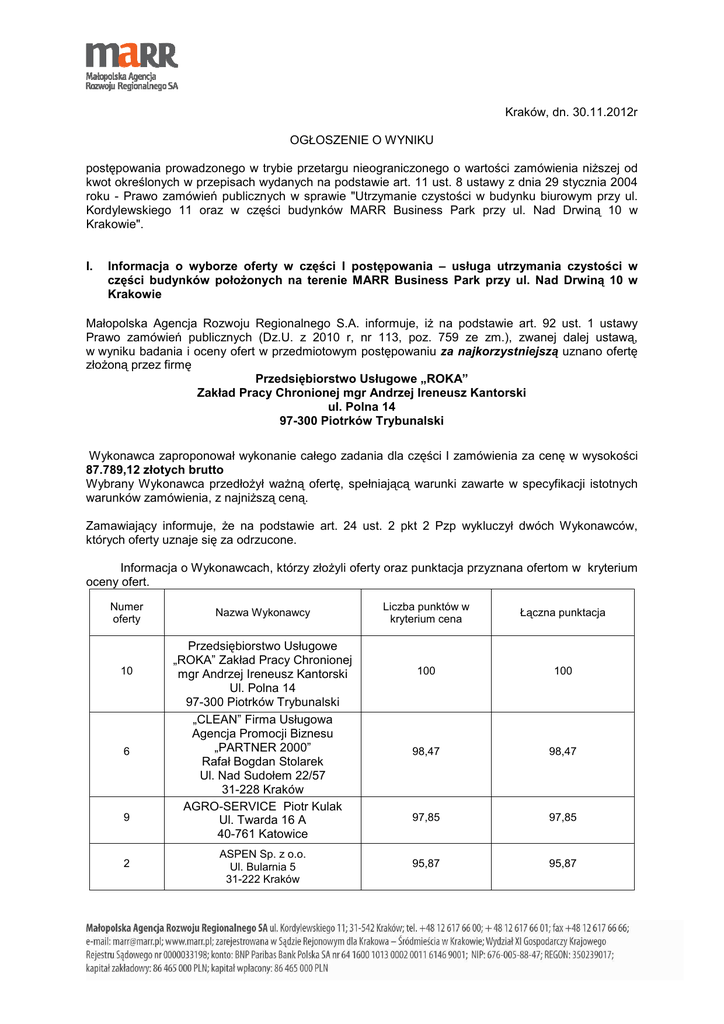 Kraków, dn. 30.11.2012r OGŁOSZENIE O WYNIKU postępowania prowadzonego w trybie przetargu nieograniczonego o wartości zamówienia niŜszej od kwot określonych w przepisach wydanych na podstawie art. 11 ust. 8 ustawy z dnia 29 stycznia 2004 roku - Prawo zamówień publicznych w sprawie "Utrzymanie czystości w budynku biurowym przy ul. Kordylewskiego 11 oraz w części budynków MARR Business Park przy ul. Nad Drwiną 10 w Krakowie". I. Informacja o wyborze oferty w części I postępowania – usługa utrzymania czystości w części budynków połoŜonych na terenie MARR Business Park przy ul. Nad Drwiną 10 w Krakowie Małopolska Agencja Rozwoju Regionalnego S.A. informuje, iŜ na podstawie art. 92 ust. 1 ustawy Prawo zamówień publicznych (Dz.U. z 2010 r, nr 113, poz. 759 ze zm.), zwanej dalej ustawą, w wyniku badania i oceny ofert w przedmiotowym postępowaniu za najkorzystniejszą uznano ofertę złoŜoną przez firmę Przedsiębiorstwo Usługowe „ROKA” Zakład Pracy Chronionej mgr Andrzej Ireneusz Kantorski ul. Polna 14 97-300 Piotrków Trybunalski Wykonawca zaproponował wykonanie całego zadania dla części I zamówienia za cenę w wysokości 87.789,12 złotych brutto Wybrany Wykonawca przedłoŜył waŜną ofertę, spełniającą warunki zawarte w specyfikacji istotnych warunków zamówienia, z najniŜszą ceną. Zamawiający informuje, Ŝe na podstawie art. 24 ust. 2 pkt 2 Pzp wykluczył dwóch Wykonawców, których oferty uznaje się za odrzucone. Informacja o Wykonawcach, którzy złoŜyli oferty oraz punktacja przyznana ofertom w kryterium oceny ofert. Numer oferty 10 6 9 2 Nazwa Wykonawcy Przedsiębiorstwo Usługowe „ROKA” Zakład Pracy Chronionej mgr Andrzej Ireneusz Kantorski Ul. Polna 14 97-300 Piotrków Trybunalski „CLEAN” Firma Usługowa Agencja Promocji Biznesu „PARTNER 2000” Rafał Bogdan Stolarek Ul. Nad Sudołem 22/57 31-228 Kraków AGRO-SERVICE Piotr Kulak Ul. Twarda 16 A 40-761 Katowice ASPEN Sp. z o.o. Ul. Bularnia 5 31-222 Kraków Liczba punktów w kryterium cena Łączna punktacja 100 100 98,47 98,47 97,85 97,85 95,87 95,87 8 ERA Sp. z o.o. Ul. Katowicka 16 B 41-500 Chorzów 85,75 85,75 4 Zakłady Usługowe „EZT” S.A. Ul. Modrzewiowa 7 41-219 Sosnowiec 60,57 60,57 1 Outsourcing Direct Marek Wyrwicz ul. Centralna 43B/4 31-586 Kraków Oferta odrzucona 5 Firma Handlowo-Usługowa KAMIR Monika Chwajoł Ul. Kołowa 7/62 30-134 Kraków Oferta odrzucona Na podstawie art. 92 ust. 1 pkt. 4 w zw. z art. 94 ust. 1 pkt. 2 Ustawy, Zamawiający informuje, Ŝe umowa w sprawie zamówienia publicznego moŜe być zawarta w terminie nie krótszym niŜ 5 dni od dnia przesłania zawiadomienia o wyborze oferty najkorzystniejszej, jeŜeli zawiadomienie to zostało przesłane w sposób określony w art. 27 ust. 2 Ustawy. II. Informacja o wyborze oferty w części II postępowania – utrzymanie czystości w budynku biurowym oraz terenu przyległego do budynku biurowego połoŜonego przy ul. Kordylewskiego 11 w Krakowie. Małopolska Agencja Rozwoju Regionalnego S.A. informuje, iŜ na podstawie art. 92 ust. 1 ustawy Prawo zamówień publicznych (Dz.U. z 2010 r, nr 113, poz. 759 ze zm.), zwanej dalej ustawą, w wyniku badania i oceny ofert w przedmiotowym postępowaniu za najkorzystniejszą uznano ofertę złoŜoną przez firmę Przedsiębiorstwo Usługowe „ROKA” Zakład Pracy Chronionej mgr Andrzej Ireneusz Kantorski Ul. Polna 14 97-300 Piotrków Trybunalski Wykonawca zaproponował wykonanie całego zadania dla części II zamówienia za cenę w wysokości 328.579,99 złotych brutto Wybrany Wykonawca przedłoŜył waŜną ofertę, spełniającą warunki zawarte w specyfikacji istotnych warunków zamówienia, z najniŜszą ceną. Informacja o Wykonawcach, którzy złoŜyli oferty oraz punktacja przyznana ofertom w kryterium oceny ofert. Numer oferty Nazwa Wykonawcy Liczba punktów w kryterium cena Łączna punktacja 10 Przedsiębiorstwo Usługowe „ROKA” Zakład Pracy Chronionej mgr Andrzej Ireneusz Kantorski Ul. Polna 14 97-300 Piotrków Trybunalski 100 100 9 AGRO-SERVICE Piotr Kulak Ul. Twarda 16 A 40-761 Katowice 96,23 96,23 11 6 7 4 8 2 3 Aleksandra Zajfert Firma Zajfert Ul. Gersona 8 42-202 Częstochowa „CLEAN” Firma Usługowa Agencja Promocji Biznesu „PARTNER 2000” Rafał Bogdan Stolarek Ul. Nad Sudołem 22/57 31-228 Kraków Firma Handlowo-Usługowa „BŁYSK” 32-098 WęŜerów 84 Zakłady Usługowe „EZT” S.A. Ul. Modrzewiowa 7 41-219 Sosnowiec ERA Sp. z o.o. Ul. Katowicka 16 B 41-500 Chorzów ASPEN Sp. z o.o. Ul. Bularnia 5 31-222 Kraków MAXUS Sp. z o.o. Sp. komandytowa Ul. Brogi 2 31-431 Kraków 71,70 71,70 70,43 70,43 63,86 63,86 53,90 53,90 48,78 48,78 40,22 40,22 24,43 24,43 Na podstawie art. 92 ust. 1 pkt. 4 w zw. z art. 94 ust. 1 pkt. 2 Ustawy, Zamawiający informuje, Ŝe umowa w sprawie zamówienia publicznego moŜe być zawarta w terminie nie krótszym niŜ 5 dni od dnia przesłania zawiadomienia o wyborze oferty najkorzystniejszej, jeŜeli zawiadomienie to zostało przesłane w sposób określony w art. 27 ust. 2 Ustawy.