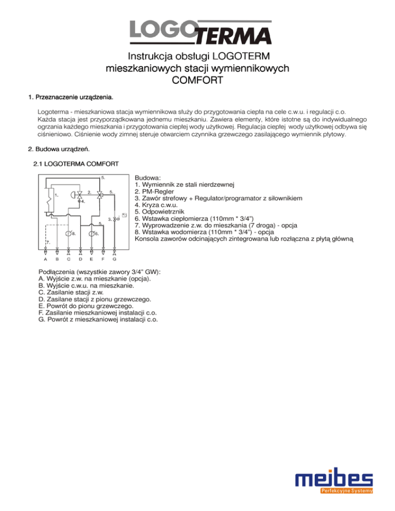 Instrukcja obsługi LOGOTERM mieszkaniowych stacji wymiennikowych COMFORT 1. Przeznaczenie urządzenia. Logoterma - mieszkaniowa stacja wymiennikowa służy do przygotowania ciepła na cele c.w.u. i regulacji c.o. Każda stacja jest przyporządkowana jednemu mieszkaniu. Zawiera elementy, które istotne są do indywidualnego ogrzania każdego mieszkania i przygotowania ciepłej wody użytkowej. Regulacja ciepłej wody użytkowej odbywa się ciśnieniowo. Ciśnienie wody zimnej steruje otwarciem czynnika grzewczego zasilającego wymiennik płytowy. 2. Budowa urządzeń. 2.1 LOGOTERMA COMFORT Budowa: 1. Wymiennik ze stali nierdzewnej 2. PM-Regler 3. Zawór strefowy + Regulator/programator z siłownikiem 4. Kryza c.w.u. 5. Odpowietrznik 6. Wstawka ciepłomierza (110mm * 3/4”) 7. Wyprowadzenie z.w. do mieszkania (7 droga) - opcja 8. Wstawka wodomierza (110mm * 3/4”) - opcja Konsola zaworów odcinających zintegrowana lub rozłączna z płytą główną Podłączenia (wszystkie zawory 3/4” GW): A. Wyjście z.w. na mieszkanie (opcja). B. Wyjście c.w.u. na mieszkanie. C. Zasilanie stacji z.w. D. Zasilane stacji z pionu grzewczego. E. Powrót do pionu grzewczego. F. Zasilanie mieszkaniowej instalacji c.o. G. Powrót z mieszkaniowej instalacji c.o. 3. Zasada działania. Mechanizm działania systemu Logoterm polega na tym, że czynnik grzewczy płynie z niskotemperaturowego źródła ciepła (kotłowni lub węzła grzewczego) poprzez rozprowadzenie w piwnicy i piony do Logotermy w mieszkaniu. Z Logotermy w zależności od potrzeb czynnik grzewczy przesyłany jest do instalacji c.o. lub na wymiennik (w momencie poboru ciepłej wody uzytkowej). Nad rozdziałem ciepła na poszczególne obiegi czuwa regulator PM. Przygotowanie ciepłej wody użytkowej ma pierwszeństwo, to znaczy, że każde otwarcie kranu z ciepłą wodą kieruje cały strumień grzewczy z pionu na potrzeby przygotowania c.w.u. Zamknięcie kranu powoduje ponowne skierowanie ciepła na potrzeby c.o. Pomimo okresowego „wyłączania” centralnego ogrzewania nie powoduje to odczuwalnych strat komfortu cieplnego. 4. Obsługa urządzeń. urządzeń. 4.1.Ciepła woda użytkowa. Mieszkaniowa stacja wymiennikowa wyposażona jest w możliwość regulacji ilościowej wypływu ciepłej wody użytkowej. Regulacji tej można dokonać za pomocą kryzy dławiącej umieszczonej w regulatorze PM (ustawia serwisant urządzenia). Prawidłowe działanie stacji można skontrolować przez otwarcie kranu ciepłej wody i sprawdzenie temperatury oraz ilości 0 wypływającej wody (max. 12 l/min 55 C). W przypadku nieprawidłowego działania stacji należy sprawdzić czy otwarte są odpowiednie zawory, których przypadkowe zamkniecie może być przyczyną niedomagań ciepłej wody użytkowej oraz należy sprawdzić czystość filtra siatkowego w stacji. 4.2.Centralne ogrzewanie. Regulacja centralnego ogrzewania odbywa się za pośrednictwem zaworu strefowego i regulatora lub tygodniowego programatora pokojowego, które to urządzenia pozwalają na utrzymanie zadanej temperatury w pomieszczeniu. Po osiągnięciu tej temperatury regulator lub programator odcina zasilanie napędu powodując zamknięcie zaworu strefowego. Po wychłodzeniu czynnika grzewczego c.o. w grzejnikach temperatura zasilania c.o. spada poniżej zadanej, co powoduje ponowne otwieranie zaworu strefowego za pomocą napędu. W tym cyklu stacja pracuje aż do osiągnięcia zadanej temperatury w pomieszczeniu z zamontowanym pokojowym regulatorem lub programatorem temperatury. Ten system regulacyjny zapewnia optymalizacje zużycia ciepła według potrzeb użytkownika. Po zakończeniu sezonu grzewczego urządzenie powinno zostać odcięte od instalacji c.o. poprzez zamknięcie zaworów zasilania i powrotu c.o. lub ustawieniu na regulatorze lub programatorze temperatury niższej od panującej w pomieszczeniu. Przy uruchamianiu centralnego ogrzewania należy wykonać następujące czynności: a) otworzyć zawory zasilania i powrotu c.o., b) pokojowym regulatorem temperatury ustawić żądaną temperaturę w pomieszczeniu c) jeżeli instalacja c.o. nie działa prawidłowo należy sprawdzić czy temperatura zadana na pokojowym programatorze jest wyższa od temperatury panującej w pomieszczeniu, sprawdzić baterie i zasilanie z kotłowni. Regulacja temperatury w mieszkaniu odbywa się za pomocą pokojowego regulatora lub tygodniowego programatora temperatury (patrz instrukcja obsługi). 5. Rejestr możliwych niedomagań stacji cieplnej. Przy wszelkich pracach mogących doprowadzić do rozszczelnienia wewnętrznych obiegów hydraulicznych należy bezwzględnie odłączyć stację cieplną i poinformować administrację lub serwis. 5.1. Strona sieciowa stacji cieplnej. a) ciepłomierz wskazuje brak, lub zaniżony przepływ czynnika grzewczego po stronie sieciowej. - sprawdzić ciśnienie na zasilaniu i powrocie strony sieciowej - sprawdzić, czy wszystkie zawory po stronie sieciowej są otwarte 5.2. Ciepła woda użytkowa a) zaniżona temperatura ciepłej wody użytkowej - sprawdzić ciśnienie na zasilaniu i powrocie strony sieciowej - sprawdzić wskazania ciepłomierza b) brak wypływu ciepłej wody użytkowej - sprawdzić czy są otwarte zawory instalacji c.w.u. - sprawdzić czy budynek zasilany jest w zimna wodę 5.3. Instalacja centralnego ogrzewania a) zaniżona lub zawyżona temperatura instalacji c.o. - sprawdzić nastawienie regulatora lub programatora pokojowego - sprawdzić ciśnienie i temperaturę na zasilaniu stacji - sprawdzić stan baterii zasilających regulator pokojowy W celu polepszenia komfortu c.w.u., jak również w instalacjach, w których temperatura zasilania 0 przekracza 75 C, istnieje możliwość wyposażenia stacji ( bez możliwości późniejszego domówienia ) w mieszacz termostatyczny. 0 Mieszacz reguluje temp. c.w.u. od 30 do 60 C. Regulacja polega na ustawieniu pokrętła w wybranej pozycji dla osiągnięcia pożądanej c.w.u.. Na pokrętle wytłoczona jest ska