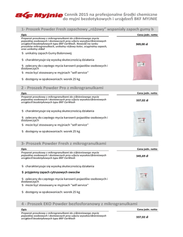 Cennik 2015 na profesjonalne środki chemiczne do myjni bezdotykowych i urządzeń BKF MYJNIE 1- Proszek Powder Fresh zapachowy „różowy” wspaniały zapach gumy b Opis Preparat proszkowy z mikrogranulkami do ciśnieniowego mycia pojazdów osobowych i dostawczych przy użyciu wysokociśnieniowych urządzeń bezdotykowych typu BKF CarWash. Nowość na rynku proszków mikrogranulkach, unikalny różowy kolor, oryginalny zapach, oraz unikalny skład Cena jedn. netto 369,00 zł § unikalny zapach Gumy Balonowej § charakteryzuje się wysoką skutecznością działania § zalecany do częstego mycia karoserii pojazdów osobowych i dostawczych § może być stosowany w myjniach "self service" § dostępny w opakowaniach: worek 25 kg 2 - Proszek Powder Pro z mikrogranulkami Opis Preparat proszkowy z mikrogranulkami do ciśnieniowego mycia pojazdów osobowych i dostawczych przy użyciu wysokociśnieniowych urządzeń bezdotykowych typu BKF CarWash Cena jedn. netto 337,02 zł § charakteryzuje się wysoką skutecznością działania § zalecany do częstego mycia karoserii pojazdów osobowych i dostawczych § może być stosowany w myjniach "self service" § dostępny w opakowaniach: worek 25 kg 3- Proszek Powder Fresh z mikrogranulkami Opis Preparat proszkowy z mikrogranulkami do ciśnieniowego mycia pojazdów osobowych i dostawczych przy użyciu wysokociśnieniowych urządzeń bezdotykowych typu BKF CarWash Cena jedn. netto 345,69 zł § charakteryzuje się wysoką skutecznością działania § przyjemny zapach cytrusowych owoców § zalecany do częstego mycia karoserii pojazdów osobowych i dostawczych § może być stosowany w myjniach "self service" § dostępny w opakowaniach: worek 25 kg 4 - Proszek EKO Powder bezfosforanowy z mikrogranulkami Opis Preparat proszkowy z mikrogranulkami do ciśnieniowego mycia pojazdów osobowych i dostawczych przy użyciu wysokociśnieniowych urządzeń bezdotykowych typu BKF CarWash Cena jedn. netto 337,02 zł § charakteryzuje się wysoką skutecznością działania § produkt ekologiczny - nie zawiera fosforanów § zalecany do częstego mycia karoserii pojazdów osobowych i dostawczych § może być stosowany w myjniach "self service" § dostępny w opakowaniach: worek 25 kg 5 - Turbo Cena jedn. netto Opis Alkaliczny produkt o wysokiej skuteczności działania. Polecany do mycia karoserii pojazdów mechanicznych, osobowych, terenowych oraz busów. 162,49 zł § może być stosowany w roztworach o różnym stężeniu § zalecany do myjni bezdotykowych BKF jako środek do programu TURBO OPRYSK § może być stosowany w myjniach "self service" § dostępny w opakowaniach: baniak 20 l 6 - Turbo MAX Cena jedn. netto Opis Wysoce skuteczny alkaliczny preparat myjący do karoserii samochodów osobowych, dostawczych, busów 178,96 zł § może być stosowany w roztworach o różnym stężeniu § zalecany do myjni bezdotykowych BKF jako środek do programu TURBO OPRYSK § może być stosowany w myjniach "self service" § dostępny w opakowaniach: baniak 20 l 7 - Wax Pro Opis Nabłyszczający, wysoko skoncentrowany impregnat polimerowy do pojazdów mechanicznych; przyspiesza proces suszenia; doskonale zabezpiecza lakiery samochodowe przed ujemnym działaniem czynników atmosferycznych (temperatura, wilgotność); zapewnia wyśmienity efekt odprowadzania wody z karoserii samochodu Cena jedn. netto 539,51 zł § wysycha samoczynnie, bez dodatkowego nadmuchu § zastosowanie: myjnie automatyczne, myjnie ręczne § dostępny w opakowaniach: baniak 20 l, opcjonalnie 10 l 8 - Alu Pro Opis Środek alkaliczny skoncentrowany do usuwania zanieczyszczeń spowodowanych eksploatacją, takich jak nalot z klocków hamulcowych z felg oraz kołpaków Cena jedn. netto 247,01 zł § produkt przeznaczony do częstego mycia między innymi jako środek zastosowany do myjni bezdotykowych BKF dla programu OPRYSK FELG § dostępny w opakowaniach: baniak 10 l, opcjonalnie 20 l 10 - Sól w tabletkach Opis Sól w tabletkach § dostępna w opakowaniach 25 kg *- Cennik obowiązuje od 1.09.2015 r. do 31.12.2015 r. Cena jedn. netto 37,35 zł