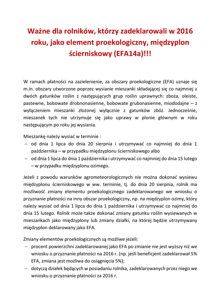 Ważne dla rolników, którzy zadeklarowali w 2016 roku, jako element proekologiczny, międzyplon ścierniskowy (EFA14a)!!! W ramach płatności na zazielenienie, za obszary proekologiczne (EFA) uznaje się m.in. obszary utworzone poprzez wysianie mieszanki składającej się co najmniej z dwóch gatunków roślin z następujących grup roślin uprawnych: zboża, oleiste, pastewne, bobowate drobnonasienne, bobowate grubonasienne, miododajne – z wyłączeniem mieszanki złożonej wyłącznie z gatunków zbóż. Jednocześnie, mieszanek tych nie utrzymuje się jako uprawy w plonie głównym w roku następującym po roku jej wysiania. Mieszankę należy wysiać w terminie : od dnia 1 lipca do dnia 20 sierpnia i utrzymywać co najmniej do dnia 1 października – w przypadku międzyplonu ścierniskowego albo od dnia 1 lipca do dnia 1 października i utrzymywać co najmniej do dnia 15 lutego – w przypadku międzyplonu ozimego. Jeżeli z powodu warunków agrometeorologicznych nie można dokonać wysiewu międzyplonu ścierniskowego w ww. terminie, tj. do dnia 20 sierpnia, rolnik ma możliwość zmiany elementu proekologicznego zadeklarowanego we wniosku o przyznanie płatności na inny obszar proekologiczny, np. na międzyplon ozimy, który należy wysiać od dnia 1 lipca do dnia 1 października i utrzymywać co najmniej do dnia 15 lutego. Rolnik może także dokonać zmiany gatunku roślin wysiewanych w mieszankach jako międzyplony lub zmiany działki, na której będzie utrzymywany międzyplon deklarowany jako EFA. Zmiany elementów proekologicznych są możliwe jeżeli: procent powierzchni zadeklarowanej jako EFA po zmianie nie jest wyższy niż we wniosku o przyznanie płatności na 2016 r. (np. jeśli beneficjent zadeklarował 5% EFA, zmiana jest możliwa do osiągnięcia 5%); dotyczą działek będących w posiadaniu rolnika, zadeklarowanych przez niego we wniosku o przyznanie płatności za 2016 r. O zmianach, które mogą być dokonywane w zakresie wszystkich rodzajów EFA, należy poinformować kierownika biura powiatowego Agencji Restrukturyzacji i Modernizacji Rolnictwa, właściwego ze względu na miejsce zamieszkania lub siedzibę rolnika, aby dostosować wniosek o przyznanie płatności do nowej sytuacji; zmiana nie będzie skutkowała nałożeniem kar administracyjnych związanych ze złożeniem zmiany po terminie lub niezrealizowaniem praktyki utrzymania obszarów proekologicznych. Ponadto, jeśli rolnik nie może dokonać wysiewu międzyplonu ścierniskowego w terminie określonym w przepisach, a jednocześnie posiada w swoim gospodarstwie więcej obszarów EFA, niż wymagane 5%, rolnik ma możliwość, w przypadku kontroli na miejscu, wskazania innych elementów EFA w gospodarstwie (niezadeklarowanych we wniosku o płatność na 2016 r.), w celu skompensowania nieobsianej powierzchni międzyplonu. Za niewypełnienie wymogu utrzymania obszarów proekologicznych, czyli np. brak międzyplonu w określonym terminie, na rolnika może zostać nałożona sankcja w postaci pomniejszenia płatności. Jednakże, jeśli beneficjent nie jest w stanie spełnić kryteriów kwalifikowalności lub innych obowiązków w wyniku działania siły wyższej lub wystąpienia nadzwyczajnych okoliczności, zachowuje on prawo do wsparcia w odniesieniu do obszaru, który był kwalifikowalny w chwili wystąpienia siły wyższej lub nadzwyczajnych okoliczności. W sprawie uznania wystąpienia siły wyższej jest kierownik biura powiatowego Agencji Restrukturyzacji i Modernizacji Rolnictwa, do którego, rolnicy zgłaszają na piśmie przypadki działania siły wyższej lub wystąpienia nadzwyczajnych okoliczności wraz z odpowiednimi dowodami wymaganymi przez właściwy organ w ciągu piętnastu dni roboczych od dnia, w którym beneficjent lub upoważniona przez niego osoba są w stanie dokonać tej czynności.