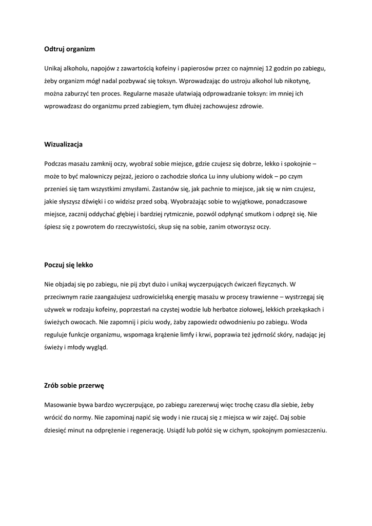 Odtruj organizm Unikaj alkoholu, napojów z zawartością kofeiny i papierosów przez co najmniej 12 godzin po zabiegu, żeby organizm mógł nadal pozbywad się toksyn. Wprowadzając do ustroju alkohol lub nikotynę, można zaburzyd ten proces. Regularne masaże ułatwiają odprowadzanie toksyn: im mniej ich wprowadzasz do organizmu przed zabiegiem, tym dłużej zachowujesz zdrowie. Wizualizacja Podczas masażu zamknij oczy, wyobraź sobie miejsce, gdzie czujesz się dobrze, lekko i spokojnie – może to byd malowniczy pejzaż, jezioro o zachodzie słooca Lu inny ulubiony widok – po czym przenieś się tam wszystkimi zmysłami. Zastanów się, jak pachnie to miejsce, jak się w nim czujesz, jakie słyszysz dźwięki i co widzisz przed sobą. Wyobrażając sobie to wyjątkowe, ponadczasowe miejsce, zacznij oddychad głębiej i bardziej rytmicznie, pozwól odpłynąd smutkom i odpręż się. Nie śpiesz się z powrotem do rzeczywistości, skup się na sobie, zanim otworzysz oczy. Poczuj się lekko Nie objadaj się po zabiegu, nie pij zbyt dużo i unikaj wyczerpujących dwiczeo fizycznych. W przeciwnym razie zaangażujesz uzdrowicielską energię masażu w procesy trawienne – wystrzegaj się używek w rodzaju kofeiny, poprzestao na czystej wodzie lub herbatce ziołowej, lekkich przekąskach i świeżych owocach. Nie zapomnij i piciu wody, żaby zapowiedz odwodnieniu po zabiegu. Woda reguluje funkcje organizmu, wspomaga krążenie limfy i krwi, poprawia też jędrnośd skóry, nadając jej świeży i młody wygląd. Zrób sobie przerwę Masowanie bywa bardzo wyczerpujące, po zabiegu zarezerwuj więc trochę czasu dla siebie, żeby wrócid do normy. Nie zapominaj napid się wody i nie rzucaj się z miejsca w wir zajęd. Daj sobie dziesięd minut na odprężenie i regenerację. Usiądź lub połóż się w cichym, spokojnym pomieszczeniu. Dostarcz witamin Powinieneś jeśd co najmniej pięd porcji owoców i warzyw dziennie, żeby pokryd zapotrzebowanie organizmu na witaminy, minerały i przeciwutleniacze. Witaminy A, B i C, których doskonałym źródłem są pomidory, owoce, warzywa liściowe i rzeżucha, odgrywają kluczową rolę w prawidłowym żywieniu. Podstawowe składniki odżywcze Kwasy tłuszczowe i pierwiastki – między innymi cynk i wapo – są niezbędne dla zdrowia skóry, kości, włosów i paznokci. Ryby i owoce morza, warzywa liściaste i orzechy są bogatym źródłem składników odżywczych, które mają dobroczynny wpływ na skórę. Spożywanie tłustych ryb, na przykład makreli i łososia, dostarczy ci budulca dla wszystkich komórek ciała. Pamiętaj o przeciwutleniaczach Skażenie środowiska, toksyny, alkohol, nikotyna i stres sprzyjają gromadzeniu wolnych rodników, których nadmiar może okazad się szkodliwy dla zdrowia. Żaby je zwalczyd, uwzględnij w jadłospisie produkty obfitujące w przeciwutleniacze, na przykład świeże owoce i warzywa, czosnek, cebulę, orzechy i ziarna zbóż.