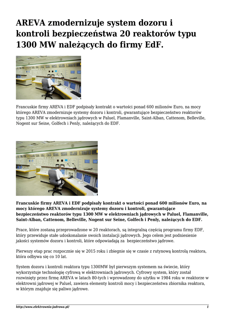 AREVA zmodernizuje system dozoru i kontroli bezpieczeństwa 20 reaktorów typu 1300 MW należących do firmy EdF. Francuskie firmy AREVA i EDF podpisały kontrakt o wartości ponad 600 milionów Euro, na mocy którego AREVA zmodernizuje systemy dozoru i kontroli, gwarantujące bezpieczeństwo reaktorów typu 1300 MW w elektrowniach jądrowych w Paluel, Flamanville, Saint-Alban, Cattenom, Belleville, Nogent sur Seine, Golfech i Penly, należących do EDF. Francuskie firmy AREVA i EDF podpisały kontrakt o wartości ponad 600 milionów Euro, na mocy którego AREVA zmodernizuje systemy dozoru i kontroli, gwarantujące bezpieczeństwo reaktorów typu 1300 MW w elektrowniach jądrowych w Paluel, Flamanville, Saint-Alban, Cattenom, Belleville, Nogent sur Seine, Golfech i Penly, należących do EDF. Prace, które zostaną przeprowadzone w 20 reaktorach, są integralną częścią programu firmy EDF, który przewiduje stałe udoskonalanie swoich instalacji jądrowych. Jego celem jest podniesienie jakości systemów dozoru i kontroli, które odpowiadają za bezpieczeństwo jądrowe. Pierwszy etap prac rozpocznie się w 2015 roku i zbiegnie się w czasie z rutynową kontrolą reaktora, która odbywa się co 10 lat. System dozoru i kontroli reaktora typu 1300MW był pierwszym systemem na świecie, który wykorzystuje technologię cyfrową w elektrowniach jądrowych. Cyfrowy system, który został rozwinięty przez firmę AREVA w latach 80-tych i wprowadzony do użytku w 1984 roku w reaktorze w elektrowni jądrowej w Paluel, zawiera elementy kontroli mocy i bezpieczeństwa zbiornika reaktora, w którym znajduje się paliwo jądrowe. http://www.elektrownia-jadrowa.pl/ 1 Firma AREVA, jako główny wykonawca, wykorzysta wieloletnie doświadczenie oraz współpracę ze swoim partnerem firmą Rolls Royce z siedzibą w Grenoble, w celu dostarczenia większości technologii związanej z niniejszym kontraktem. http://www.elektrownia-jadrowa.pl/ 2