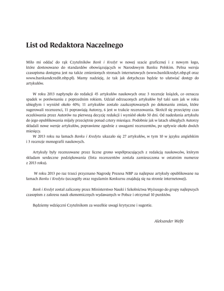 List od Redaktora Naczelnego Miło mi oddać do rąk Czytelników Bank i Kredyt w nowej szacie graficznej i z nowym logo, które dostosowano do standardów obowiązujących w Narodowym Banku Polskim. Pełna wersja czasopisma dostępna jest na także zmienionych stronach internetowych (www.bankikredyt.nbp.pl oraz www.bankandcredit.nbp.pl). Mamy nadzieję, że tak jak dotychczas będzie to ułatwiać dostęp do artykułów. W roku 2013 napłynęło do redakcji 45 artykułów naukowych oraz 3 recenzje książek, co oznacza spadek w porównaniu z poprzednim rokiem. Udział odrzuconych artykułów był taki sam jak w roku ubiegłym i wyniósł około 40%; 11 artykułów zostało zaakceptowanych po dokonaniu zmian, które sugerowali recenzenci, 11 poprawiają Autorzy, 6 jest w trakcie recenzowania. Skrócił się przeciętny czas oczekiwania przez Autorów na pierwszą decyzję redakcji i wyniósł około 50 dni. Od nadesłania artykułu do jego opublikowania mijały przeciętnie ponad cztery miesiące. Podobnie jak w latach ubiegłych Autorzy składali nowe wersje artykułów, poprawione zgodnie z uwagami recenzentów, po upływie około dwóch miesięcy. W 2013 roku na łamach Banku i Kredytu ukazało się 27 artykułów, w tym 10 w języku angielskim i 3 recenzje monografii naukowych. Artykuły były recenzowane przez liczne grono współpracujących z redakcją naukowców, którym składam serdeczne podziękowania (lista recenzentów została zamieszczona w ostatnim numerze z 2013 roku). W roku 2013 po raz trzeci przyznano Nagrodę Prezesa NBP za najlepsze artykuły opublikowane na łamach Banku i Kredytu (szczegóły oraz regulamin Konkursu znajdują się na stronie internetowej). Bank i Kredyt został zaliczony przez Ministerstwo Nauki i Szkolnictwa Wyższego do grupy najlepszych czasopism z zakresu nauk ekonomicznych wydawanych w Polsce i otrzymał 10 punktów. Będziemy wdzięczni Czytelnikom za wszelkie uwagi krytyczne i sugestie. Aleksander Welfe