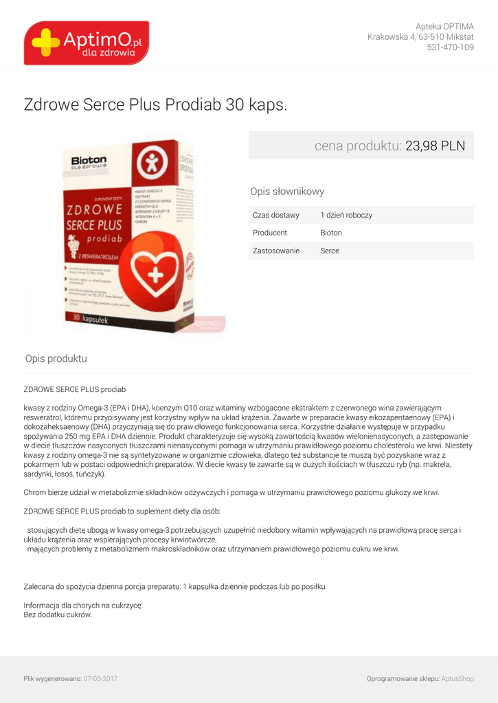 Apteka OPTIMA Krakowska 4, 63-510 Mikstat 531-470-109 Zdrowe Serce Plus Prodiab 30 kaps. cena produktu: 23,98 PLN Opis słownikowy Czas dostawy 1 dzień roboczy Producent Bioton Zastosowanie Serce Opis produktu ZDROWE SERCE PLUS prodiab kwasy z rodziny Omega-3 (EPA i DHA), koenzym Q10 oraz witaminy wzbogacone ekstraktem z czerwonego wina zawierającym resweratrol, któremu przypisywany jest korzystny wpływ na układ krążenia. Zawarte w preparacie kwasy eikozapentaenowy (EPA) i dokozaheksaenowy (DHA) przyczyniają się do prawidłowego funkcjonowania serca. Korzystne działanie występuje w przypadku spożywania 250 mg EPA i DHA dziennie. Produkt charakteryzuje się wysoką zawartością kwasów wielonienasyconych, a zastępowanie w diecie tłuszczów nasyconych tłuszczami nienasyconymi pomaga w utrzymaniu prawidłowego poziomu cholesterolu we krwi. Niestety kwasy z rodziny omega-3 nie są syntetyzowane w organizmie człowieka, dlatego też substancje te muszą być pozyskane wraz z pokarmem lub w postaci odpowiednich preparatów. W diecie kwasy te zawarte są w dużych ilościach w tłuszczu ryb (np. makrela, sardynki, łosoś, tuńczyk). Chrom bierze udział w metabolizmie składników odżywczych i pomaga w utrzymaniu prawidłowego poziomu glukozy we krwi. ZDROWE SERCE PLUS prodiab to suplement diety dla osób: stosujących dietę ubogą w kwasy omega-3,potrzebujących uzupełnić niedobory witamin wpływających na prawidłową pracę serca i układu krążenia oraz wspierających procesy krwiotwórcze, mających problemy z metabolizmem makroskładników oraz utrzymaniem prawidłowego poziomu cukru we krwi. Zalecana do spożycia dzienna porcja preparatu: 1 kapsułka dziennie podczas lub po posiłku. Informacja dla chorych na cukrzycę: Bez dodatku cukrów. Plik wygenerowano: 07-03-2017 Oprogramowanie sklepu: AptusShop Apteka OPTIMA Krakowska 4, 63-510 Mikstat 531-470-109 Skład zalecanej dziennej porcji: Składnik Zawartość w 1 kapsułce % ZDS* Olej rybi ,w tym 18 % EPA 12 % DHA 524,34 mg 94,4 mg 62,9 mg Koenzym Q10 30,0 mg Ekstrakt z czerwonego wina zawierający 30% resweratrolu 17,0 mg (5,10 mg resweratrolu) Witamina E (eqv. alfa- tokoferolu) 12,0 mg 100 Witamina B6 Plik wygenerowano: 07-03-2017 Oprogramowanie sklepu: AptusShop Apteka OPTIMA Krakowska 4, 63-510 Mikstat 531-470-109 1,4 mg 100 Witamina A (eqv. retinolu) 800 μg 100 Kwas foliowy 200 μg 100 Chrom 40,0 μg 100 Witamina B12 2,5 μg 100 Plik wygenerowano: 07-03-2017 Powered by TCPDF (www.tcpdf.org) Oprogramowanie sklepu: AptusShop