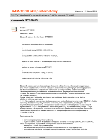 KAM-TECH sklep internetowy Utworzono : 21 listopad 2014 SYSTEMY ALARMOWE > sterowniki radiowe > ELMES > sterownik ST100HS sterownik ST100HS Model : sterownik ST100HS Producent : Elmes Sterownik radiowy do rolet i bram ST 100 HS � sterownik + dwa piloty - breloki w zestawie, � częstotliwość pracy 303MHz (433,92MHz), � zasięg do 50m (100m, 200m) w terenie otwartym, � wyjścia na silnik 230VAC z wbudowanymi wyłącznikami krańcowymi, � wyjście na lampę ostrzegawczą 5A/230V, � automatyczne zamykanie bramy po czasie, � maksymalna ilość pilotów: 12 (opcja 112). Sterownik przeznaczony jest do zdalnego sterowania roletą okienną, rolowaną bramą garażową oraz innymi urządzeniami, w których stosuje się bezkomutatorowy silnik prądu zmiennego (zaleca się stosowanie silników z wyłącznikami krańcowymi np. firmy SOMFY). Możliwe jest także użycie innych silników jednofazowych bezkomutatorowych, po jednym na każdy kierunek obrotów. Nie dopuszcza się stosowania silników komutatorowych z powodu wytwarzanych przez nie zakłóceń radiowych. Zestaw składa się z odbiornika sterującego pracą silnika w dwóch kierunkach oraz dwóch pilotów do zdalnego sterowania. ��� W urządzeniu wykorzystany jest zaawansowany system kodowania zmiennego KEELOQ�. Każda transmisja do odbiornika jest dynamicznie kodowana, inna niż poprzednia, a każdy pilot ma indywidualnie zaprogramowany, zabezpieczony przed odczytem kod. Ilość pilotów w zestawie jest ograniczona do 12 (112 dla wykonania z rozszerzoną pamięcią). Wprowadzenie do pamięci 13-tego skasuje pierwszy, 14-tego drugi, itd. Konieczność eliminacji z systemu skradzionego lub zgubionego pilota wymaga wyzerowanie pamięci odbiornika, a następnie wprowadzenia do niej każdego z pozostałych pilotów. Cechy sterownika: � sterowanie pojedynczą roletą lub bramą � wyprowadzone�zaciski do podłączenia napięcia zasilania sieciowego 230VAC, silnika 230VAC, lampy ostrzegawczej, wyłączników ściennych oraz sygnału z fotokomórki � współpraca z 1 albo 2 przyciskami pilota � sterowanie zewnętrzną lampą pełniącą funkcję ostrzegawczą albo oświetleniową � automatyczne zamykanie po upływie zaprogramowanego czasu PAUZY (1sek do 4min) kontakt : - [email protected] Strona 1 KAM-TECH sklep internetowy Utworzono : 21 listopad 2014 SYSTEMY ALARMOWE > sterowniki radiowe > ELMES > sterownik ST100HS sterownik ST100HS � automatyczne otwarcie rolety/bramy po zadziałaniu fotokomórki w czasie zamykania � przedłużenie czasu PAUZY, gdy zadziała fotokomórka SPECYFIKACJA: � � nadajnik: � transmisja radiowa: modulacja ASK z mocą poniżej 10mW � 433,92MHz � zasilanie baterią 12V� � wymiary obudowy (dł./szer./wys. w mm): 50/39/14� � odbiornik: � zasilanie sterownika: 230VAC, 2VA � wyjścia silnika: przekaźnikowe, 2 x NO, maks. 16A/250VAC � wymiary zewnętrzne (dł/szer/wys) 110/90/47mm � temperatura pracy od 0 do + 40�C � maksymalna ilość pilotów w pamięci jednego sterownika: 12 (opcja 112) � współpracuje z pilotami: UMB100H, AN200H, DWB100H, DW200H, CH4H, CH4H200 � wyjście na lampę: maks. 5A/250VAC � wejście na fotokomórkę typu NC (normalnie zwarta) � czas podtrzymania wyjść przekaźnikowych: 1 s do 4 min, wspólny dla zamykania i otwierania � czas PAUZY: 1 s do 4 min Sterownika nie należy instalować w miejscach narażonych na działanie czynników atmosferycznych. W celu zwiększenia zasięgu pracy pilotów można przewodem koncentrycznym przyłączyć do odbiornika antenę zewnętrzną prętową lub dipolową w miejsce przewodu antenowego na płytce odbiornika. Ekran przewodu lutować do masy w pobliżu wejścia antenowego. Sterownik powinien być zainstalowany złączem silnika do góry, a antenka powinna swobodnie zwisać. Przewodu antenowego nie wolno trwale mocować i kleić do ścian Cena : 190,65 zł Brutto ( 155,00 zł Netto) Dostępność: Produkt dostępny w naszym sklepie od 10 listopad 2005 kontakt : - [email protected] Strona 2