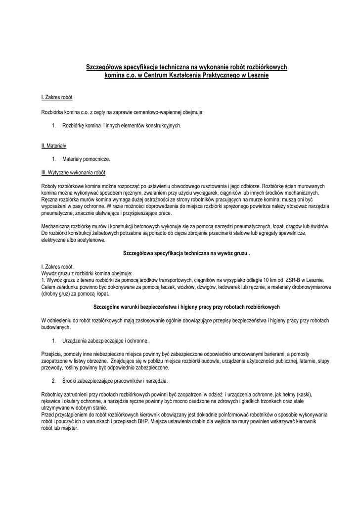 Szczegółowa specyfikacja techniczna na wykonanie robót rozbiórkowych komina c.o. w Centrum Kształcenia Praktycznego w Lesznie I. Zakres robót Rozbiórka komina c.o. z cegły na zaprawie cementowo-wapiennej obejmuje: 1. Rozbiórkę komina i innych elementów konstrukcyjnych. II. Materiały 1. Materiały pomocnicze. III. Wytyczne wykonania robót Roboty rozbiórkowe komina moŜna rozpocząć po ustawieniu obwodowego rusztowania i jego odbiorze. Rozbiórkę ścian murowanych komina moŜna wykonywać sposobem ręcznym, zwalaniem przy uŜyciu wyciągarek, ciągników lub innych środków mechanicznych. Ręczna rozbiórka murów komina wymaga duŜej ostroŜności ze strony robotników pracujących na murze komina; muszą oni być wyposaŜeni w pasy ochronne. W razie moŜności doprowadzenia do miejsca rozbiórki spręŜonego powietrza naleŜy stosować narzędzia pneumatyczne, znacznie ułatwiające i przyśpieszające prace. Mechaniczną rozbiórkę murów i konstrukcji betonowych wykonuje się za pomocą narzędzi pneumatycznych, łopat, drągów lub świdrów. Do rozbiórki konstrukcji Ŝelbetowych potrzebne są ponadto do cięcia zbrojenia przecinarki stalowe lub agregaty spawalnicze, elektryczne albo acetylenowe. Szczegółowa specyfikacja techniczna na wywóz gruzu . I. Zakres robót. Wywóz gruzu z rozbiórki komina obejmuje: 1. Wywóz gruzu z terenu rozbiórki za pomocą środków transportowych, ciągników na wysypisko odległe 10 km od ZSR-B w Lesznie. Celem załadunku powinno być dokonywane za pomocą taczek, wózków, dźwigów, ładowarek lub ręcznie, a materiały drobnowymiarowe (drobny gruz) za pomocą łopat. Szczególne warunki bezpieczeństwa i higieny pracy przy robotach rozbiórkowych W odniesieniu do robót rozbiórkowych mają zastosowanie ogólnie obowiązujące przepisy bezpieczeństwa i higieny pracy przy robotach budowlanych. 1. Urządzenia zabezpieczające i ochronne. Przejścia, pomosty inne niebezpieczne miejsca powinny być zabezpieczone odpowiednio umocowanymi barierami, a pomosty zaopatrzone w listwy obrzeŜne. Znajdujące się w pobliŜu miejsca rozbiórki budowle, urządzenia uŜyteczności publicznej, latarnie, słupy, przewody, rośliny powinny być odpowiednio zabezpieczone. 2. Środki zabezpieczające pracowników i narzędzia. Robotnicy zatrudnieni przy robotach rozbiórkowych powinni być zaopatrzeni w odzieŜ i urządzenia ochronne, jak hełmy (kaski), rękawice i okulary ochronne, a narzędzia ręczne powinny być mocno osadzone na zdrowych i gładkich trzonkach oraz stale utrzymywane w dobrym stanie. Przed przystąpieniem do robót rozbiórkowych kierownik obowiązany jest dokładnie poinformować robotników o sposobie wykonywania robót i pouczyć ich o warunkach i przepisach BHP. Miejsca ustawienia drabin dla wejścia na mury powinien wskazywać kierownik robót lub majster. 3. Wpływ warunków atmosferycznych na prowadzenie robót rozbiórkowych Przy wykonywaniu robót rozbiórkowych naleŜy uwzględnić wpływ na nie warunków atmosferycznych, jak np. deszczu, mrozu, odwilŜy. Podczas silnego wiatru nie wolno prowadzić robót na ścianach lub innych rozbieranych konstrukcjach albo pod nimi, gdyŜ w wyniku silnych porywów wiatru moŜe zachodzić niebezpieczeństwo zawalenia się konstrukcji. 4. Zapewnienie bezpieczeństwa publicznego. Wszystkie przejścia i przejazdy pozostające w zasięgu prowadzonych robót rozbiórkowych powinny być w sposób odpowiedni zabezpieczone. W szczególności naleŜy wytyczyć i wyraźnie oznakować tymczasowe drogi okręŜne (obejścia i objazdy) lub wystawić wartowników zaopatrzonych w przyrządy sygnalizacyjne bądź takŜe w przypadkach szczególnie niebezpiecznych zastosować oba środki łącznie. Przed przystąpieniem do robót rozbiórkowych Wykonawcy mają obowiązek sprawdzenia, czy w miejscach zagroŜenia nie ma osób postronnych. 5. Rozbiórka ręczna. Wszyscy robotnicy pracujący na wysokości powyŜej 4 m powinni być zaopatrzeni w pasy lub szelki ochronne na linach odpowiednio umocowanych do trwałych elementów konstrukcji, w danym momencie nierozbieranych. Zrzucanie wystających lub zwisających części budynku powinno być wykonywane szczególnie ostroŜnie pod osobistym nadzorem kierownika robót. Miejsca zrzucania gruzu powinny być naleŜycie zabezpieczone. Przy usuwaniu gruzu z większych płaszczyzn stosować pochylnie lub zsypy (rynny). Nie zezwala się gromadzenia gruzu na rusztowaniach. Przy prowadzeniu robót w dwóch poziomach dolny poziom powinien być zabezpieczony daszkami ochronnymi. Opracował: Stanisław Bojkowski