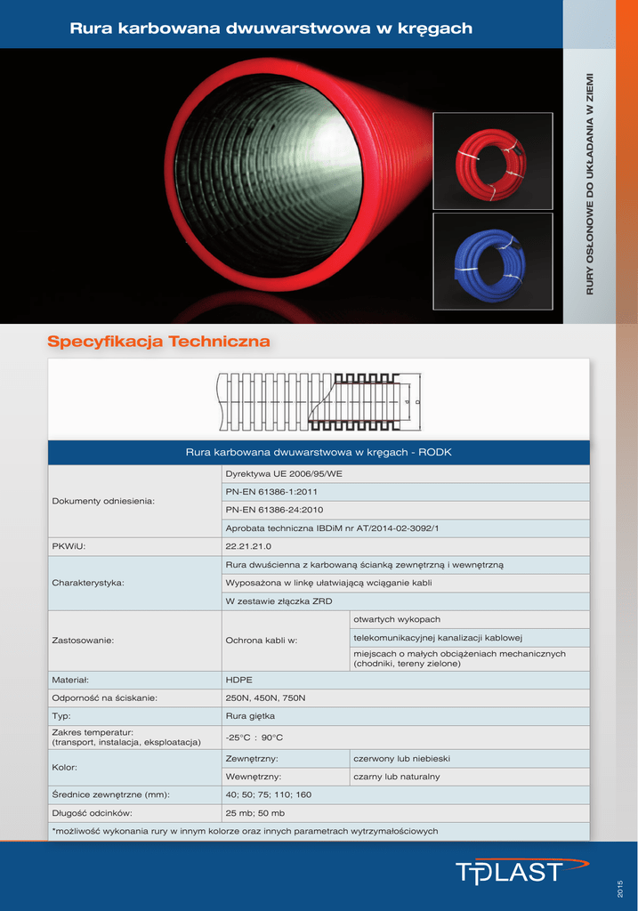 RURY OSŁONOWE DO UKŁADANIA W ZIEMI Rura karbowana dwuwarstwowa w kręgach Specyfikacja Techniczna Rura karbowana dwuwarstwowa w kręgach - RODK Dyrektywa UE 2006/95/WE Dokumenty odniesienia: PN-EN 61386-1:2011 PN-EN 61386-24:2010 Aprobata techniczna IBDiM nr AT/2014-02-3092/1 PKWiU: 22.21.21.0 Rura dwuścienna z karbowaną ścianką zewnętrzną i wewnętrzną Charakterystyka: Wyposażona w linkę ułatwiającą wciąganie kabli W zestawie złączka ZRD otwartych wykopach Zastosowanie: Ochrona kabli w: telekomunikacyjnej kanalizacji kablowej miejscach o małych obciążeniach mechanicznych (chodniki, tereny zielone) Materiał: HDPE Odporność na ściskanie: 250N, 450N, 750N Typ: Rura giętka Zakres temperatur: (transport, instalacja, eksploatacja) -25°C ÷ 90°C Kolor: Zewnętrzny: czerwony lub niebieski Wewnętrzny: czarny lub naturalny Średnice zewnętrzne (mm): 40; 50; 75; 110; 160 Długość odcinków: 25 mb; 50 mb 2015 *możliwość wykonania rury w innym kolorze oraz innych parametrach wytrzymałościowych Rura karbowana dwuwarstwowa w kręgach Dostępne Rozmiary Rura karbowana dwuwarstwowa w kręgach - RODK lp. nr kat. nazwa symbol dł. zw. (mb) 1 10599 Rura karbowana dwuwarstwowa w kręgach 40/32 - 50 mb - niebieska RODK 40/32 - 50 N 50 2 10618 Rura karbowana dwuwarstwowa w kręgach 50/40 - 25 mb - czerwona RODK 50/40 - 25 CZ 25 3 10619 Rura karbowana dwuwarstwowa w kręgach 50/40 - 25 mb - niebieska RODK 50/40 - 25 N 25 4 10600 Rura karbowana dwuwarstwowa w kręgach 50/40 - 50 mb - czerwona RODK 50/40 - 50 CZ 50 5 10601 Rura karbowana dwuwarstwowa w kręgach 50/40 - 50 mb - niebieska RODK 50/40 - 50 N 50 6 10620 Rura karbowana dwuwarstwowa w kręgach 75/60 - 25 mb - czerwona RODK 75/60 - 25 CZ 25 7 10621 Rura karbowana dwuwarstwowa w kręgach 75/60 - 25 mb - niebieska RODK 75/60 - 25 N 25 8 10602 Rura karbowana dwuwarstwowa w kręgach 75/60 - 50 mb - czerwona RODK 75/60 - 50 CZ 50 9 10603 Rura karbowana dwuwarstwowa w kręgach 75/60 - 50 mb - niebieska RODK 75/60 - 50 N 50 10 10616 Rura karbowana dwuwarstwowa w kręgach 110/92 - 25 mb - czerwona RODK 110/92 - 25 CZ 25 11 10617 Rura karbowana dwuwarstwowa w kręgach 110/92 - 25 mb - niebieska RODK 110/92 - 25 N 25 12 10604 Rura karbowana dwuwarstwowa w kręgach 110/92 - 50 mb - czerwona RODK 110/92 - 50 CZ 50 13 10605 Rura karbowana dwuwarstwowa w kręgach 110/92 - 50 mb - niebieska RODK 110/92 - 50 N 50 14 10606 Rura karbowana dwuwarstwowa w kręgach 160/134 - 25 mb - czerwona RODK 160/134 - 25 CZ 25 15 10607 Rura karbowana dwuwarstwowa w kręgach 160/134 - 25 mb - niebieska RODK 160/134 - 25 N 25