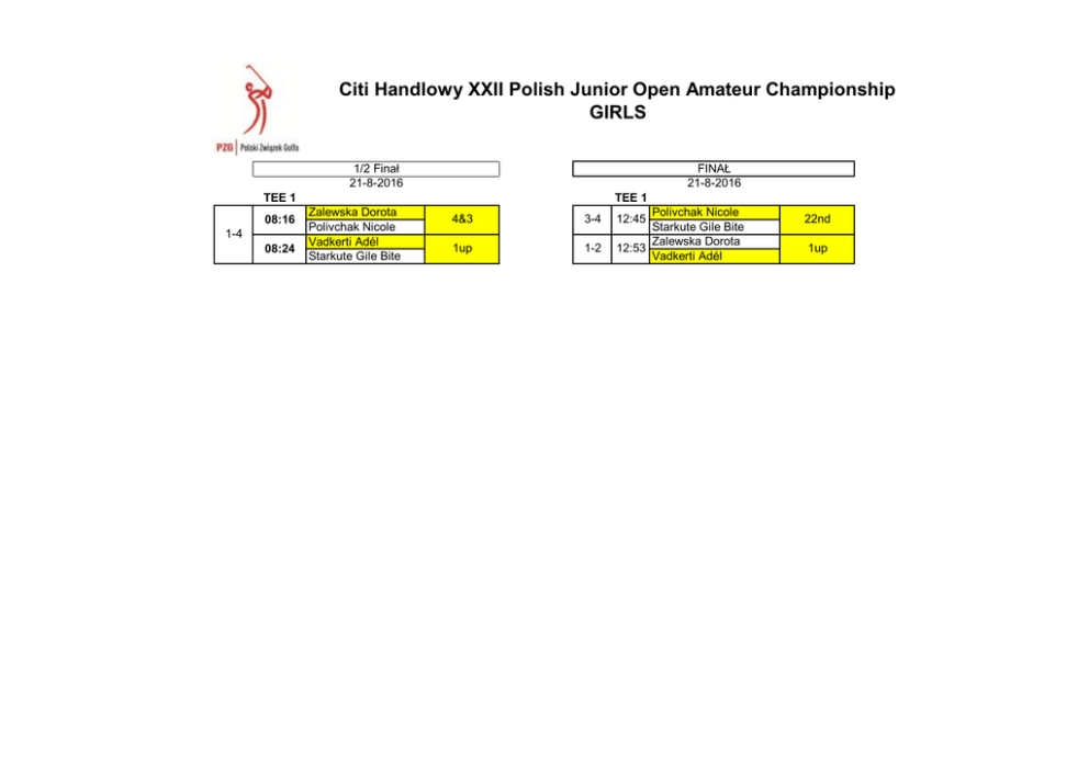 Citi Handlowy XXII Polish Junior Open Amateur Championship GIRLS 1/2 Finał 21-8-2016 FINAŁ 21-8-2016 TEE 1 08:16 1-4 08:24 TEE 1 Zalewska Dorota Polivchak Nicole Vadkerti Adél Starkute Gile Bite 4&3 3-4 1up 1-2 Polivchak Nicole Starkute Gile Bite Zalewska Dorota 12:53 Vadkerti Adél 12:45 22nd 1up