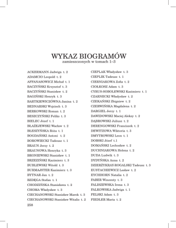 WYKAZ BIOGRAMÓW zamieszczonych w tomach 1–3 ACKERMANN Jadwiga t. 2 CIEPLAK Władysław t. 3 ADAMCIO Leopold t. 2 CIEPLIK Tadeusz t. 1 AFFANASOWICZ Michał t. 1 CIERNIAKOWA Zofia t. 2 BACZYŃSKI Krzysztof t. 3 CIOŁKOSZ Adam t. 3 BACZYŃSKI Stanisław t. 2 CYRUS-SOBOLEWSKI Kazimierz t. 1 BAGIŃSKI Henryk t. 3 CZARNECKI Władysław t. 2 BARTKIEWICZÓWNA Janina t. 2 CZEKAŃSKI Zbigniew t. 2 BEDNARSKI Wojciech t. 3 CZERWIŃSKA Magdalena t. 2 BERKOWSKI Roman t. 2 DARGIEL Jerzy t. 1 BESZCZYŃSKI Feliks t. 3 DAWIDOWSKI Maciej Aleksy t. 2 BIELEC Józef t. 1 DĄBROWSKI Juliusz t. 2 BŁAŻEJEWSKI Wacław t. 2 DERENGOWSKI Franciszek t. 2 BŁESZYŃSKA Róża t. 1 DEWITZOWA Wiktoria t. 3 BOGDAŃSKI Antoni t. 2 DMYTROWSKI Leon t. 1 BOROWIECKI Tadeusz t. 1 DOBSKI Józef t.1 BRAUN Jerzy t. 2 DOMAŃSKI Lechosław t. 2 BRAUNOWA Henryka t. 3 DUCHNIAKOWA Helena t. 2 BRONIEWSKI Stanisław t. 1 DUDA Ludwik t. 3 BRZEZIŃSKI Kazimierz t. 3 DYDYŃSKA Anna t. 2 BUBLEWSKI Witold t. 3 DZIERŻYKRAY-ROGALSKI Tadeusz t. 3 BURMAJSTER Kazimierz t. 3 EUSTACHIEWICZ Lesław t. 2 BYTNAR Jan t. 2 EYCHHORN Natalia t. 2 BZDĘGA Stefan t. 1 FABER Wincenty t. 3 CHODZIŃSKA Stanisława t. 2 FALISZEWSKA Irena t. 3 CHOMA Władysław t. 3 FALKOWSKA Jadwiga t. 1 CIECHANOWSKI Stanisław Marek t. 3 FELSKI Adam t. 3 CIECHANOWSKI Stanisław Witalis t. 2 FIEDLER Maria t. 2 258 FIK Eugeniusz t. 1 HERMACHOWA Urszula t. 2 FIRLIK Franciszek t. 2 IWANOW-SZAJNOWICZ Jerzy t. 3 FLIS Jan t. 3 JAKÓBKIEWICZ Józef t. 3 FLORCZAK Zofia t. 2 JANCZY Zofia t. 3 FRELICHOWSKI Wincenty t. 2 JARECKA Jadwiga t. 3 FUSEK Witold t. 2 JÄNICH Tadeusz t. 3 GAJDOWSKI Leon t. 3 JEZIERSKA Maria t. 1 GARBACIK Józef t. 2 JINDRA Cezary t. 1 GĘBICOWA Antonina t. 1 JONIEC Józef t. 3 GLASS Henryk t. 2 JORDAN zamężna Łowińska Wanda t. 3 GOGOLIŃSKI-ELSTON Rafał t. 1 KACHEL Józef t. 1 GOLISZ Maksymilian t. 3 KACZOROWSKI Ryszard t. 3 GOŁASZEWSKI Czesław t. 2 KAMIENIECKA-GRYCKO Wanda t. 1 GOŁOGÓRSKI Daniel t. 2 KAMIŃSKI Aleksander t. 1 GOŁOŃSKI Jerzy t. 2 KANN Maria t. 3 GORZKOWSKI Kazimierz t. 3 KANTOR Józefa t. 1 GRAŻYŃSKA Helena t. 3 KAPISZEWSKI Henryk t.1 GRAŻYŃSKI Michał t. 1 KENIŻANKA Władysława t. 2 GREGORKIEWICZ Antoni t. 3 KLECZEWSKA Alina t. 1 GRENDA Kazimierz t. 2 KŁYS Zygmunt t. 3 GROBELNY Stefan t. 3 KONOPACKI Eugeniusz t. 3 GRODECKA Ewa t. 1 KORZENIOWSKI Rudolf t. 2 GRODYŃSKI Jerzy t. 1 KOSSOWSKA Izydora t. 2 GROMSKI Antoni t. 2 KOWALSKI Jarosław t. 2 GRONOSTAJSKA Jadwiga t. 1 KOZIELEWSKI Ignacy t. 3 GRZESIAK Józef t. 1 KOZŁOWSKI Jerzy t. 2 GRZYMAŁA-GRZYMAŁOWSKI KOZŁOWSKI Tadeusz t. 1 Olgierd t. 1 KRAHELSKA Krystyna t. 2 HAJDUK Feliks t. 3 KRET Józef t. 1 HALLER Józef t. 1 KRĘCKI Franciszek t. 1 HAŁŁASOWA Kazimiera t. 3 KRÓKOWSKA Zofia t. 3 HARSDORF-BROMOWICZOWA KRÓL Tadeusz t. 2 Teresa t. 2 KRYNICKA Maria t. 1 HARSDORF Ewa t. 2 KUBICKI Jan t. 3 HEIL Edward t. 1 KUKUCZKA Jerzy t. 2 259 KUROŃ Jacek t. 3 MIROWSKI Stefan t. 1 KWAŚNIEWSKI Tadeusz t. 3 MITERA Tadeusz t. 2 KWIATKOWSKI Tadeusz t. 3 MOLENDA Bogusław t. 2 LANGNER Władysław t. 2 MONIUSZKO Stanisław t. 3 LEPALCZYK Irena t. 2 MOŚCICKI Stanisław t. 3 LEWANDOWSKA Irena t. 2 MUCHA Wincenty t. 1 LIBIONKA Aniela t. 3 MUŻ Władysław t. 1 LICZMAŃSKI Alfons t. 1 NEKRASZOWA Natalia t. 2 LINDNER Jadwiga t. 1 NEKRASZ Władysław t. 2 LISIŃSKI Kazimierz t. 1 NIEBUDEK Stefania t. 2 LIS-KULA Leopold t. 2 NIEDERLIŃSKI Wojciech t. 3 LUBOŃSKI Zygmunt t. 3 NIEMIEC Gustaw t. 3 LUDWIG Władysław t. 3 NORWID-NEUGEBAUER LUŚNIAKÓWNA Jadwiga t. 1 Mieczysław t. 1 LUTOSŁAWSKI Kazimierz t. 1 NOWAKOWSKI Stanisław t. 1 LUZAR Marian t. 1 NOWAK-PRZYGODZKI Antoni t. 2 ŁACIAK Leon t. 3 OKOŃ Stanisław t. 1 ŁAPIŃSKA Józefina t. 1 OLBROMSKI Antoni t. 2 ŁOWIŃSKI Marian t. 3 OLEWIŃSKI Piotr t. 2 ŁYCZKO Maria t. 1 OLIZAR Bohdan t. 2 MACHAŁOWA Natalia t. 2 OMIECZYŃSKI Aleksander t. 3 MACHUTTA Jan t. 3 OPIEŃSKA-BLAUTH Janina t. 3 MAGIERSKA Danuta t. 1 ORŁOWICZÓWNA Jadwiga t. 1 MALISZEWSKI Edward t. 3 PANCEWICZ Bronisław t. 2 MAŁKOWSKA Olga t. 1 PAWEŁEK Alojzy t. 1 MAŁKOWSKI Andrzej t. 1 PAWŁOWSKI Eugeniusz t. 2 MARCINIAK Florian t. 1 PAWŁOWSKI Longin t. 3 MARESZ Tadeusz t. 1 PIASECKI Eugeniusz t. 1 MARSZAŁEK Leon t. 2 PIĄTKIEWICZ Bronisław t. 1 MARTYNOWICZÓWNA Władysława t. 2 PIGONIÓWNA Aniela t. 3 MASSALSKI Edmund t. 1 PIGOŃ Stanisław t. 3 MAUERSBERGER Jan t. 1 PILARCZYK Leon t. 3 MILESKA Maria Irena t. 1 PIOTROWSKA Anna t. 2 MILEWSKI Janusz t. 3 PISKORSKI Tomasz t. 3 MIROSZEWSKI Stanisław t. 2 PŁONKA Ignacy t. 3 260 POLAK Tadeusz t. 2 SOŁTYS Miłosz t. 3 POLLAK Roman t. 3 SOŁTYSOWA Jadwiga t. 3 PORADZISZ Edward t. 3 SOSABOWSKI Stanisław t. 3 PTASZYCKA Anna t. 3 SOSNOWSKI Józef t. 2 PTASZYCKI Tadeusz t. 3 STASIECKI Eugeniusz t. 1 PUCIATA Paweł t. 3 STAŚKO Józef t. 1 PYTLIŃSKA Bogdana t. 2 STECKIEWICZ Maria t. 2 RATAJCZAK Józef t. 1 STIEBER Zdzisław t. 1 REGER Witold t. 3 STIPAL Stefania t. 1 REMI Zenon t. 2 STRUMIŁŁO Tadeusz t. 1 ROSSMAN Jan t. 2 STRUSIOWA Józefa t. 3 RUDNICKI Aleksander t. 2 STUDZIŃSKI Gustaw t. 2 RUDNICKI Janusz t. 3 SULIGA Jan t. 2 RUDNICKI Stanisław t. 3 SURZYCKI Jan t. 2 RYBLEWSKI Jan t. 3 SZAFRAN Wisława t. 3 RYBSKI Bogusław t. 3 SZCZEPAŃCÓWNA Bronisława t. 2 RYDAROWSKA Maria t. 2 SZCZYGIEŁ Władysław t. 1 RYMARÓWNA Zofia t. 1 SZLETYŃSKI Jerzy t. 2 SABBAT Kazimierz t. 1 SZLETYŃSKI Stefan t. 2 SADKOWSKA Halina t. 1 SZPUNAR Julian t. 2 SADOWSKI Andrzej t. 2 SZYMAŃSKA Maria t. 2 SAJKOWSKI Michał t. 1 SZYRYŃSKI Wiktor t. 3 SAWICKI Witold t. 3 ŚLEDZIEWSKA Halina t. 2 SEDLACZEK Stanisław t. 1 ŚLEDZIEWSKI Wacław t. 2 SERWAŃSKA Wanda t. 3 ŚLIWIŃSKI Walerian t. 2 SERWAŃSKI Edward t. 3 ŚNIEGOCKI Henryk t. 1 SIELECKI Stanisław t. 1 ŚWITALSKA Maria t. 2 SIERADZKI Władysław t. 1 TARNOWSKA Irena t. 3 SIUDA Ryszard t. 2 TOKARZ Alojza t. 2 SKORACZEWSKI Władysław t. 3 TOMASZEWSKA Wanda t. 1 SKORUPKA Ignacy t. 2 TRAPP Ferdynand t. 3 SKRZYPCZAK Jan t. 2 TRUSZCZYŃSKI Roman t. 1 SŁABY Wilhelm t. 1 TRYLSKI Z