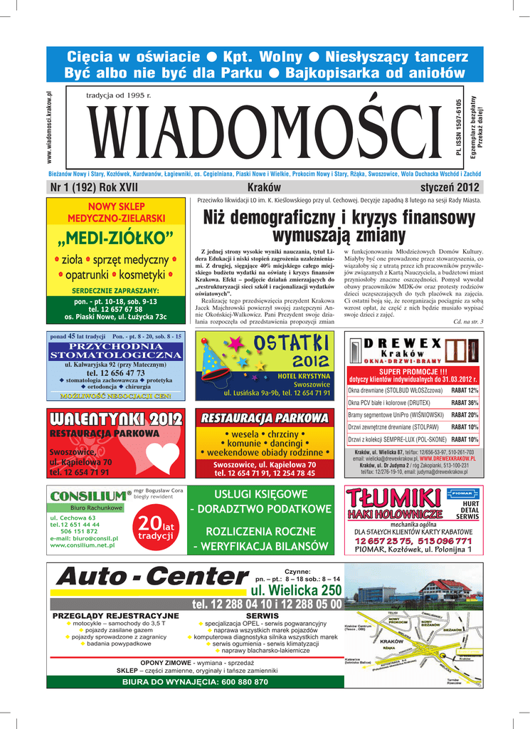 Egzemplarz bezpłatny Przekaż dalej! www.wiadomosci.krakow.pl WIADOMOŚCI tradycja od 1995 r. PL ISSN 1507-6105 Cięcia w oświacie l Kpt. Wolny l Niesłyszący tancerz Być albo nie być dla Parku l Bajkopisarka od aniołów Bieżanów Nowy i Stary, Kozłówek, Kurdwanów, Łagiewniki, os. Cegielniana, Piaski Nowe i Wielkie, Prokocim Nowy i Stary, Rżąka, Swoszowice, Wola Duchacka Wschód i Zachód Nr 1 (192) Rok XVII NOWY SKLEP MEDYCZNO-ZIELARSKI „MEDI-ZIÓŁKO” zioła sprzęt medyczny opatrunki kosmetyki Serdecznie zapraszamy: pon. - pt. 10-18, sob. 9-13 tel. 12 657 67 58 os. Piaski Nowe, ul. Łużycka 73c ponad 45 lat tradycji Pon. - pt. 8 - 20, sob. 8 - 15 PRZYCHODNIA STOMATOLOGICZNA Kraków Przeciwko likwidacji LO im. K. Kieślowskiego przy ul. Cechowej. Decyzje zapadną 8 lutego na sesji Rady Miasta. Niż demograficzny i kryzys finansowy wymuszają zmiany Z jednej strony wysokie wyniki nauczania, tytuł Lidera Edukacji i niski stopień zagrożenia uzależnieniami. Z drugiej, sięgające 40% miejskiego całego miejskiego budżetu wydatki na oświatę i kryzys finansów Krakowa. Efekt – podjęcie działań zmierzających do „restrukturyzacji sieci szkół i racjonalizacji wydatków oświatowych”. Realizację tego przedsięwzięcia prezydent Krakowa Jacek Majchrowski powierzył swojej zastępczyni Annie Okońskiej-Walkowicz. Pani Prezydent swoje działania rozpoczęła od przedstawienia propozycji zmian 2012 tel. 12 656 47 73 Możliwość negocjacji cen! WALENTYNKI 2012 Restauracja Parkowa Swoszowice, ul. Kąpielowa 70 tel. 12 654 71 91 Hotel Krystyna Swoszowice ul. Lusińska 9a-9b, tel. 12 654 71 91 RESTAURACJA PARKOWA ∙ wesela ∙ chrzciny ∙ ∙ komunie ∙ dancingi ∙ ∙ weekendowe obiady rodzinne ∙ Swoszowice, ul. Kąpielowa 70 tel. 12 654 71 91, 12 254 78 45 mgr Bogusław Cora biegły rewident Biuro Rachunkowe ul. Cechowa 63 tel.12 651 44 44 506 151 872 e-mail: [email protected] www.consilium.net.pl 20 lat tradycji usługi księgowe – doradztwo podatkowe rozliczenia roczne – weryfikacja bilansów Czynne: pn. – pt.: 8 – 18 sob.: 8 – 14 ul. Wielicka 250 PRZEGLĄDY REJESTRACYJNE u motocykle – samochody do 3,5 T u pojazdy zasilane gazem u pojazdy sprowadzone z zagranicy u badania powypadkowe tel. 12 288 04 10 i 12 288 05 00 SERWIS u specjalizacja Opel - serwis pogwarancyjny u naprawa wszystkich marek pojazdów u komputerowa diagnostyka silnika wszystkich marek u serwis ogumienia - serwis klimatyzacji u naprawy blacharsko-lakiernicze OPONY ZIMOWE - wymiana - sprzedaż SKLEP – części zamienne, oryginały i tańsze zamienniki Biura do wynajęcia: 600 880 870 �������� w funkcjonowaniu Młodzieżowych Domów Kultury. ���������������� ������ Miałyby być one prowadzone przez stowarzyszenia, co wiązałoby się z utratą przez ich pracowników przywile������"�������� jów związanych z Kartą Nauczyciela, a budżetowi miast #�"$���%�&'�(�)*��+ przyniosłoby znaczne oszczędności. Pomysł wywołał obawy pracowników MDK-ów oraz protesty rodziców ������. dzieci uczęszczających do tych placówek na zajęcia. #�"$��(��%�/� Ci ostatni boją się, że reorganizacja pociągnie za sobą 0��1���"�������" wzrost opłat, że część z nich będzie musiało wypisać swoje dzieci z zajęć. '"�$��2�3$��������� Cd. na str.#�"$��)4564�)�74 3 ��������� ������������������ ������ �� OSTATKI ul. Kalwaryjska 92 (przy Matecznym) ◆ stomatologia zachowawcza ◆ protetyka ◆ ortodoncja ◆ chirurgia styczeń 2012 ������"�������� �("��������8�"�����"�� #�"$���%�&'�(�)*��++� �#�"$���%�&�,) ������������������������������������� ("������������9������� ������. ����������������� ����������������� Super promocje !!! #�"$����&:�7�6� �������������������������������� �������������������������������� dotyczy klientów indywidualnych do 31.03.2012#�"$��(��%�/� r. ������ ������ ��!��! �!�"� �!�"� 0��1���"�������" ������"�������� ������"�������� Okna drewniane (stolbud włoszczowa) RABAT 12% #�"$���%�&'�(�)*��++�),�� #�"$���%�&'�(�)*��++�),�� 7"����;�����)��������<=;����>?�@���! '"�$��2�3$����������� �,',%��!�,',%��!�$�������������D�"���@�"�����E Okna PCV białe i kolorowe (drutex) RABAT #�"$��)4564�)�74 36% ������. ������. 7"����;�����("�����$��!>"�3�+� #�"$��(��%�/� #�"$��(��%�/� 0��1���"�������" 0��1���"�������" ���>?�@���!>!=A:�C:� ;��$�����9�� Bramy segmentowe UniPro (Wiśniowski) RABAT 20% �,',%��!�,',%��!'"�$��2�3$�����������"� '"�$��2�3$�����������"� ����2�����2����������9��8��9���0 #�"$��)4564�)�74 #�"$��)4564�)�74 Drzwi zewnętrzne drewniane (stolPaw) RABAT �("��������8�"�����"��� 10% �#�"$���%�&
