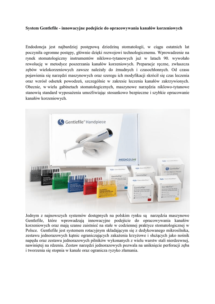 System Gentlefile - innowacyjne podejście do opracowywania kanałów korzeniowych Endodoncja jest najbardziej postępową dziedziną stomatologii, w ciągu ostatnich lat poczyniła ogromne postępy, głównie dzięki rozwojowi technologicznemu. Wprowadzenie na rynek stomatologiczny instrumentów niklowo-tytanowych już w latach 90. wywołało rewolucję w metodyce poszerzania kanałów korzeniowych. Preparacje ręczne, zwłaszcza zębów wielokorzeniowych zawsze należały do żmudnych i czasochłonnych. Od czasu pojawienia się narzędzi maszynowych oraz szeregu ich modyfikacji skrócił się czas leczenia oraz wzrósł odsetek powodzeń, szczególnie w zakresie leczenia kanałów zakrzywionych. Obecnie, w wielu gabinetach stomatologicznych, maszynowe narzędzia niklowo-tytanowe stanowią standard wyposażenia umożliwiając stosunkowo bezpieczne i szybkie opracowanie kanałów korzeniowych. Jednym z najnowszych systemów dostępnych na polskim rynku są narzędzia maszynowe Gentlefile, które wprowadzają innowacyjne podejście do opracowywania kanałów korzeniowych oraz mają szanse zaistnieć na stałe w codziennej praktyce stomatologicznej w Polsce. Gentlefile jest systemem rotacyjnym składającym się z dedykowanego mikrosilnika, zestawu jednorazowych kątnic ograniczających zakażenia krzyżowe i służących jako nośnik napędu oraz zestawu jednorazowych pilników wykonanych z wielu warstw stali nierdzewnej, nawiniętej na rdzeniu. Zestaw narzędzi jednorazowych pozwala na uniknięcie perforacji zęba i tworzenia się stopnia w kanale oraz ogranicza ryzyko złamania. Pilniki Gentlefile są systemem intuicyjnym, łatwym w użyciu, szczególnie polecanym lekarzom, którzy rozpoczynają pracę z narzędziami maszynowymi w leczeniu endodontycznym. Innowacyjność systemu związana jest z zasadą działania prostego mikrosilnika, który generuje niski moment obrotowy z dużą prędkością (6.500 obrotów/min.), obracającą pilnik. Kiedy silnik napotka opór, wbudowane oprogramowanie wykrywa jego wzrost i ogranicza jego moc do bezpiecznej zdefiniowanej wartości. Kontrola prędkości jest ustawiona fabrycznie i nie ma możliwości jej zmiany. Zasady pracy systemem Gentlefile opierają się na technice crown-down . Po wcześniejszym uzyskaniu prostolinijnego dostępu do kanału korzeniowego, Jak przed każdym opracowaniem maszynowym należy wykonać wstępne, ręczne opracowanie kanałów pilnikiem ręcznym, aby ocenić jego anatomię i zmierzyć długość roboczą. Nie ma natomiast potrzeby dodatkowego przygotowania części koronowej – pilnik Gentlefile dostosowuje się do każdego kształtu kanału, przechodząc wzdłuż osi nawet bardzo zakrzywionych i bardzo wąskich kanałów korzeniowych. Obrotowy ruch pilnika powoduje polerowanie i szlifowanie zębiny na ścianach kanału co pozwala zachować naturalną krzywiznę. Założeniem systemu jest minimalnie inwazyjna endodoncja przy szybkiej i skutecznej pracy rotacyjnej. Zalecana sekwencja pracy z pilnikami Gentlefile rozpoczyna się od opracowania kanału korzeniowego do ok. 1/3 jego długości przy użyciu pilnika szarego, następnie należy używać pilników od większego do mniejszego aż do osiągnięcia całej długości roboczej kanału. Po umieszczeniu pilnika w kanale należy rozpocząć pionowe ruchy "dziobania" z niewielkim naciskiem koniuszka. Praca zostaje zakończona po 3-5 ruchach trwających łącznie nie więcej niż 5 sekund. Zaoszczędzony na preparacji kanału czas można wykorzystać na efektywną aktywację podchlorynu. W trakcie preparacji żeba trzonowego wykorzystuje się od 3 do 4 pilników, które dzięki swojej jednorazowości są bezpieczne w użyciu, a ryzyko ich złamania jest bardzo małe. Pilniki przed użyciem nalezy wysterylizować. Kanały korzeniowe opracowane narzędziami Gentlefile zalecane jest wypełniać przestrzennie metodą kondensacji termoplastycznej gutaperki lub metodą pojedynczego ćwieka gutaperkowego o zwiększonej stożkowatości z uszczelniaczem zachowując naturalny kształt kanału. Studium przypadku: