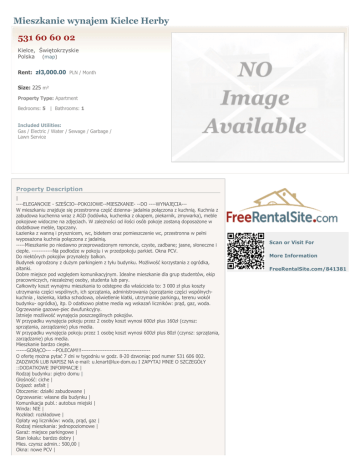 Mieszkanie wynajem Kielce Herby 531 60 60 02 Kielce, Świętokrzyskie Polska (map) Rent: zł3,000.00 PLN / Month Size: 225 m² Property Type: Apartment Bedrooms: 5 | Bathrooms: 1 Included Utilities: Gas / Electric / Water / Sewage / Garbage / Lawn Service Property Description | ----ELEGANCKIE - SZEŚCIO--POKOJOWE--MIESZKANIE- --DO ----WYNAJĘCIA--W mieszkaniu znajduje się przestronna część dzienna- jadalnia połączona z kuchnią. Kuchnia z zabudowa kuchenna wraz z AGD (lodówka, kuchenka z okapem, piekarnik, zmywarka), meble pokojowe widoczne na zdjęciach. W zależności od ilości osób pokoje zostaną doposażone w dodatkowe meble, tapczany. Łazienka z wanną i prysznicem, wc, bidetem oraz pomieszczenie wc, przestronna w pełni wyposażona kuchnia połączona z jadalnią. -----Mieszkanie po niedawno przeprowadzonym remoncie, czyste, zadbane; jasne, słoneczne i ciepłe. ------------Na podłodze w pokoju i w przedpokoju parkiet. Okna PCV. Do niektórych pokojów przynależy balkon. Budynek ogrodzony z dużym parkingiem z tyłu budynku. Możliwość korzystania z ogródka, altanki. Dobre miejsce pod względem komunikacyjnym. Idealne mieszkanie dla grup studentów, ekip pracowniczych, niezależnej osoby, studenta lub pary. Całkowity koszt wynajmu mieszkania to odstępne dla właściciela to: 3 000 zł plus koszty utrzymania części wspólnych, ich sprzątania, administrowania (sprzątanie części wspólnychkuchnia , łazienka, klatka schodowa, oświetlenie klatki, utrzymanie parkingu, terenu wokół budynku- ogródka), itp. D odatkowo płatne media wg wskazań liczników: prąd, gaz, woda. Ogrzewanie gazowe-piec dwufunkcyjny. Istnieje możliwość wynajęcia poszczególnych pokojów. W przypadku wynajęcia pokoju przez 2 osoby koszt wynosi 600zł plus 160zł (czynsz: sprzątania, zarządzanie) plus media. W przypadku wynajęcia pokoju przez 1 osobę koszt wynosi 600zł plus 80zł (czynsz: sprzątania, zarządzanie) plus media. Mieszkanie bardzo ciepłe. ------GORĄCO--- --POLECAM!!!--------------------------------------O ofertę można pytać 7 dni w tygodniu w godz. 8-20 dzwoniąc pod numer 531 606 002. ZADZWOŃ LUB NAPISZ NA e-mail: [email protected] I ZAPYTAJ MNIE O SZCZEGÓŁY ::DODATKOWE INFORMACJE | Rodzaj budynku: piętro domu | Głośność: ciche | Dojazd: asfalt | Otoczenie: działki zabudowane | Ogrzewanie: własne dla budynku | Komunikacja publ.: autobus miejski | Winda: NIE | Rozkład: rozkładowe | Opłaty wg liczników: woda, prąd, gaz | Rodzaj mieszkania: jednopoziomowe | Garaż: miejsce parkingowe | Stan lokalu: bardzo dobry | Mies. czynsz admin.: 500,00 | Okna: nowe PCV | Scan or Visit For More Information FreeRentalSite.com/841381 Instalacje: nowa | Balkon: duży | Powierzchnia użytkowa [m2]: 225,00 | Rok budowy: 2000 | Ilość pokoi: 1 | Ilość sypialni: 5 | Typ kuchni: oddzielna | Rodzaj kuchni: umeblowana i wyposażona | Wyposażenie kuchni: pralka, lodówka, zmywarka, zamrażarka, zabudowa kuchenna, płyta grzewcza, piekarnik, okap | Typ łazienki: razem z WC | Ilość łazienek: 1 | Wyposażenie łazienki: wanna, natrysk | Ilość WC: 1 | Podłoga przedpokoi: gres | Typ kaucji: jednomiesięczna | ::KONTAKT DO AGENTA | Urszula LuxDom | 691 71 71 17 | 531 60 60 02 | [email protected] ::DANE BIURA | LuxDom Nieruchomości | - Małgorzata Janczura | Żytnia 14 A | 25-018 Kielce | 413357573 | www.luxdom.info Pośrednik odpowiedzialny zawodowo za wykonanie umowy pośrednictwa: Małgorzata Janczura (licencja nr: 16859) -------------------------Współpracujemy z 25 bankami . W naszym biurze możesz sprawdzić swoją zdolność kredytową. Zapraszamy na Żytnią 14A oraz na www.luxdom.info | Oferta wysłana z systemu Galactica Virgo Year Built: 2000 Floors: 2