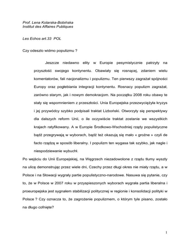 Prof. Lena Kolarska-Bobińska Institut des Affaires Publiques Les Echos art.33 POL Czy odeszlo widmo populizmu ? Jeszcze niedawno elity w Europie pesymistycznie patrzyły na przyszłość swojego kontynentu. Obawiały się rosnącej, zdaniem wielu komentatorów, fali nacjonalizmu i populizmu. Ten pierwszy zagrażał spójności Europy oraz pogłebiania integracji kontynentu. Rosnacy populizm zagrażał, zarówno starym, jak i nowym demokracjom. Na początku 2008 roku obawy te stały się wspomnieniem z przeszłości. Unia Europejska przezwyciężyła kryzys i jej przywódcy szybko podpisali traktat Lizboński. Otworzyły się perspektywy dla dalszych reform Unii, o ile oczywiście traktat zostanie we wszystkich krajach ratyfikowany. A w Europie Środkowo-Wschodniej rządy populistyczne bądź przegrywają w wyborach, bądź też okazują się mało « groźne » czyli de facto rządzą w sposób liberalny. I populizm ten wygasa tak szybko, jak nagle i niespodziewanie wybuchł. Po wejściu do Unii Europejskiej, na Węgrzech niezadowolone z rządu tłumy wyszły na ulicę demonstrując przez wiele dni, Czechy przez długi okres nie miały rządu, a w Polsce i na Słowacji wygrały partie populistyczno-narodowe. Nasuwa się pytanie, czy to, że w Polsce w 2007 roku w przyspieszonych wyborach wygrała partia liberalna i proeuropejska jest sygnałem stabilizacji politycznej w regionie i konsolidacji polityki w Polsce ? Czy oznacza to, że zagrożenie populizmem, o którym tyle pisano, zostało na długo cofnięte? 1 Rządząca w Polsce Platforma Obywatelska w swoim programie wyborczym odwoływała się do skoku cywilizacyjnego, który musi dokonać kraj i cudu gospodarczego na wzór Irlandii. Partia ta wygrała, ponieważ społeczeństwo stawało się coraz bardziej promodernizacyjne a elity, coraz bardziej populistyczne. Ludzie młodzi, odrzucili rządy partii braci Kaczyńskich, odrzucili konflikty polityczne i ciągłe ataki na klasę średnią, panoszenie się służb specjalnych i pokazowe aresztowania osób posądzanych o korupcję. I jednocześnie poparli otwarcie się na Europę, dobre stosunki z sąsiadami i wolność osobistą, której nie zagraża wszechwładne państwo. Populizm w krajach Europy Środkowo-Wschodniej jest w odwrocie między innymi dlatego, że, w społeczeństwach regionu zanika lęk przed Unią Europejską. Lęk ten czuło wiele osób w Polsce, na Węgrzech, w Czechach i na Słowacji zaraz po wejściu tych krajów do Unii Europejskiej. Ponadto w kilku krajach Europy ŚrodkowoWschodniej występuje wysoki wzrost gospodarczy. W Polsce, po ponad trzech latach członkostwa spadło bezrobocie, a głównym problemem jest obecnie brak rąk do pracy. Wiele osób czuje, że sytuacja ekonomiczna ich rodzin poprawiła sie i korzystają z owoców rosnącego dobrobytu. Jednak nie jest pewne czy kraje Europy Środkowo-Wschodniej wyleczyły się definitywnie z populizmu. W Polsce zależy to od tego, jak zrealizuje swój program obecny rząd liberalno-ludowy. Na razie postawił on na zupełną odmienność stylu rządzenia w stosunku do poprzedników. Powstał szybko i bez większych targów o stanowiska.. Ten dziwny w Polsce okres harmonii i normalności zakończyło najdłuższe od 1989 roku exposé premiera. Trwało ono ponad trzy godziny i zaprezentowało zupełnie nową w Polsce filozofię rządzenia. Odwoływało się do zaufania w życiu publicznym, wolności obywateli, decentralizacji państwa oraz dialogu społecznego. Nowy premier Donald Tusk wiedział, że Polacy wybrali go, 2 gdyż byli zmęczeni konfliktami poprzedniej ekipy, okazywaniem wrogości różnym autorytetom, instytucjom czy krajom. Mówił dużo o zgodzie i miłości. Jednak rząd czekają reformy, których nie można już odkładać – reforma finansów publicznych, służby zdrowia i systemu emerytalnego. Trzeba też szybko wybudować sieć autostrad i stadionów i przygotować Polskę do EURO 2012. Są to zmiany duże i trudne zwłaszcza, że rząd obiecał jednocześnie obniżenie podatków, podwyżkę płac dla nauczycieli i pracowników służby zdrowia oraz obniżenie deficytu. Jak pokazują doświadczenia Francji, reforma emerytalna jest jedną z najtrudniejszych do przeprowadzenia. Czy rząd obietnice te zrealizuje ?Czy Premier miał dość odwagi i nie będzie obawiał się przegranej po czterech latach rządów ? Pewne obietnice rzadu już obecnie rozpływają się w atmosferze miękkich stwierdzeń, niedomówień, w odkładaniu ich na nieokreśloną przyszłość. Ciągle też niewiele wiadomo o konkretnych propozycjach zmian. Niektóre grupy społeczne zaczęły też protesty i domagaja się obiecanych przed wyborami podwyżek. I to zanim rząd ogłosił jakieś propozycje, które naruszyłyby ich interesy. Jeśli rząd zrobi niewiele, zostanie oskarżony o ograniczenie się do administrowania. Jeśli przeprowadzi reformy, może polec i przegrać w następnych wyborach. Niewątpliwie jednak powinien wykorzystać obecne wysokie poparcie społeczne do przygotowania Polski do skoku cywilizacyjnego. Tak, aby widmo populizmu na zawsze lub na długi czas oddaliło się. 3