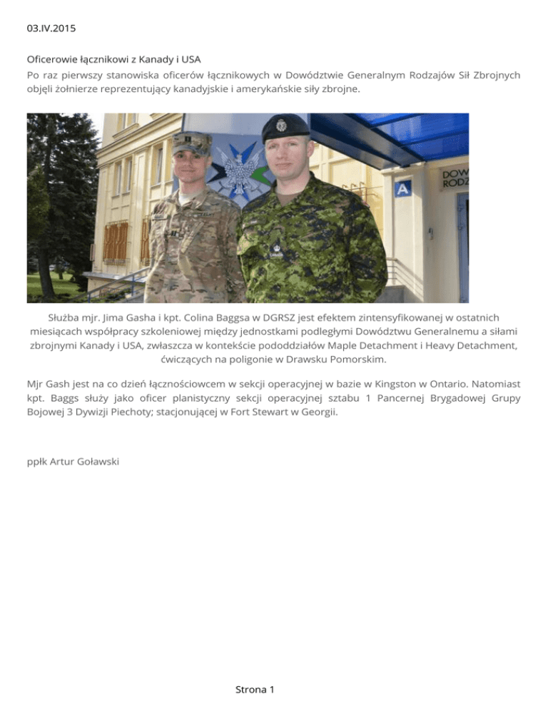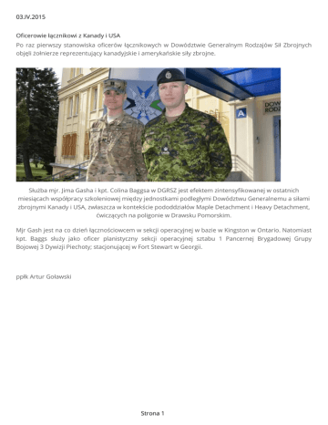 03.IV.2015 Oficerowie łącznikowi z Kanady i USA Po raz pierwszy stanowiska oficerów łącznikowych w Dowództwie Generalnym Rodzajów Sił Zbrojnych objęli żołnierze reprezentujący kanadyjskie i amerykańskie siły zbrojne. Służba mjr. Jima Gasha i kpt. Colina Baggsa w DGRSZ jest efektem zintensyfikowanej w ostatnich miesiącach współpracy szkoleniowej między jednostkami podległymi Dowództwu Generalnemu a siłami zbrojnymi Kanady i USA, zwłaszcza w kontekście pododdziałów Maple Detachment i Heavy Detachment, ćwiczących na poligonie w Drawsku Pomorskim. Mjr Gash jest na co dzień łącznościowcem w sekcji operacyjnej w bazie w Kingston w Ontario. Natomiast kpt. Baggs służy jako oficer planistyczny sekcji operacyjnej sztabu 1 Pancernej Brygadowej Grupy Bojowej 3 Dywizji Piechoty; stacjonującej w Fort Stewart w Georgii. ppłk Artur Goławski Strona 1