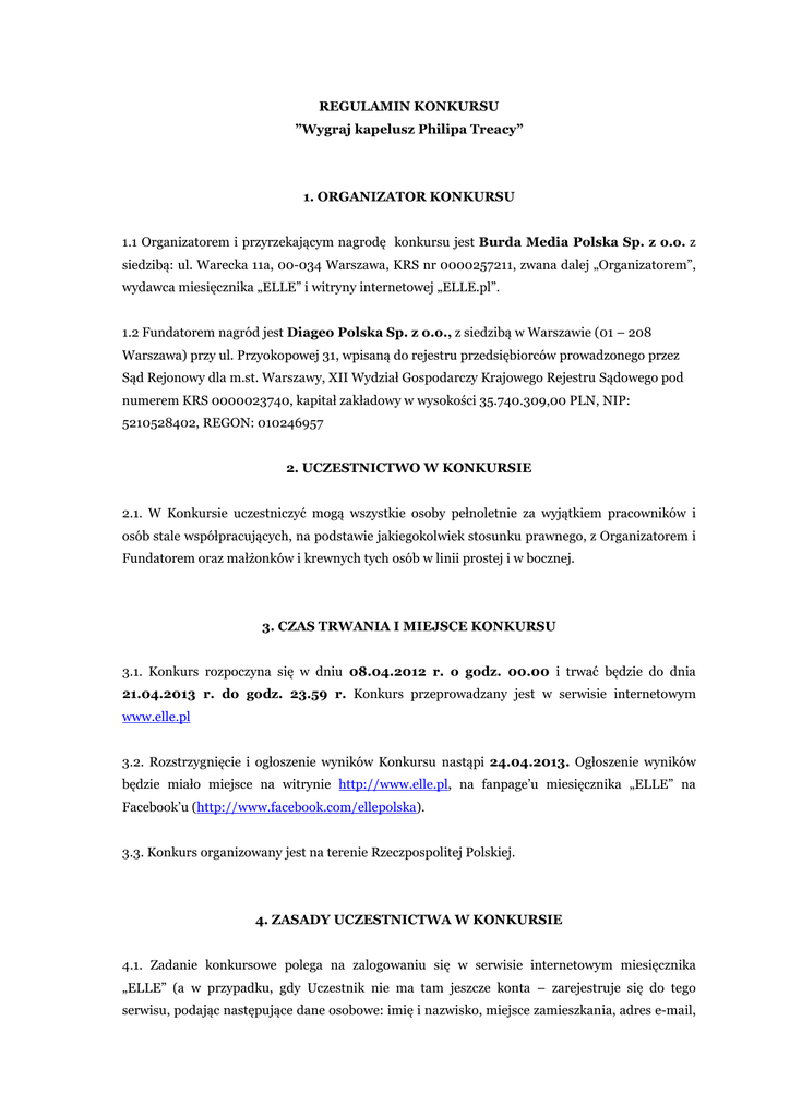 REGULAMIN KONKURSU ”Wygraj kapelusz Philipa Treacy” 1. ORGANIZATOR KONKURSU 1.1 Organizatorem i przyrzekającym nagrodę konkursu jest Burda Media Polska Sp. z o.o. z siedzibą: ul. Warecka 11a, 00-034 Warszawa, KRS nr 0000257211, zwana dalej „Organizatorem”, wydawca miesięcznika „ELLE” i witryny internetowej „ELLE.pl”. 1.2 Fundatorem nagród jest Diageo Polska Sp. z o.o., z siedzibą w Warszawie (01 – 208 Warszawa) przy ul. Przyokopowej 31, wpisaną do rejestru przedsiębiorców prowadzonego przez Sąd Rejonowy dla m.st. Warszawy, XII Wydział Gospodarczy Krajowego Rejestru Sądowego pod numerem KRS 0000023740, kapitał zakładowy w wysokości 35.740.309,00 PLN, NIP: 5210528402, REGON: 010246957 2. UCZESTNICTWO W KONKURSIE 2.1. W Konkursie uczestniczyć mogą wszystkie osoby pełnoletnie za wyjątkiem pracowników i osób stale współpracujących, na podstawie jakiegokolwiek stosunku prawnego, z Organizatorem i Fundatorem oraz małżonków i krewnych tych osób w linii prostej i w bocznej. 3. CZAS TRWANIA I MIEJSCE KONKURSU 3.1. Konkurs rozpoczyna się w dniu 08.04.2012 r. o godz. 00.00 i trwać będzie do dnia 21.04.2013 r. do godz. 23.59 r. Konkurs przeprowadzany jest w serwisie internetowym www.elle.pl 3.2. Rozstrzygnięcie i ogłoszenie wyników Konkursu nastąpi 24.04.2013. Ogłoszenie wyników będzie miało miejsce na witrynie http://www.elle.pl, na fanpage’u miesięcznika „ELLE” na Facebook’u (http://www.facebook.com/ellepolska). 3.3. Konkurs organizowany jest na terenie Rzeczpospolitej Polskiej. 4. ZASADY UCZESTNICTWA W KONKURSIE 4.1. Zadanie konkursowe polega na zalogowaniu się w serwisie internetowym miesięcznika „ELLE” (a w przypadku, gdy Uczestnik nie ma tam jeszcze konta – zarejestruje się do tego serwisu, podając następujące dane osobowe: imię i nazwisko, miejsce zamieszkania, adres e-mail, numer telefonu), celem zamieszczenia tam wykonanego w Konkursie kolażu. Kolaż dotyczyć ma artystycznej prezentacji dostępnych w aplikacji kapeluszy Philipa Treacy. Kolaż winien być otagowany tagiem „Philip Treacy” oraz zawierać co najmniej 1 grafikę związaną z kapeluszami Philipa Treacy umieszczoną do ściągnięcia na stronie www.elle.pl. 4.2. Zgłoszenie kolażu do Konkursu poprzez zamieszczenie go w serwisie internetowym „ELLE” jest równoznaczne z przystąpieniem do Konkursu oraz przyjęciem przez Uczestnika warunków niniejszego Regulaminu. 4.3. Uczestnicy Konkursu wyrażają zgodę na przetwarzanie ich danych osobowych na warunkach określonych w ustawie z dn. 29 sierpnia 1997 r. o ochronie danych osobowych (Dz. U. z 2002 r. Nr 101, poz. 926 tj. z późniejszymi zmianami) przez Burda Media Polska Sp. z o.o. w zakresie niezbędnym do przeprowadzenia Konkursu. Zgoda uczestników na przetwarzanie ich danych jest wyrażana dobrowolnie poprzez wypełnienie odpowiednich pól w formularzu rejestracyjnym. 4.4. Administratorem Danych Osobowych uczestników Konkursu w rozumieniu ustawy o ochronie danych osobowych, na potrzeby zorganizowania i przeprowadzenia Konkursu jest Organizator Konkursu - Burda Media Polska Sp. z o.o. 4.5. Zakres przetwarzania danych osobowych: - imię - nazwisko -miejsce zamieszkania 4.6. Celem przetwarzania danych osobowych jest realizacja Konkursu i wysyłka nagród. 4.7. Po zakończeniu wszystkich procesów związanych z realizacją Konkursu dane osobowe zostaną usunięte z systemów informatycznych Administratora Danych Osobowych oraz Przetwarzającego Dane Osobowe. 4.8. Uczestnicy konkursu mają prawo do wglądu do swoich danych oraz ich poprawiania, aktualizacji, uzupełniania i usuwania. Prawo to może być wykonane poprzez przesłanie odpowiedniego wniosku w formie pisemnej na adres Burda Media Polska Sp. z o.o., ul. Warecka 11a, 00-034 Warszawa z dopiskiem „ Wygraj kapelusze i tiarę Philipa Treacy” 4.9. Uczestnik jest zobowiązany niezwłocznie powiadomić Organizatora o zmianie adresu lub innych danych podanych w zgłoszeniu/formularzu. 4.10. Udział w Konkursie jest równoznaczny z wyrażeniem zgody na nieodpłatną publikację kolażu stworzonego przez Uczestnika utrwalonego o którym mowa w punkcie 4.1 Regulaminu, na witrynie http://www.elle.pl, na fanpage’u miesięcznika „ELLE” na Facebook’u (http://www.facebook.com/ellepolska), na fanpage’u miesięcznika „InStyle” na Facebook’u (http://www.facebook.com/instylepolska ) oraz w przypadku zwycięzcy na nieodpłatną publikację jego wizerunku na witrynie http://www.elle.pl w ramach materiału wideo z relacją z rozdania nagród. 4.11. W pracy konkursowej Uczestnik Konkursu nie może zamieszczać znaków towarowych napojów alkoholowych lub symboli graficznych z nimi związanych, a także nazw i symboli graficznych przedsiębiorców produkujących napoje alkoholowe, nieróżniących się od nazw i symboli graficznych napojów alkoholowych. 4.12. Przez zgłoszenie kolażu Uczestnik oświadcza, że jest jego autorem oraz, że kolaż nie narusza przepisów prawa, ani prawem chronionych dóbr osób trzecich i zobowiązuje się zwolnić Organizatora z odpowiedzialności za naruszenie praw osób trzecich. 4.13. W przypadku naruszenia zakazów wskazanych w punkcie 4.11, praca konkursowa zostanie usunięta z witryny. 5. ZASADY WYŁONIENIA ZWYCIĘZCÓW I OFEROWANE NAGRODY 5.1. Zgłoszone do Konkursu kolaże będą oceniane przez 5-osobowe Jury. W skład Jury wchodzi: a) Ina Lekiewicz szefowa działu moda magazynu ELLE b) Marta Kowalska redaktor prowadząca serwis ELLE.pl c) Iza Woźny z Pomada Fashion Office d) Agnieszka Lewandowska reprezentująca markę Baileys e) Różena Opalińska Dyrektor Kreatywna portalu o modzie i stylu życia, Stylistka 5.2. Spośród Uczestników, Jury Konkursu na obradach dnia 22.04.2013 wybierze 4 Uczestników, których kolaże uzna za najciekawsze. Uczestnicy Ci, zostaną Zwycięzcami Konkursu i w zależności od przyznanego im miejsca, każdy z nich otrzyma jedną z nagród wskazanych w punkcie 5.3 Pona