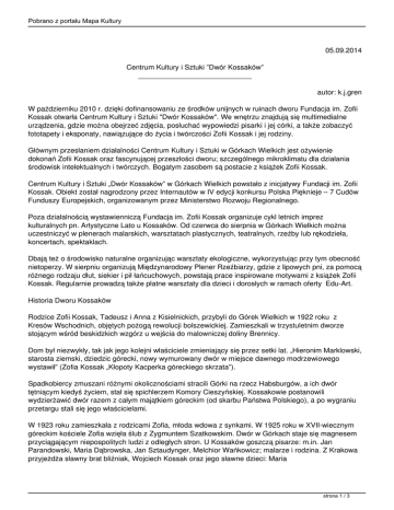 Pobrano z portalu Mapa Kultury 05.09.2014 Centrum Kultury i Sztuki ”Dwór Kossaków” ____________________________ autor: k.j.gren W październiku 2010 r. dzięki dofinansowaniu ze środków unijnych w ruinach dworu Fundacja im. Zofii Kossak otwarła Centrum Kultury i Sztuki "Dwór Kossaków". We wnętrzu znajdują się multimedialne urządzenia, gdzie można obejrzeć zdjęcia, posłuchać wypowiedzi pisarki i jej córki, a także zobaczyć fototapety i eksponaty, nawiązujące do życia i twórczości Zofii Kossak i jej rodziny. Głównym przesłaniem działalności Centrum Kultury i Sztuki w Górkach Wielkich jest ożywienie dokonań Zofii Kossak oraz fascynującej przeszłości dworu; szczególnego mikroklimatu dla działania środowisk intelektualnych i twórczych. Bogatym zasobem są postacie z książek Zofii Kossak. Centrum Kultury i Sztuki „Dwór Kossaków” w Górkach Wielkich powstało z inicjatywy Fundacji im. Zofii Kossak. Obiekt został nagrodzony przez Internautów w IV edycji konkursu Polska Pięknieje – 7 Cudów Funduszy Europejskich, organizowanym przez Ministerstwo Rozwoju Regionalnego. Poza działalnością wystawienniczą Fundacja im. Zofii Kossak organizuje cykl letnich imprez kulturalnych pn. Artystyczne Lato u Kossaków. Od czerwca do sierpnia w Górkach Wielkich można uczestniczyć w plenerach malarskich, warsztatach plastycznych, teatralnych, rzeźby lub rękodzieła, koncertach, spektaklach. Dbają też o środowisko naturalne organizując warsztaty ekologiczne, wykorzystując przy tym obecność nietoperzy. W sierpniu organizują Międzynarodowy Plener Rzeźbiarzy, gdzie z lipowych pni, za pomocą różnego rodzaju dłut, siekier i pił łańcuchowych, powstają prace inspirowane motywami z książek Zofii Kossak. Regularnie prowadzą także płatne warsztaty dla dzieci i dorosłych w ramach oferty Edu-Art. Historia Dworu Kossaków Rodzice Zofii Kossak, Tadeusz i Anna z Kisielnickich, przybyli do Górek Wielkich w 1922 roku z Kresów Wschodnich, objętych pożogą rewolucji bolszewickiej. Zamieszkali w trzystuletnim dworze stojącym wśród beskidzkich wzgórz u wejścia do malowniczej doliny Brennicy. Dom był niezwykły, tak jak jego kolejni właściciele zmieniający się przez setki lat. „Hieronim Marklowski, starosta ziemski, dziedzic górecki, nowy wymurowany dwór w miejsce dawnego modrzewiowego wystawił” (Zofia Kossak „Kłopoty Kacperka góreckiego skrzata”). Spadkobiercy zmuszani różnymi okolicznościami stracili Górki na rzecz Habsburgów, a ich dwór tętniącym kiedyś życiem, stał się spichlerzem Komory Cieszyńskiej. Kossakowie postanowili wydzierżawić dwór razem z całym majątkiem góreckim (od skarbu Państwa Polskiego), a po wygraniu przetargu stali się jego właścicielami. W 1923 roku zamieszkała z rodzicami Zofia, młoda wdowa z synkami. W 1925 roku w XVII-wiecznym góreckim kościele Zofia wzięła ślub z Zygmuntem Szatkowskim. Dwór w Górkach staje się magnesem przyciągającym niepospolitych ludzi z odległych stron. U Kossaków goszczą pisarze: m.in. Jan Parandowski, Maria Dąbrowska, Jan Sztaudynger, Melchior Wańkowicz; malarze i rodzina. Z Krakowa przyjeżdża sławny brat bliźniak, Wojciech Kossak oraz jego sławne dzieci: Maria strona 1 / 3 Pobrano z portalu Mapa Kultury (Pawlikowska-Jasnorzewska), Magdalena (Samozwaniec) i Jerzy Kossak. Bywa kuzynka Zofii, Jadwiga Unrug z mężem Stanisławem Ignacym Witkiewiczem (Witkacym). - Dom moich Dziadków, wielokrotnie opisywany przez odwiedzających naszą rodzinę literatów, był obszerny, bardzo stary, bez przesadnych wygód, urządzony z nobliwą prostotą. Długa, sklepiona sień biegła na przestrzał, od drzwi frontowych do wyjścia na ogród. Zamykały ją z obu stron potężne i ciężkie dębowe wierzeje nabite gwoździami, zasuwane na noc od wewnątrz grubą, ciosaną w kwadrat belką. W dzień była ona wpuszczona w ścianę, za to wieczorem, silnie pociągnięta, wyjeżdżała dudniąc ze swego schowka, skutecznie tarasując drzwi. Grube kamienne mury, bielone ściany, jasne tapety w salonie, podłogi z heblowanych desek i piece kaflowe w pokojach – taki był górecki dom, lodowaty w zimie, przyjemnie chłodny w upalne lato. – pisze Anna Szatkowska w książce „Był dom… Wspomnienia”. Tadeusz Kossak specjalizował się w hodowli bydła. Dosiadając konia objeżdżał buczańskie łąki, na których pasły się stada sprowadzonych ze Szwajcarii, płowych krów. Wśród zabudowań folwarcznych wyróżniał się budynek gorzelni z wysokim ceglanym kominem. Obok, obszerna obora, o ścianach wyłożonych białymi płytkami, łukowatymi sklepieniami wspartymi na żelaznych filarach, stanowiła schronienie dla wyjątkowo mlecznych krów. W najbliższym sąsiedztwie stała lodownia, w której przygotowywano mleko do transportu lub dalszego przerobu. Pracowite życie mieszkańców góreckiego dworu znaczyły nie tylko radosne chwile. W 1926 roku zmarł nagle pierworodny syn Zofii, Julek. W 1935 roku odszedł major Tadeusz Kossak. Obydwaj leżą na góreckim cmentarzu. W 1939 roku wybucha II wojna światowa i rodzina jest zmuszona opuścić dom. Okupant przystosowuje dwór do potrzeb zorganizowanej w nim prawdopodobnie, szkoły gospodarstwa wiejskiego dla dziewcząt mówiących po niemiecku. Po zakończeniu działań wojennych, pod nieobecność właścicieli, dwór zostaje spalony 6 lub 8 maja 1945 roku. Piękny dwuspadowy dach, obszerne strychy, wiekowa stolarka poszły z dymem. Skompilowane koleje życia nie pozwoliły Zofii i Zygmuntowi bronić dobytku rodzinnego przed dewastacją, aż do powrotu z przymusowej emigracji w 1957 roku. Wczesną wiosną przybywają do Górek. Ze wzruszeniem i smutkiem oglądają ruiny domu. „Drzewa porosły jak wieże. Wierzby nad pustym dziś basenem ogromne… Chciałam ucałować próg, ale gąszcz tarniny zarósł wejście” (Z listu Zofii Kossak). Marzenia Zofii o odbudowie starego dworu nie ziścił