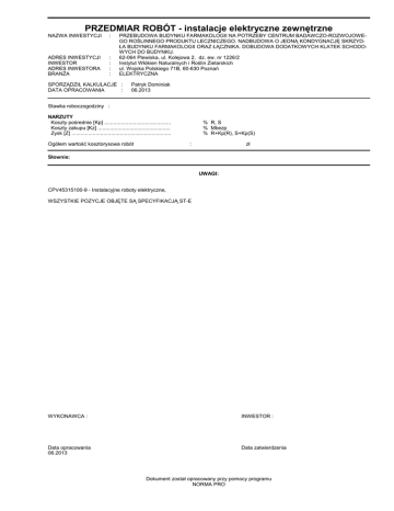 PRZEDMIAR ROBÓT - instalacje elektryczne zewnętrzne NAZWA INWESTYCJI : ADRES INWESTYCJI INWESTOR ADRES INWESTORA BRANŻA : : : : PRZEBUDOWA BUDYNKU FARMAKOLOGII NA POTRZEBY CENTRUM BADAWCZO-ROZWOJOWEGO ROŚLINNEGO PRODUKTU LECZNICZEGO. NADBUDOWA O JEDNĄ KONDYGNACJĘ SKRZYDŁA BUDYNKU FARMAKOLOGII ORAZ ŁĄCZNIKA. DOBUDOWA DODATKOWYCH KLATEK SCHODOWYCH DO BUDYNKU. 62-064 Plewiska, ul. Kolejowa 2, dz. ew. nr 1226/2 Instytut Włókien Naturalnych i Roślin Zielarskich ul. Wojska Polskiego 71B, 60-630 Poznań ELEKTRYCZNA SPORZĄDZIŁ KALKULACJE : DATA OPRACOWANIA : Patryk Dominiak 06.2013 Stawka roboczogodziny : NARZUTY Koszty pośrednie [Kp] ............................................ Koszty zakupu [Kz] ................................................ Zysk [Z] .................................................................. Ogółem wartość kosztorysowa robót % R, S % Mbezp % R+Kp(R), S+Kp(S) : zł Słownie: UWAGI: CPV45315100-9 - Instalacyjne roboty elektryczne, WSZYSTKIE POZYCJE OBJĘTE SĄ SPECYFIKACJĄ ST-E WYKONAWCA : INWESTOR : Data opracowania 06.2013 Data zatwierdzenia Dokument został opracowany przy pomocy programu NORMA PRO OGÓLNA CHARAKTERYSTYKA OBIEKTU 1.Zasilanie i sterowanie oświetleniem Zasilanie i sterowanie oświetleniem parkowym na przyległym terenie należy wykonać z istniejących rozdzielnic głównych budynku 9 i 1A. Projektuje się sterowanie za pomocą zegara astronomicznego lub wyłącznika zmierzchowego z możliwością ręcznego sterowania. 2.Oświetlenie zewnętrzne Na terenie przyległym projektuje się oświetlenie zewnętrzne, instalacje należy wykonać zgodnie z załączonym zagospodarowaniem terenu. Instalacje należy wykonać kablem YAKAY, YKY (wg oznaczenia zgodnie ze schematem i planem zagospodarowania). Wraz z trasami kablowymi na dnie wykopu należy prowadzić drut stalowy Fe-Zn 8mm jako uziom powierzchniowy, drut należy łączyć z uziomem budynku i szyną/zaciskiem PE urządzenia elektrycznego przyłączanego, słupów oświetleniowych itp. Dodatkowo na każdym rozgałęzieniu i końcu linii zasilającej należy wykonać uziom pogrążany typu GALMAR, R<10ohm. Kable należy układać na głębokości 0,5m poza pasem drogowym, a w pasie drogowym na głębokości 1,0m, na warstwie piasku o grubości co najmniej 10cm. Kable powinny być ułożone w wykopie linia falistą z zapasem (3% długości wykopu) wystarczającym do skompensowania możliwych przesunięć gruntu. Ułożone kable należy zasypać warstwą piasku o grubości co najmniej 10 cm, a następnie warstwą gruntu rodzimego o grubości co najmniej 20 cm. Trasa kabla powinna być na całej długości oznaczona folią z tworzywa sztucznego o trwałym niebieskim kolorze. Odległość folii od kabla powinna wynosić co najmniej 30 cm, a jej szerokość być nie mniejsza niż 20 cm. Pozostałą część wykopu wypełnić gruntem rodzimym. Przy przejściu pod drogami i wjazdami kable układać na głębokości 1m w przepustach wykonanych z rur AROT typu DVK 75 w kolorze niebieskim o średnicy 75mm. Skrzyżowania i zbliżenia kabli z istniejącym uzbrojeniem podziemnym należy wykonać zgodnie z PBUE i PN. W przypadku, gdy z uzasadnionych względów odległości wymagane przez normę nie mogą być zachowane, należy zastosować rury ochronne z PCV. Kable ułożone w ziemi powinny być zaopatrzone na całej długości w trwałe oznaczniki rozmieszczone w odstępach nie większych niż 10 m oraz przy mufach i w miejscach charakterystycznych, np.: skrzyżowaniach, wejściach do rur osłonowych, na końcach kabli. Całość robót kablowych wykonać zgodnie z projektem oraz normami kablowymi PN-76/E-05125, N-SEP 004. 3.Oprawy oświetlenia parkowego Na przyległym terenie projektuje się oświetlenie niskie typu parkowego na aluminiowych słupach z punktem świetlnym na wysokości max. 4,5m ze źródłem światła LED. Dodatkowo do doświetlenia dojścia do budynków projektuje się oprawy oświetleniowe niskie na słupksach max. 1,0m, ze źródłem światła LED. 4.Ochrona od porażeń prądem elektrycznym Z punktu widzenia ochrony przeciwporażeniowej sieć odbiorcza będzie pracować w układzie TN-S z osobnymi przewodami ochronnymi PE i przewodem neutralnymi N. Rozdział przewodu PEN na przewód PE i N nastąpi w rozdzielnicy głównej TM. Dla wszystkich tablic rozdzielczych projektuje się system prądu przemiennego 5-przewodowy (L1,L2,L3, N i PE). Jako środek ochrony dodatkowej przed dotykiem zastosowano szybkie samoczynne wyłączenie zasilania. Dodatkowo zastosowano wyłączniki różnicowo-prądowe o znamionowym prądzie różnicowym ?In=0,03A. -2- Norma PRO Wersja 4.01, Marzec 2003 r. ELE_Plewiska_v24_ZEW.kst KSIĄŻKA PRZEDMIARÓW Lp. Podst Opis i wyliczenia 1 OŚWIETLENIE ZEWNĘTRZNE - CPV45315100-9 - Instalacyjne roboty elektryczne 1 Obsługa geodezyjna punktów pomiarowych d.1 analiza indywidualna 1 2 KNNR 5 d.1 0707-01 analogia 4 KNNR 5 d.1 1001-01 5 KNNR 5 d.1 1001-01 6 KNNR 5 d.1 1001-01 7 KNNR 5 d.1 0701-01 8 KNNR 5 d.1 0706-02 9 KNNR 5 d.1 0702-01 10 KNNR 5 d.1 0705-01 11 KNNR 5 d.1 0707-01 12 KNNR 5 d.1 0707-01 13 KNNR 5 d.1 0726-09 14 KNNR 5 d.1 1204-02 15 KNNR 5 d.1 1204-02 16 KNNR 5 d.1 0705-01 17 KNNR 5 d.1 1003-01 analogia Poszcz Razem usł. usł. 1.000 RAZEM 1.000 110.000 RAZEM 110.000 20.000 RAZEM 20.000 7.000 RAZEM 7.000 13.000 RAZEM 13.000 2.000 RAZEM 2.000 138.240 RAZEM 138.240 288.000 RAZEM 288.000 138.240 RAZEM 138.240 30.000 RAZEM 30.000 262.000 RAZEM 262.000 580.000 RAZEM 580.000 16.000 RAZEM 16.000 13.000 RAZEM 13.000 36.000 RAZEM 36.000 14.400 RAZEM 14.400 Układanie kabli o masie do 0.5 kg/m w rowach kablowych ręcznie - Kabel z ży- m łami Cu YKY-0,6/1kV, 5x2,5 mm2 110 3 KNNR 5 d.1 0726-09 analogia j.m. m Zarobienie na sucho końca kabla 5-żyłowego o przekroju żył do 16 mm2 na szt. napięcie do 1 kV o izolacji i powłoce z tworzyw sztucznych - Końcówka kablowa na żyłach Cu 2,5 mm2 10*2 szt. Montaż i stawianie słupów oświetleniowych - opra