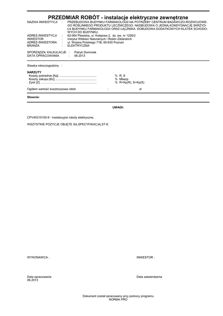 PRZEDMIAR ROBÓT - instalacje elektryczne zewnętrzne
