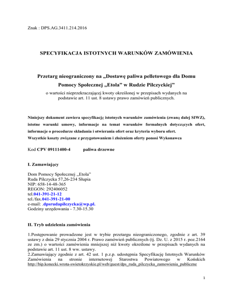 Znak : DPS.AG.3411.214.2016 SPECYFIKACJA ISTOTNYCH WARUNKÓW ZAMÓWIENIA Przetarg nieograniczony na „Dostawę paliwa pelletowego dla Domu Pomocy Społecznej ,,Etola” w Rudzie Pilczyckiej” o wartości nieprzekraczającej kwoty określonej w przepisach wydanych na podstawie art. 11 ust. 8 ustawy prawo zamówień publicznych. Niniejszy dokument zawiera specyfikację istotnych warunków zamówienia (zwaną dalej SIWZ), istotne warunki umowy, informacje na temat warunków formalnych dotyczących ofert, informacje o procedurze składania i otwierania ofert oraz kryteria wyboru ofert. Wszystkie koszty związane z przygotowaniem i złożeniem oferty ponosi Wykonawca Kod CPV 09111400-4 paliwa drzewne I. Zamawiający Dom Pomocy Społecznej ,,Etola” Ruda Pilczycka 57,26-234 Słupia NIP: 658-14-48-365 REGON: 292406052 tel.041-391-21-12 tel./fax.041-391-21-00 e-mail: [email protected]. Godziny urzędowania - 7.30-15.30 II. Tryb udzielenia zamówienia 1.Postępowanie prowadzone jest w trybie przetargu nieograniczonego, zgodnie z art. 39 ustawy z dnia 29 stycznia 2004 r. Prawo zamówień publicznych (tj. Dz. U. z 2015 r. poz.2164 ze zm.) o wartości zamówienia mniejszej niż kwoty określone w przepisach wydanych na podstawie art. 11 ust. 8 ww. ustawy. 2.Zamawiający zgodnie z art. 42 ust. 1 p.z.p. udostępnia Specyfikację Istotnych Warunków Zamówienia na stronie internetowej Starostwa Powiatowego w Końskich http://bip.konecki.wrota-swietokrzyskie.pl/web/guest/dps_ruda_pilczycka_zamowienia_publiczne 1 Specyfikację Istotnych Warunków Zamówienia można uzyskać pod adresem: Dom Pomocy Społecznej ,,Etola” , Ruda Pilczycka 57 , 26-234 Słupia, Dział Administracyjno–Gospodarczy. 3. Postępowanie jest prowadzone z udziałem komisji przetargowej. 4. Postępowanie zostanie unieważnione gdy: Nie zostanie złożona żadna oferta niepodlegająca odrzuceniu, Cena najkorzystniejszej oferty przewyższy kwotę, którą zamawiający może przeznaczyć na sfinansowanie zamówienia, Wystąpi istotna zmiana okoliczności powodująca, że prowadzenie postępowania lub wykonanie zamówienia nie leży w interesie publicznym, czego nie można było wcześniej przewidzieć Zostaną złożone oferty o takiej samej cenie, dodatkowe oferty również będą złożone o takiej samej cenie Postępowanie obarczone będzie wadą uniemożliwiającą zawarcie ważnej umowy w sprawie zamówienia publicznego 5. O unieważnieniu postępowania zamawiający zawiadomi równocześnie wszystkich wykonawców, którzy ubiegali się o udzielenie zamówienia publicznego, podając uzasadnienie faktyczne i prawne. 6. W sprawach nieuregulowanych w treści specyfikacji istotnych warunków zamówienia zastosowanie mają przepisy Prawa Zamówień Publicznych. III. Opis przedmiotu zamówienia: Przedmiotem zamówienia publicznego jest dostawa paliwa pelletowego o parametrach co najmniej określonych w normie DIN PLUS dla pellet drewnianych i spełniających wymagania określone przez producenta kotłów tj.: średnica 6 – 8 mm długość 10- 30 mm wartość opałowa nie niższa niż 18.000 KJ/kg wilgotność nie przekraczająca 10% zawartość popiołu nie przekraczająca 1 % gęstość nie niższa niż 1,1 kg/dm3 w ilości nie mniejszej niż 160 ton a nie większej niż 210 ton , w co najmniej 8 dostawach do kotłowni Domu Pomocy Społecznej ,,Etola” w Rudzie Pilczyckiej na okres grzewczy 2016/2017. W celu potwierdzenia, że oferowany produkt spełnia wyżej określone parametry, Wykonawca zobowiązany jest załączyć do oferty zaświadczenie podmiotu uprawnionego do kontroli jakości, że dostarczany produkt odpowiada określonej powyżej normie. Dostawy zostaną zrealizowane przy użyciu samochodu z naczepą przystosowaną do transportu pelletu luzem z pneumatycznym rozładunkiem pelletu do zbiorników magazynowych u Zamawiającego. Pellet dostarczany będzie na koszt wykonawcy. 2 IV. Części zamówienia Zamawiający nie dopuszcza składania ofert częściowych. V. Zamówienia uzupełniające Zamawiający nie przewiduje zamówień uzupełniających. VI. Oferty wariantowe Zamawiający nie dopuszcza składania ofert wariantowych. VII. Termin wykonania zamówienia Określony w rozdziale III przedmiot zamówienia musi być dostarczony w co najmniej 8 dostawach (każda po około 20 ton). Trzy dostawy przewidziane są na rok 2016 pozostałe będą realizowane w roku 2017. Dostawy będą zależne od możliwości magazynowych Zamawiającego zależnych od ilości spalanego paliwa (temperatury powietrza). Szczegółowe terminy dostaw będę uzgadniane każdorazowo na 4 dni przed planowanym terminem dostaw. Wymagany termin wykonania zamówienia - do 30 września 2017r. VIII. Opis warunków udziału w postępowaniu oraz ocena sposobu dokonywania oceny spełnienia tych warunków 1. Warunki udziału w postępowaniu O udzielenie zamówienia mogą ubiegać się oferenci, którzy spełnią następujące warunki: 1) określone w art. 22 ust. 1 ustawy Prawo zamówień publicznych (PZP) 2) nie podlegają wykluczeniu z postępowania na podstawie art. 24 ust. 1 pkt 12-23 i ust. 5 pkt. 1 i 8 PZP 3) prowadzą działalność gospodarczą, w zakresie której mieści się działalność związana z przedmiotem zamówienia; 4) spełniają wszystkie warunki określone w niniejszej Specyfikacji Istotnych Warunków Zamówienia; 2. Sposób oceny spełnienia warunków udziału w postępowaniu Zamawiający oceni spełnienie ww. warunków na podstawie złożonych oświadczeń lub dokumentów dołączonych do oferty wg formuły spełnia lub nie spełnia. IX. Wykaz oświadczeń lub dokumentów, jakie mają dostarczyć wykonawcy w celu potwierdzenia spełnienia warunków udziału w postępowaniu W celu potwierdzenia warunków udziału w postępowaniu Wykonawca zobowiązany jest dołączyć następujące oświadczenia lub dokumenty: 3 1. Wymagane dokumenty: 1.1.Aktualny odpis z właściwego rejestru, jeżeli odrębne przepisy wymagają wpisu do rejestru, w celu 