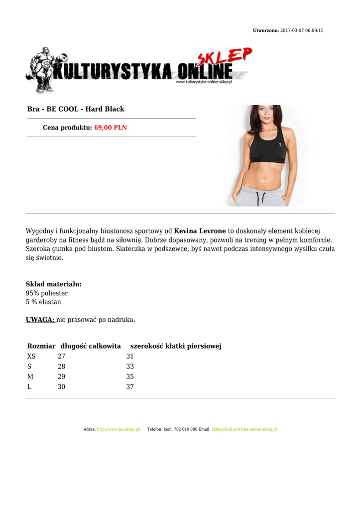 Utworzono: 2017-03-07 06:09:15 Bra - BE COOL - Hard Black Cena produktu: 69,00 PLN Wygodny i funkcjonalny biustonosz sportowy od Kevina Levrone to doskonały element kobiecej garderoby na fitness bądź na siłownię. Dobrze dopasowany, pozwoli na trening w pełnym komforcie. Szeroka gumka pod biustem. Siateczka w podszewce, byś nawet podczas intensywnego wysiłku czuła się świetnie. Skład materiału: 95% poliester 5 % elastan UWAGA: nie prasować po nadruku. Rozmiar długość całkowita szerokość klatki piersiowej XS 27 31 S 28 33 M 29 35 L 30 37 Adres: http://www.ko.sklep.pl/ Telefon: kom. 782 010 880 Email: [email protected]