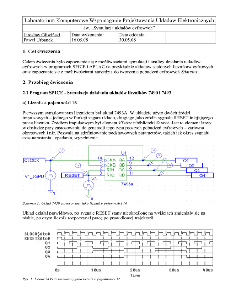 Laboratorium Komputerowe Wspomaganie Projektowania Układów Elektronicznych ćw. „Symulacja układów cyfrowych” Jarosław Gliwiński, Paweł Urbanek Data wykonania: 16.05.08 Data oddania: 30.05.08 1. Cel ćwiczenia Celem ćwiczenia było zapoznanie się z możliwościami symulacji i analizy działania układów cyfrowych w programach SPICE i APLAC na przykładzie układów scalonych liczników cyfrowych oraz zapoznanie się z możliwościami narzędzia do tworzenia pobudzeń cyfrowych Stimulus. 2. Przebieg ćwiczenia 2.1 Program SPICE - Symulacja działania układów liczników 7490 i 7493 a) Licznik o pojemności 16 Pierwszym symulowanym licznikiem był układ 7493A. W układzie użyto dwóch źródeł impulsowych – jednego w funkcji zegara układu, drugiego jako źródła sygnału RESET inicjującego pracę licznika. Źródłem impulsowym był element VPulse z biblioteki Source. Jest to element łatwy w obsłudze przy zastosowaniu do generacji tego typu prostych pobudzeń cyfrowych – zarówno okresowych i nie. Pozwala na zdefiniowanie podstawowych parametrów, takich jak okres sygnału, czas narastania i opadania, wypełnienie. Schemat 1: Układ 7439 zastosowany jako licznik o pojemności 16 Układ działał prawidłowo, po sygnale RESET stany nieokreślone na wyjściach zmieniały się na niskie, po czym licznik rozpoczynał pracę po prawidłowej trajektorii. Rys. 1: Układ 7439 zastosowany jako licznik o pojemności 16 b) Licznik o pojemności 10 W kolejnym układzie wykorzystano licznik 7490A o trajektorii długości 10. Procedura symulacyjna nie uległa żadnym zmianom, jedyną różnicą było użycie innych metod generowanie wymuszeń cyfrowych. Schemat 2: Układ 7490 zastosowany jako licznik o pojemności 10 Do generacji sygnału zegarowego użyto dedykowanego do tego celu elementu DigClock. Jako że element jest przystosowany właśnie do generacji taktu zegara, nie należy ustawiać tak dużej liczby parametrów jak w przypadku generacji przy pomocy VPulse. Wystarczą dwa parametry: ONTIME i OFFTIME odpowiadające za wypełnienie, plus ewentualnie czas rozpoczęcia. Natomiast sygnał RESET wygenerowano za pomocą programu Stimulus. Wersja studencka uniemożliwiała generację sygnału nieokresowego, użyto więc sygnału okresowego o okresie dłuższym od czasu symulacji, dzięki czemu uzyskano pozorną aperiodyczność. Rys. 2: Układ 7490 zastosowany jako licznik o pojemności 10 c) Licznik o pojemności 12 ci) Schemat 3: Układ 7492 zastosowany jako licznik o pojemności 12 W układzie licznika o pojemności 12 wykorzystano układ 7492A. Po raz kolejny wykorzystano inne niż poprzednio metody generacji wymuszeń. Do generacji sygnału RESET użyto elementu DSTM, natomiast do sygnału zegarowego użyto elementu FileStim wczytującego przebieg z pliku. Takie użycie elementów wyło w oczywisty sposób nieoptymalne – mowa oczywiście o wczytywaniu z pliku sygnału zegarowego. Zamiast wprowadzić 2 parametry tak jak przy poprzedniej metodzie generacji sygnału zegarowego, tym razem należało wielokrotnie skopiować kolumnę zer i jedynek poprzedzonych czasami wypisanymi w równych odstępach. Rys. 3: Układ 7492 zastosowany jako licznik o pojemności 12 2.1 Program APLAC – analiza układów cyfrowych c) Symulacja układu komparatora 2-bitowego Kolejnym symulowanym układem był komparator 2-bitowy. Wyjście komparatora było w stanie wysokim, gdy słowa binarne A0A1 i B0B1 były takie same, w pozostałych przypadkach niskie. Największą trudnością w budowie układu było polecenie sterujące obiektu WordGenerator – ponieważ środowisko nie udostępnia dla elementów logicznych obecnych w innych elementach podpowiedzi informujących jak nazywają się poszczególne parametry obiektu. Użyto polecenia RANDOM [lista_wartości_oddzielana_przecinkami] do generacji losowych słów w obydwu generatorach. Schemat 4: Układ komparatora 2-bitowego Istotnymi szczegółami programu symulacyjnego są wpisy DELTAT oraz LOGICHIGH określające odpowiednio <coś> oraz wartość liczbową logicznego stanu wysokiego. Rys. 4: Układ komparatora 2-bitowego 3. Zadania dodatkowe 8-bitowe przetworniki AC i CA Zadaniem dodatkowym w programie SPICE była symulacja układu układu kwantującego i próbkującego napięcie przy pomocy przetwornika AC, a następnie przywracającego sygnał analogowy o wartościach przedziałami stałych, zgodnie z uzyskanymi wcześniej sygnałami cyfrowymi. Schemat 5: Symulacja działania przetworników AC i CA Jak można było odczytać w programie Probe, przedział kwantowania miał szerokość ok. 39mV, co przy 8-bitowej reprezentacji dawało zakres o szerokości ok. 9,96V. Testy wykonano dla jednego okresu przykładowego przebiegu sinusoidalnego wytworzonego źródłem VSin o amplitudzie 500mV i składowej stałej 5V (pochodzącej ze źródła VSrc). Rys. 5: Symulacja działania przetworników AC i CA Przerzutnik RS na bramkach NAND Schemat 6: Przerzutnik RS zbudowany na bramkach NAND Ostatnim symulowanym układem był układ przerzutnika RS. Tym razem użyto obiektów BitGenerator z użyciem polecenia PATTERN = ciąg_binarny. Kolejnym istotnym elementem niezbędnym do symulacji układu było określenie opóźnienia czasowego działania bramek NAND (DELAY = czas_opóźnienia). W przypadku niezdefiniowania tego parametru symulacja układu była niemożliwa. Rys. 6: Przerzutnik RS zbudowany na bramkach NAND 3. Pytania sprawdzające Czy podczas analizy układów cyfrowych jest różnica pomiędzy zastosowaniem wymuszeń analogowych i cyfrowych? W programie SPICE możliwe jest bezpośrednie zastosowanie źródła analogowego jako np. zegara (źródło impulsowe). W APLACu należy zastosować specjalny element ADInterface. W testowanych układach nie ma różnicy pomiędzy obydwoma przypadkami, choć oczywiście łatwo sobie wyobrazić sytuację, gdy wyidealizowane źródło cyfrowe o idealnie stromych zboczach da inne wyniki symulacji niż impulsowe