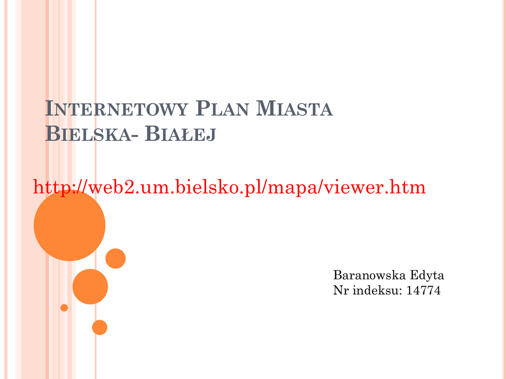INTERNETOWY PLAN MIASTA BIELSKA- BIAŁEJ http://web2.um.bielsko.pl/mapa/viewer.htm Baranowska Edyta Nr indeksu: 14774 STRONA GŁÓWNA Przyzwoita szybkość ładowania Strona należy do Urzędu Miejskiego w Bielsku Białej Internetowy Plan Miasta został opracowany i jest aktualizowany przez zespół do spraw GIS w Wydziale Informatyki Urzędu Miejskiego Bielska Białej Brak danych na temat dat utworzenia i ostatnich aktualizacji serwisu Użytkownik może wpływać na treść mapy, zmieniając widoczność warstw umieszczonych na liście z prawej strony okna mapy. Widoczna warstwa zaznaczona jest symbolem w kolumnie „widoczne” Zatwierdzanie zmian w ustawieniach widoczności warstw wymaga użycia klawisza WYSZUKIWANIE Funkcje identyfikacji oraz wyszukiwania odnoszą się wyłącznie do obiektów aktywnej warstwy, zaznaczonej symbolem w kolumnie „ aktywne” na liście warstw Funkcja wyszukiwania operuje na ciągach znaków i zwraca wszystkie obiekty spełniające wpisane przez użytkownika kryterium wyboru. Zapytanie uwzględnia wielkość liter i spacje. Wyniki wyszukiwania wyświetlane są w tabeli w kolejności losowej , w grupach liczących po 25 elementów. Czytelna legenda Proste funkcje dostępne w Internetowym Planie Miasta szczegółowo opisane Szczegóły mapy są widoczne przy wystarczająco dużym powiększeniu jej widoku. Wyselekcjonowane obiekty są w kolorach żółtym lub czerwonym Przeskalowanie mapy zajmuje ok 3-6 sekund Za pomocą dostępnych funkcji można zmierzyć odległość odcinka jaki interesuje użytkownika serwisu WADY Stosunkowo nie proste znalezienie serwisu Mała przejrzystość serwisu Brak możliwości wyboru skali w konkretnym przedziale, możliwe jest jedynie przybliżanie i oddalanie za pomocą przycisków + i