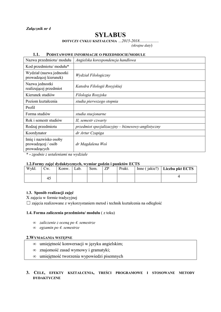 Załącznik nr 4 SYLABUS DOTYCZY CYKLU KSZTAŁCENIA 1.1. ...2015-2018................... (skrajne daty) PODSTAWOWE INFORMACJE O PRZEDMIOCIE/MODULE Nazwa przedmiotu/ modułu Angielska korespondencja handlowa Kod przedmiotu/ modułu* Wydział (nazwa jednostki prowadzącej kierunek) Wydział Filologiczny Nazwa jednostki realizującej przedmiot Katedra Filologii Rosyjskiej Kierunek studiów Filologia Rosyjska Poziom kształcenia studia pierwszego stopnia Profil Forma studiów studia stacjonarne Rok i semestr studiów II, semestr czwarty Rodzaj przedmiotu przedmiot specjalizacyjny – biznesowy-anglistyczny Koordynator dr Artur Czapiga Imię i nazwisko osoby prowadzącej / osób dr Magdalena Woś prowadzących * - zgodnie z ustaleniami na wydziale 1.2.Formy zajęć dydaktycznych, wymiar godzin i punktów ECTS Wykł. Ćw. Konw. Lab. Sem. ZP Prakt. Inne ( jakie?) Liczba pkt ECTS 4 45 1.3. Sposób realizacji zajęć X zajęcia w formie tradycyjnej ☐ zajęcia realizowane z wykorzystaniem metod i technik kształcenia na odległość 1.4. Forma zaliczenia przedmiotu/ modułu ( z toku) • • zaliczenie z oceną po 4. semestrze egzamin po 4. semestrze 2.WYMAGANIA WSTĘPNE • umiejętność konwersacji w języku angielskim; • znajomość zasad wymowy i gramatyki; • umiejętność tworzenia wypowiedzi pisemnych 3. CELE, EFEKTY DYDAKTYCZNE KSZTAŁCENIA, TREŚCI PROGRAMOWE I STOSOWANE METODY 3.1. Cele przedmiotu/modułu C1 Rozwijanie umiejętności językowo-komunikacyjnych w zakresie języka angielskiego biznesu w piśmie i korespondencji handlowej (czytanie i pisanie) C2 Kształtowanie kompetencji socjokulturowej studentów C3 Rozwijanie samodzielności studentów w zakresie kształtowania różnorodnych kompetencji w quasirealnych sytuacjach biznesowych, gdzie konieczna jest analiza i tworzenie tekstów C4 Poszerzanie bazy słownictwa specjalistycznego C5 Rozwijanie znajomości gramatyki i ortografii C6 Poznawanie schematów pism urzędowych i formalnych C7 Kształtowanie umiejętności wykonywania ćwiczeń pisemnych z wykorzystaniem poznanych struktur leksykalno-gramatycznych 3.2 EFEKTY KSZTAŁCENIA DLA PRZEDMIOTU/ MODUŁU EK ( efekt kształcenia) Treść efektu kształcenia zdefiniowanego dla przedmiotu (modułu) EK_01 Wiedza: Odniesienie do efektów kierunkowych (KEK) K_W01 K_W09 - student zdobywa merytoryczną wiedzę w zakresie angielskiego K_W10 języka biznesu ze szczególnym uwzględnieniem korespondencji K_W12 handlowej i biznesowej; - przyswaja zasady poprawnego posługiwania się tym językiem, analizuje i tworzy własne teksty; - opanowuje schematy pism; - przyswaja materiał leksykalno-gramatyczny; - stosuje właściwą leksykę specjalistyczną. EK_02 Umiejętności: - student poprawnie formułuje wypowiedzi pisemne specjalistycznej odmianie języka angielskiego; - właściwie interpretuje teksty pisane w tym języku; - posiada bogaty zasób słownictwa specjalistycznego; - dobiera właściwe formy gramatyczne; - potrafi zastosować właściwy schemat pisma. EK_03 Kompetencje społeczne: K_U01 K_U03 w K_U14 K_K01 K_K02 - student zachowuje ostrożność i krytycyzm w stosunku do K_K03 poprawności własnych tekstów pisemnych; K_K04 - troszczy się o poprawność językową i merytoryczną tworzonych przez siebie tekstów; - potrafi oceniać poprawność innych tekstów biznesowych w języku angielskim; - jest świadomy konieczności pogłębiania swojej wiedzy w zakresie angielskiej korespondencji handlowej i jej przydatności w pracy zawodowej - potrafi współdziałać i pracować w grupie, przyjmując w niej różne role. 3.3 TREŚCI PROGRAMOWE A. Problematyka wykładu Treści merytoryczne B. Problematyka ćwiczeń audytoryjnych, konwersatoryjnych, laboratoryjnych, zajęć praktycznych Treści merytoryczne semestr 3 Podstawowe zasady tworzenia pism handlowych – układ, elementy pisma Pisanie i analiza pism związanych z szukaniem i ubieganiem się o pracę: życiorys, list motywacyjny, referencje Cechy korespondencji handlowej – typowe zwroty i wyrażenia Korespondencja handlowa wewnątrz i poza firmą: raport i memo Korespondencja finansowa: raport, zeznanie, statystyka Korespondencja przesyłana drogą elektroniczną – styl, akronimy Korespondencja wewnątrz firmy: gratulacje, podziękowanie, powitanie, pożegnanie, przekazywanie dobrych i złych wiadomości, przypomnienie Korespondencja między firmami: zapytanie – odpowiedź na zapytanie; oferta; zamówienie – potwierdzenie zamówienia Dokumenty potwierdzające transakcje kupna-sprzedaży Analiza faktur, rachunków i wyciągów bankowych Wzory pism procesowych i umów prawnych Razem: 3.4 • • • • • • • • • 4 METODY DYDAKTYCZNE analiza i interpretacja tekstów z dyskusją o ich poprawności, efektywności itp. metoda podająca metoda projektów burza mózgów pokazy multimedialne dyskusja panelowa metody hierarchizacji dyskusja praca w parach, grupach i praca indywidualna METODY I KRYTERIA OCENY 4.1 Sposoby weryfikacji efektów kształcenia 6 6 3 5 5 3 5 4 3 3 2 45 Symbol efektu EK_01 EK_02 EK_03 Metody oceny efektów kształcenia ( np.: kolokwium, egzamin ustny, egzamin pisemny, projekt, sprawozdanie, obserwacja w trakcie zajęć) Kolokwium, odpowiedź ustna i pisemna, samodzielne przygotowanie pokazu multimedialnego i jego prezentacja, egzamin pisemny Samodzielne tworzenie prezentacji multimedialnych i opracowywanie dokumentów handlowych i biznesowych, obserwacja na zajęciach, egzamin pisemny Obserwacja na zajęciach, egzamin pisemny Forma zajęć dydaktycznych ( w, ćw, …) Ćw. Ćw. Ćw. 4.2 Warunki zaliczenia przedmiotu (kryteria oceniania) Zaliczenie z oceną na podstawie aktywnego uczestnictwa w zajęciach, zaliczenia kolokwiów i innych prac pisemnych, przygotowania i prezentacji pokazu multimedialnego 5. Całkowity nakład pracy studenta potrzebny do osiągnięcia założonych efektów w godzinach oraz punktach ECTS Aktywność Liczba godzin/ nakład pracy studenta godziny zajęć wg