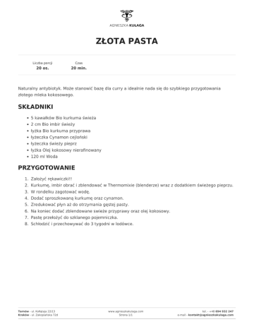 ZŁOTA PASTA Liczba porcji Czas 20 os. 20 min. Naturalny antybiotyk. Może stanowić bazę dla curry a idealnie nada się do szybkiego przygotowania złotego mleka kokosowego. SKŁADNIKI 5 kawałków Bio kurkuma świeża 2 cm Bio imbir świeży łyżka Bio kurkuma przyprawa łyżeczka Cynamon cejloński łyżeczka świeży pieprz łyżka Olej kokosowy nierafinowany 120 ml Woda PRZYGOTOWANIE 1. Założyć rękawiczki!! 2. Kurkumę, imbir obrać i zblendować w Thermomixie (blenderze) wraz z dodatkiem świeżego pieprzu. 3. W rondelku zagotować wodę. 4. Dodać sproszkowaną kurkumę oraz cynamon. 5. Zredukować płyn aż do otrzymania gęstej pasty. 6. Na koniec dodać zblendowane swieże przyprawy oraz olej kokosowy. 7. Pastę przełożyć do szklanego pojemniczka. 8. Schłodzić i przechowywać do 3 tygodni w lodówce. Tarnów - ul. Kołłątaja 22/13 Kraków - ul. Zakopiańska 72d www.agnieszkakulaga.com Strona 1/1 tel. - +48 694 932 247 e-mail - [email protected]