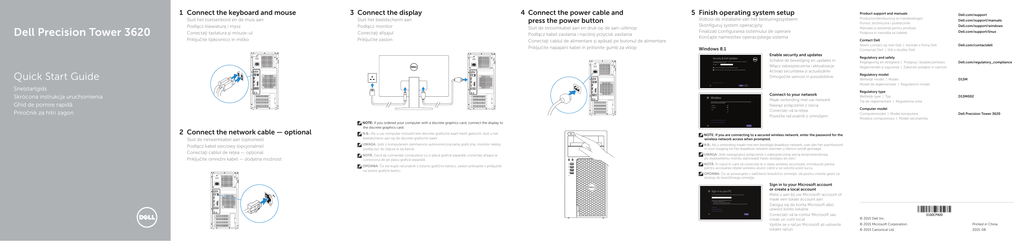 1 Connect the keyboard and mouse Dell Precision Tower 3620 Sluit het toetsenbord en de muis aan Podłącz klawiaturę i mysz Conectaţi tastatura şi mouse-ul Priključite tipkovnico in miško 3 Connect the display Sluit het beeldscherm aan Podłącz monitor Conectaţi afişajul Priključite zaslon 4 Connect the power cable and press the power button Sluit de stroomkabel aan en druk op de aan-uitknop Podłącz kabel zasilania i naciśnij przycisk zasilania Conectaţi cablul de alimentare şi apăsaţi pe butonul de alimentare Priključite napajalni kabel in pritisnite gumb za vklop 5 Finish operating system setup Voltooi de installatie van het besturingssysteem Skonfiguruj system operacyjny Finalizați configurarea sistemului de operare Končajte namestitev operacijskega sistema Windows 8.1 Enable security and updates Schakel de beveiliging en updates in Włącz zabezpieczenia i aktualizacje Activați securitatea și actualizările Omogočite varnost in posodobitve Quick Start Guide Snelstartgids Skrócona instrukcja uruchomienia Ghid de pornire rapidă Priročnik za hitri zagon Connect to your network Maak verbinding met uw netwerk Nawiąż połączenie z siecią Conectați-vă la rețea Povežite računalnik z omrežjem 2 Connect the network cable — optional Sluit de netwerkkabel aan (optioneel) Podłącz kabel sieciowy (opcjonalnie) Conectaţi cablul de reţea — opţional Priključite omrežni kabel — dodatna možnost Product support and manuals Productondersteuning en handleidingen Pomoc techniczna i podręczniki Manuale și asistență pentru produse Podpora in navodila za izdelek Dell.com/support Dell.com/support/manuals Dell.com/support/windows Dell.com/support/linux Contact Dell Neem contact op met Dell | Kontakt z firmą Dell Contactați Dell | Stik z družbo Dell Dell.com/contactdell Regulatory and safety Regelgeving en veiligheid | Przepisy i bezpieczeństwo Reglementări și siguranță | Zakonski predpisi in varnost Dell.com/regulatory_compliance Regulatory model Wettelijk model | Model Model de reglementare | Regulatorni model D13M Regulatory type Wettelijk type | Typ Tip de reglementare | Regulativna vrsta D13M002 Computer model Computermodel | Model komputera Modelul computerului | Model računalnika Dell Precision Tower 3620 NOTE: If you ordered your computer with a discrete graphics card, connect the display to the discrete graphics card. N.B.: als u uw computer inclusief een discrete grafische kaart heeft gekocht, sluit u het beeldscherm aan op de discrete grafische kaart. NOTE: If you are connecting to a secured wireless network, enter the password for the wireless network access when prompted. UWAGA: Jeśli z komputerem zamówiono autonomiczną kartę graficzną, monitor należy podłączyć do złącza w tej karcie. N.B.: Als u verbinding maakt met een beveiligd draadloos netwerk, voer dan het wachtwoord in voor toegang tot het draadloze netwerk wanneer u hierom wordt gevraagd. NOTĂ: Dacă aţi comandat computerul cu o placă grafică separată, conectaţi afişajul la conectorul de pe placa grafică separată. UWAGA: Jeśli nawiązujesz połączenie z zabezpieczoną siecią bezprzewodową, po wyświetleniu monitu wprowadź hasło dostępu do sieci. OPOMBA: Če ste kupili računalnik z ločeno grafično kartico, zaslon priklopite v priključek na ločeni grafični kartici. NOTĂ: În cazul în care vă conectaţi la o reţea wireless securizată, introduceţi parola pentru accesarea reţelei wireless atunci când vi se solicită acest lucru. OPOMBA: Če se povezujete v zaščiteno brezžično omrežje, ob pozivu vnesite geslo za dostop do brezžičnega omrežja. Sign in to your Microsoft account or create a local account Meld u aan bij uw Microsoft-account of maak een lokale account aan Zaloguj się do konta Microsoft albo utwórz konto lokalne Conectați-vă la contul Microsoft sau creați un cont local Vpišite se v račun Microsoft ali ustvarite lokalni račun © 2015 Dell Inc. © 2015 Microsoft Corporation. Printed in China. © 2015 Canonical Ltd. 2015-08 Windows 7 Set up password for Windows Stel wachtwoord voor Windows in Ustaw hasło systemu Windows Configurați o parolă pentru Windows Določite geslo za Windows Connect to your network Maak verbinding met uw netwerk Nawiąż połączenie z siecią Conectați-vă la rețea Povežite računalnik z omrežjem NOTE: If you are connecting to a secured wireless network, enter the password for the wireless network access when prompted. N.B.: Als u verbinding maakt met een beveiligd draadloos netwerk, voer dan het wachtwoord in voor toegang tot het draadloze netwerk wanneer u hierom wordt gevraagd. UWAGA: Jeśli nawiązujesz połączenie z zabezpieczoną siecią bezprzewodową, po wyświetleniu monitu wprowadź hasło dostępu do sieci. NOTĂ: În cazul în care vă conectaţi la o reţea wireless securizată, introduceţi parola pentru accesarea reţelei wireless atunci când vi se solicită acest lucru. OPOMBA: Če se povezujete v zaščiteno brezžično omrežje, ob pozivu vnesite geslo za dostop do brezžičnega omrežja. Protect your computer Beveilig de computer Zabezpiecz komputer Protejați-vă computerul Zaščitite svoj računalnik Ubuntu Follow the instructions on the screen to finish setup. Volg de instructies op het scherm om de setup te voltooien. Postępuj zgodnie z instrukcjami wyświetlanymi na ekranie, aby ukończyć proces konfiguracji. Urmaţi instrucţiunile de pe ecran pentru a finaliza configurarea. Sledite navodilom na zaslonu in zaključite namestitev. Locate Dell apps in Windows 8.1 Features Zoek Dell-apps in Windows 8.1 Odszukaj aplikacje Dell w systemie Windows 8.1 Localizaţi aplicaţii Dell în Windows 8.1 Poiščite lokacije aplikacij Dell v Windows 8.1 Kenmerken | Funkcje | Caracteristici | Funkcije Register My Device Dell Backup and Recovery Register your computer Registreer de computer | Zarejestruj komputer Înregistrați-vă computerul | Registrirajte svoj računalnik Backup