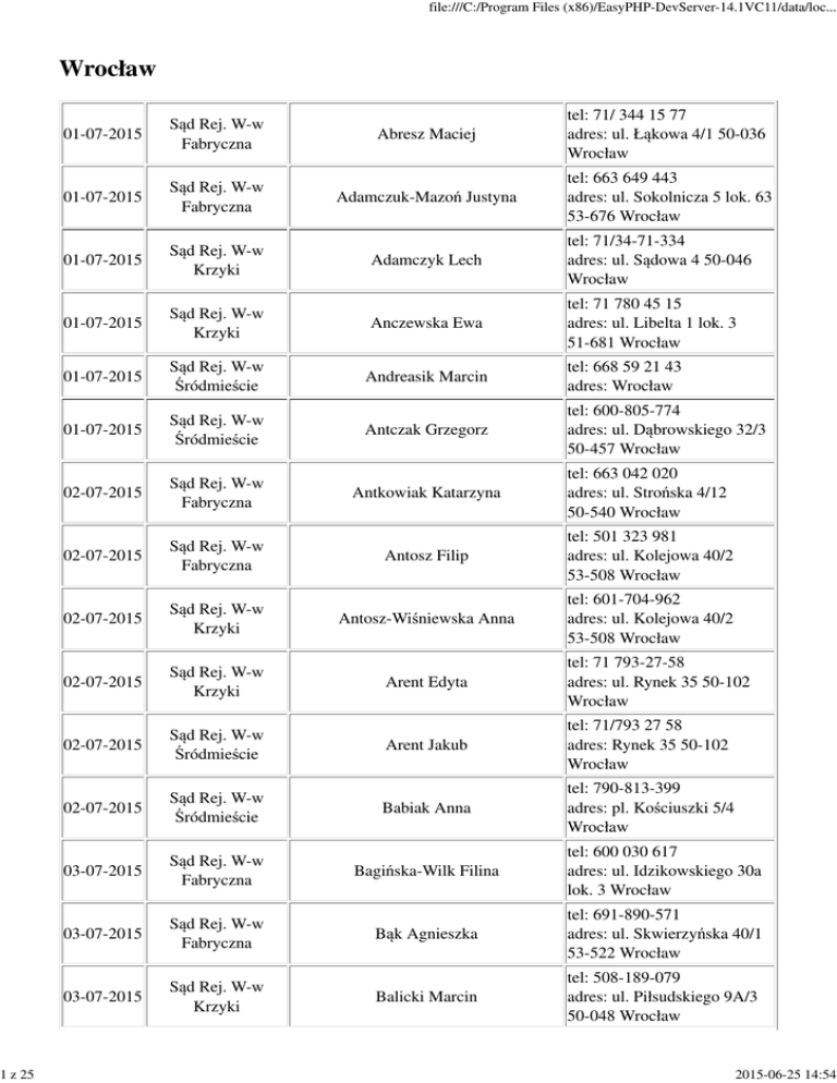 1 z 25 file:///C:/Program Files (x86)/EasyPHP-DevServer-14.1VC11/data/loc... Wrocław Abresz Maciej tel: 71/ 344 15 77 adres: ul. Łąkowa 4/1 50-036 Wrocław Adamczuk-Mazoń Justyna tel: 663 649 443 adres: ul. Sokolnicza 5 lok. 63 53-676 Wrocław 01-07-2015 Sąd Rej. W-w Fabryczna 01-07-2015 Sąd Rej. W-w Fabryczna 01-07-2015 Sąd Rej. W-w Krzyki Adamczyk Lech tel: 71/34-71-334 adres: ul. Sądowa 4 50-046 Wrocław 01-07-2015 Sąd Rej. W-w Krzyki Anczewska Ewa tel: 71 780 45 15 adres: ul. Libelta 1 lok. 3 51-681 Wrocław 01-07-2015 Sąd Rej. W-w Śródmieście Andreasik Marcin tel: 668 59 21 43 adres: Wrocław 01-07-2015 Sąd Rej. W-w Śródmieście Antczak Grzegorz tel: 600-805-774 adres: ul. Dąbrowskiego 32/3 50-457 Wrocław 02-07-2015 Sąd Rej. W-w Fabryczna Antkowiak Katarzyna tel: 663 042 020 adres: ul. Strońska 4/12 50-540 Wrocław 02-07-2015 Sąd Rej. W-w Fabryczna Antosz Filip tel: 501 323 981 adres: ul. Kolejowa 40/2 53-508 Wrocław 02-07-2015 Sąd Rej. W-w Krzyki Antosz-Wiśniewska Anna tel: 601-704-962 adres: ul. Kolejowa 40/2 53-508 Wrocław 02-07-2015 Sąd Rej. W-w Krzyki Arent Edyta tel: 71 793-27-58 adres: ul. Rynek 35 50-102 Wrocław 02-07-2015 Sąd Rej. W-w Śródmieście Arent Jakub tel: 71/793 27 58 adres: Rynek 35 50-102 Wrocław 02-07-2015 Sąd Rej. W-w Śródmieście Babiak Anna tel: 790-813-399 adres: pl. Kościuszki 5/4 Wrocław 03-07-2015 Sąd Rej. W-w Fabryczna Bagińska-Wilk Filina tel: 600 030 617 adres: ul. Idzikowskiego 30a lok. 3 Wrocław 03-07-2015 Sąd Rej. W-w Fabryczna Bąk Agnieszka tel: 691-890-571 adres: ul. Skwierzyńska 40/1 53-522 Wrocław 03-07-2015 Sąd Rej. W-w Krzyki Balicki Marcin tel: 508-189-079 adres: ul. Piłsudskiego 9A/3 50-048 Wrocław 2015-06-25 14:54 file:///C:/Program Files (x86)/EasyPHP-DevServer-14.1VC11/data/loc... 03-07-2015 Sąd Rej. W-w Krzyki Banaszewska Jadwiga 03-07-2015 Sąd Rej. W-w Śródmieście Banaszewska Maria 03-07-2015 Sąd Rej. W-w Śródmieście 04-07-2015 Sąd Rej. W-w Fabryczna tel: /71/34 306 12 adres: Wrocław Baranowska Aleksandra tel: 71/ 787-41-01 adres: ul. Grabiszyńska 16/2 Wrocław Barski Krzysztof tel: 607 105 428 adres: ul. Kamieńskiego 61A Wrocław 04-07-2015 Sąd Rej. W-w Fabryczna Bartoszko Waldemar tel: 71/793-20-60 adres: ul. Podwale 2 lok. 17 50-043 Wrocław 04-07-2015 Sąd Rej. W-w Krzyki Basiński Michał tel: 71/722 42 85 adres: ul. Dubois 4/6 50-208 Wrocław 04-07-2015 Sąd Rej. W-w Krzyki Bałchanowski Maciej tel: /71/34-71-375 adres: ul. Sądowa 4 50-046 Wrocław 04-07-2015 2 z 25 tel: 71/34-306-12 adres: ul. Piłsudskiego 3/3 50-049 Wrocław Sąd Rej. W-w Śródmieście Bedryj Karolina tel: 71/ 789 39 07 adres: pl. Powstańców Śląskich 17a/223 53-329 Wrocław Bedryj Ryszard tel: 71/ 789 39 07 adres: pl. Powstańców Śląskich 17a/223 53-329 Wrocław 04-07-2015 Sąd Rej. W-w Śródmieście 05-07-2015 Sąd Rej. W-w Fabryczna 05-07-2015 Sąd Rej. W-w Fabryczna 05-07-2015 Sąd Rej. W-w Krzyki tel: 71/367-43-02 Bezlapowicz-Modzelewska Małgorzata adres: ul. Gliniana 41/1 50-525 Wrocław 05-07-2015 Sąd Rej. W-w Krzyki tel: 71 37-72-180 adres: Łuczan 5 52-339 Wrocław 05-07-2015 Sąd Rej. W-w Śródmieście 05-07-2015 Sąd Rej. W-w Śródmieście Berestecka Monika Bergtraum Maksymilian Bieć Jan Bieda Mirela Biedroń Dagmara tel: 71 72 77 333 adres: ul. Drobnera 10 lok. 101 50-257 Wrocław tel: 792 260 882 adres: ul. Ostrowskiego 9, V piętro 53-238 Wrocław tel: adres: ul. Srebrnogórska 2/3 50-536 Wrocław tel: 609-635-184 adres: ul. Strzegomska 42N/12 Wrocław 2015-06-25 14:54 file:///C:/Program Files (x86)/EasyPHP-DevServer-14.1VC11/data/loc... 3 z 25 tel: 71/372-35-89 adres: ul. Piłsudskiego7/6 50-048 Wrocław 06-07-2015 Sąd Rej. W-w Fabryczna 06-07-2015 Sąd Rej. W-w Fabryczna Biernat Grażyna tel: 71/343-76-12 adres: ul. Krawiecka 3 lok. 85 50-148 Wrocław 06-07-2015 Sąd Rej. W-w Krzyki Biernat Krzysztof tel: 71 794-70-40 adres: ul. Kościuszki 108a lok. 31 50-441 Wrocław 06-07-2015 Sąd Rej. W-w Krzyki Bijas Jacek tel: 781 55 55 adres: ul. Skierniewicka 7A 53-117 Wrocław Birka Józef tel: 71 7747825 adres: Wrocław, ul. Świdnicka 21/23 50-066 Wrocław Birka Kamil tel: 71 7747825 adres: ul. Świdnicka 21/23 50-066 Wrocław 06-07-2015 Sąd Rej. W-w Śródmieście 06-07-2015 Sąd Rej. W-w Śródmieście 07-07-2015 Sąd Rej. W-w Fabryczna Bielecka-Binko Katarzyna Blechinger-Pasich Marzena tel: 71/788-96-70 adres: ul. Łąkowa 2/3 50-036 Wrocław 07-07-2015 Sąd Rej. W-w Fabryczna Bliźniak Cezary tel: 503 571 608 adres: ul. Kazimierza Wielkiego 9 lok.305 50-077 Wrocław 07-07-2015 Sąd Rej. W-w Krzyki Bocianowski Andrzej tel: 504-425-478 adres: pl. Legionów 5/7 50-047 Wrocław Bogdański Szymoc tel: 501 358 285 adres: pl. Powstańców Śląskich 17a/216 53-329 Wrocław Bojko Dariusz tel: 372-38-72 adres: ul. Tęczowa 11/9 53-601 Wrocław 07-07-2015 Sąd Rej. W-w Krzyki 07-07-2015 Sąd Rej. W-w Śródmieście 07-07-2015 Sąd Rej. W-w Śródmieście 08-07-2015 Sąd Rej. W-w Fabryczna Bonar Krzysztof 08-07-2015 Sąd Rej. W-w Fabryczna Bonczar Iga Bomerski Damian tel: 71/307 52 95 adres: Łaciarska 28 50-146 Wrocław tel: 71/34-71-378 adres: Sądowa 4 50-046 Wrocław tel: 791 687 554 adres: ul. Orla 12-14/1 53-143 Wrocław 2015-06-25 14:54 file:///C:/Program Files (x86)/EasyPHP-DevServer-14.1VC11/data/loc... 4 z 25 Borowski Paweł tel: 792-635-184 adres: ul. Strzegomska 42N/12 53-611 Wrocław 08-07-2015 Sąd Rej. W-w Krzyki Borutko Rafał tel: adres: ul. Tęczowa 16/3 53-602 Wrocław 08-07-2015 Sąd Rej. W-w Śródmieście Boznański Mateusz 08-07-2015 Sąd Rej. W-w Śródmieście 09-07-2015 Sąd Rej. W-w Fabryczna 09-07-2015 Sąd Rej. W-w Fabryczna Bryłka Andrzej 09-07-2015 Sąd Rej. W-w Krzyki Bucki Bartłomiej tel: 600-876-628 adres: ul. Księcia Witolda 49/9 50-202 Wrocław 09-07-2015 Sąd Rej. W-w Krzyki Buczek Urszula tel: 603 261 542 adres: ul. Teatralna 6/13 50-055 Wrocław 09-07-2015 Sąd Rej. W-w Śródmieście Buczko łukasz tel: 505-828-413 adres: ul. Krakowska 180 