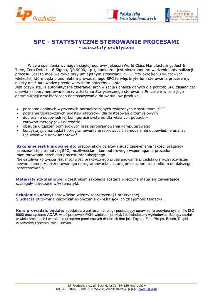 ______________________________________________________________________________________________________ SPC - STATYSTYCZNE STEROWANIE PROCESAMI - warsztaty praktyczne W celu spełnienia wymagań ciągłej poprawy jakości (World Class Manufacturing, Just In Time, Zero Defects, 6 Sigma, QS 9000, itp.), konieczne jest nieustanne prowadzenie optymalizacji procesu. Jest to moŜliwe tylko przy umiejętnym stosowaniu SPC. Przy określeniu kluczowych wielkości, które będą przedmiotem prowadzonego SPC (a więc kryterium sterowania procesem), naleŜy mieć na uwadze przede wszystkim potrzeby klienta. Jest oczywiste, iŜ automatyczne zbieranie, archiwizacja i analiza danych dla potrzeb SPC zasadniczo ułatwia eksperymentowanie przy wdraŜaniu Statystycznego sterowania Procesem w celu jego optymalizacji oraz bieŜącego dostosowywania do warunków produkcji. • • • • • poznanie ogólnych wytycznych normalizacyjnych związanych z systemami SPC poznanie teoretycznych podstaw statystyki dla zastosowań przemysłowych dobieranie odpowiedniej konfiguracji systemu dla własnych potrzeb – zarówno metody jak i narzędzia obsługa urządzeń pomiarowych oraz oprogramowania komputerowego korzystając z narzędzi i oprogramowania przeprowadzić samodzielnie odpowiednie analizy i je właściwie udokumentować Szkolenie jest kierowane do: pracowników działów i słuŜb zapewnienia jakości pragnący zapoznać się z tematyką SPC, moŜliwościami komputerowego wspomagania procedur monitorowania przebiegu procesu produkcyjnego. Niewątpliwą korzyścią jest moŜliwość praktycznego przetrenowania przedstawianych rozwiązań, pewne elementy prezentowanego oprogramowania zostaną przekazane uczestnikom do dalszego przetestowania. Materiały szkoleniowe: uczestnikom szkolenia zostaną wręczone materiały zawierające szczegóły dotyczące w/w tematyki. Szkolenie kończy: sprawdzian wiedzy teoretycznej i praktycznej. Słuchacze otrzymają certyfikat ukończenia określający ich znajomość tematyki. Kurs prowadzić będzie: specjalista z zakresu metrologii posiadający uprawnienia audytora systemów ISO 9000 oraz systemu AQAP, współpracownik PKN, wieloletni praktyk i doświadczony wykładowca. Biorący udział w wielu projektach i wdraŜaniu urządzeń pomiarowych dla takich firm jak: Toyota, Fiat, Philips, Bosch, Delphi Automotive Systems i wielu innych. ______________________________________________________________________________ LP Products s.c., ul. Beskidzka 7a, 34-120 Andrychów tel. 33 8704595, fax 33 8754298, email: [email protected], www.Lp-p.pl ______________________________________________________________________________________________________ Szczegółowy plan szkolenia: Dzień pierwszy: ⇒ Przedstawienie dokumentów źródłowych do omawianego tematu (normy, standardy) ⇒ Wprowadzenie do terminologii z zakresu statystyki matematycznej i SPC – wymagania systemów zapewnienia jakości (ISO 9001: ISO /TS16949) ⇒ Statystyka narzędziem sterowania procesem wytwarzania – obszary zastosowania, kryteria aplikacji ⇒ Statystyka narzędziem sterowania procesem wytwarzania – metodyki badań statystycznych ⇒ Narzędzia systemów SPC: • karty kontrolne: Xśr-R , Xśr-S ,Np., CUSUM i inne • histogramy, analiza Pareto-Lorenza, analizy zdolności procesu • współczynniki zdolności procesu Cp, Cpk, Pp, Ppk i inne ⇒ Dyskusja – przygotowanie do ćwiczeń praktycznych ⇒ Narzędzia systemów SPC - plany badań na podstawie AQL, LQ, procedury kontroli wyrywkowej i skokowej (PN-ISO 2859-0-3, PN-ISO 3951) Dzień drugi: ⇒ Ćwiczenia: • Zasady tworzenia stanowisk do statystycznego nadzorowania procesów wytwarzania (przykłady budowy z uwzględnieniem optymalizacji kosztów) • Tworzenie i wykorzystanie kart kontrolnych, tworzenie i wykorzystanie planów badań przy ocenie procesów masowych i wielkoseryjnych (praca zespołowa w grupach tematycznych) • Ocena procesu na podstawie współczynników zdolności procesu (praca zespołowa w grupach tematycznych) • Kompleksowe sterowanie procesami - obsługa oprogramowania (praca w symulowanych warunkach przebiegu procesu w oparciu o narzędzia systemu DIGIMATIC) • Dobór odpowiednich metod i narzędzi do indywidualnych potrzeb uczestników konfigurowanych rozwiązań) • Komputerowe wspomaganie systemów SPC – przykłady (oprogramowanie SRP- System Rejestracji Pomiarów, SNAP-Line SPC, COSMOS-SPC) • Rozwiązywanie problemów uczestników i sprawdzenie osiągnięć uczestników (zadanie testowe, zadania praktyczne- ćwiczenia) (ocena ______________________________________________________________________________ LP Products s.c., ul. Beskidzka 7a, 34-120 Andrychów tel. 33 8704595, fax 33 8754298, email: [email protected], www.Lp-p.pl