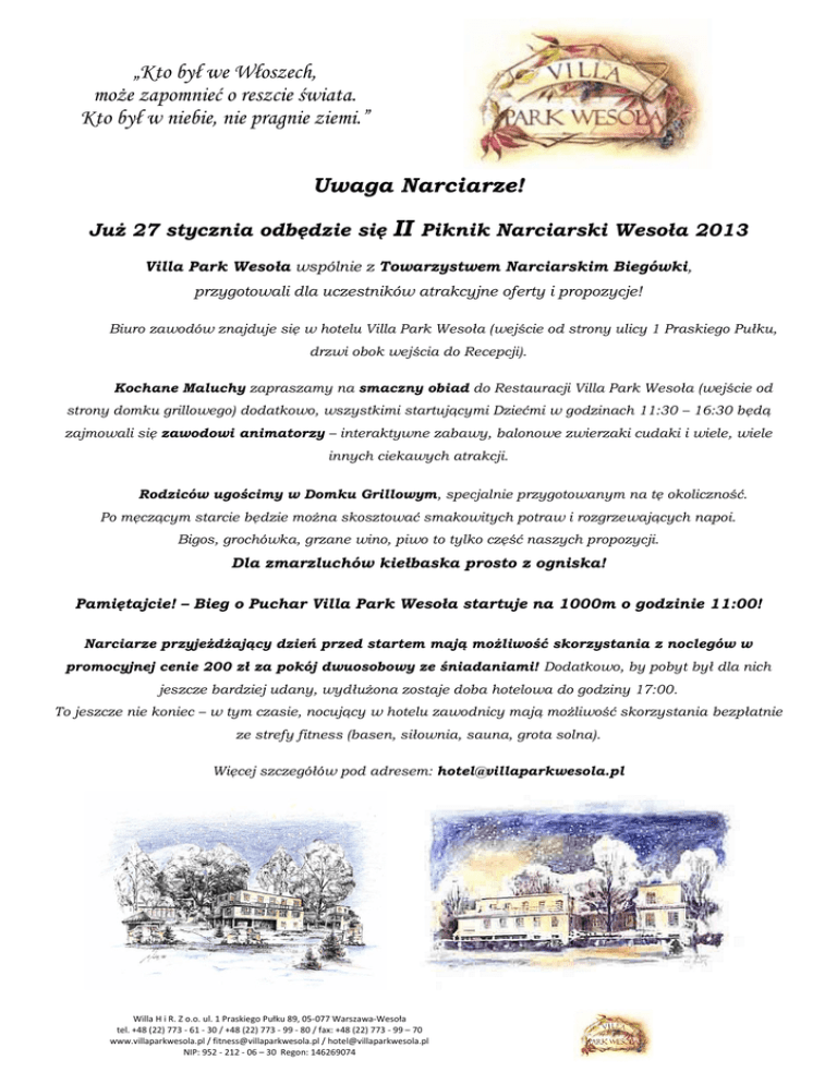 „Kto był we Włoszech, może zapomnieć o reszcie świata. Kto był w niebie, nie pragnie ziemi.” Uwaga Narciarze! Już 27 stycznia odbędzie się II Piknik Narciarski Wesoła 2013 Villa Park Wesoła wspólnie z Towarzystwem Narciarskim Biegówki, przygotowali dla uczestników atrakcyjne oferty i propozycje! Biuro zawodów znajduje się w hotelu Villa Park Wesoła (wejście od strony ulicy 1 Praskiego Pułku, drzwi obok wejścia do Recepcji). Kochane Maluchy zapraszamy na smaczny obiad do Restauracji Villa Park Wesoła (wejście od strony domku grillowego) dodatkowo, wszystkimi startującymi Dziećmi w godzinach 11:30 – 16:30 będą zajmowali się zawodowi animatorzy – interaktywne zabawy, balonowe zwierzaki cudaki i wiele, wiele innych ciekawych atrakcji. Rodziców ugościmy w Domku Grillowym, specjalnie przygotowanym na tę okoliczność. Po męczącym starcie będzie można skosztować smakowitych potraw i rozgrzewających napoi. Bigos, grochówka, grzane wino, piwo to tylko część naszych propozycji. Dla zmarzluchów kiełbaska prosto z ogniska! Pamiętajcie! – Bieg o Puchar Villa Park Wesoła startuje na 1000m o godzinie 11:00! Narciarze przyjeżdżający dzień przed startem mają możliwość skorzystania z noclegów w promocyjnej cenie 200 zł za pokój dwuosobowy ze śniadaniami! Dodatkowo, by pobyt był dla nich jeszcze bardziej udany, wydłużona zostaje doba hotelowa do godziny 17:00. To jeszcze nie koniec – w tym czasie, nocujący w hotelu zawodnicy mają możliwość skorzystania bezpłatnie ze strefy fitness (basen, siłownia, sauna, grota solna). Więcej szczegółów pod adresem: [email protected] Willa H i R. Z o.o. ul. 1 Praskiego Pułku 89, 05-077 Warszawa-Wesoła tel. +48 (22) 773 - 61 - 30 / +48 (22) 773 - 99 - 80 / fax: +48 (22) 773 - 99 – 70 www.villaparkwesola.pl / [email protected] / [email protected] NIP: 952 - 212 - 06 – 30 Regon: 146269074